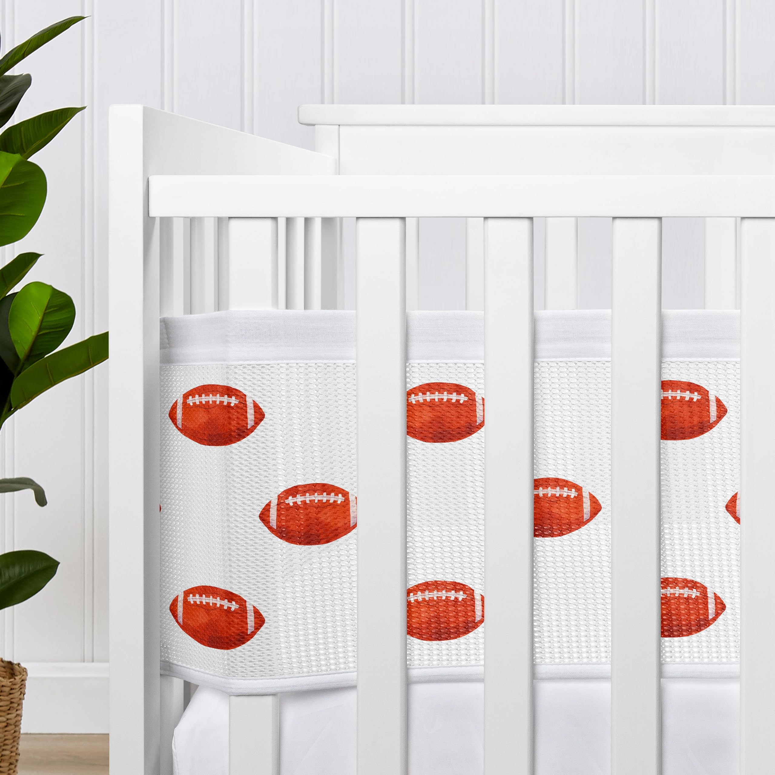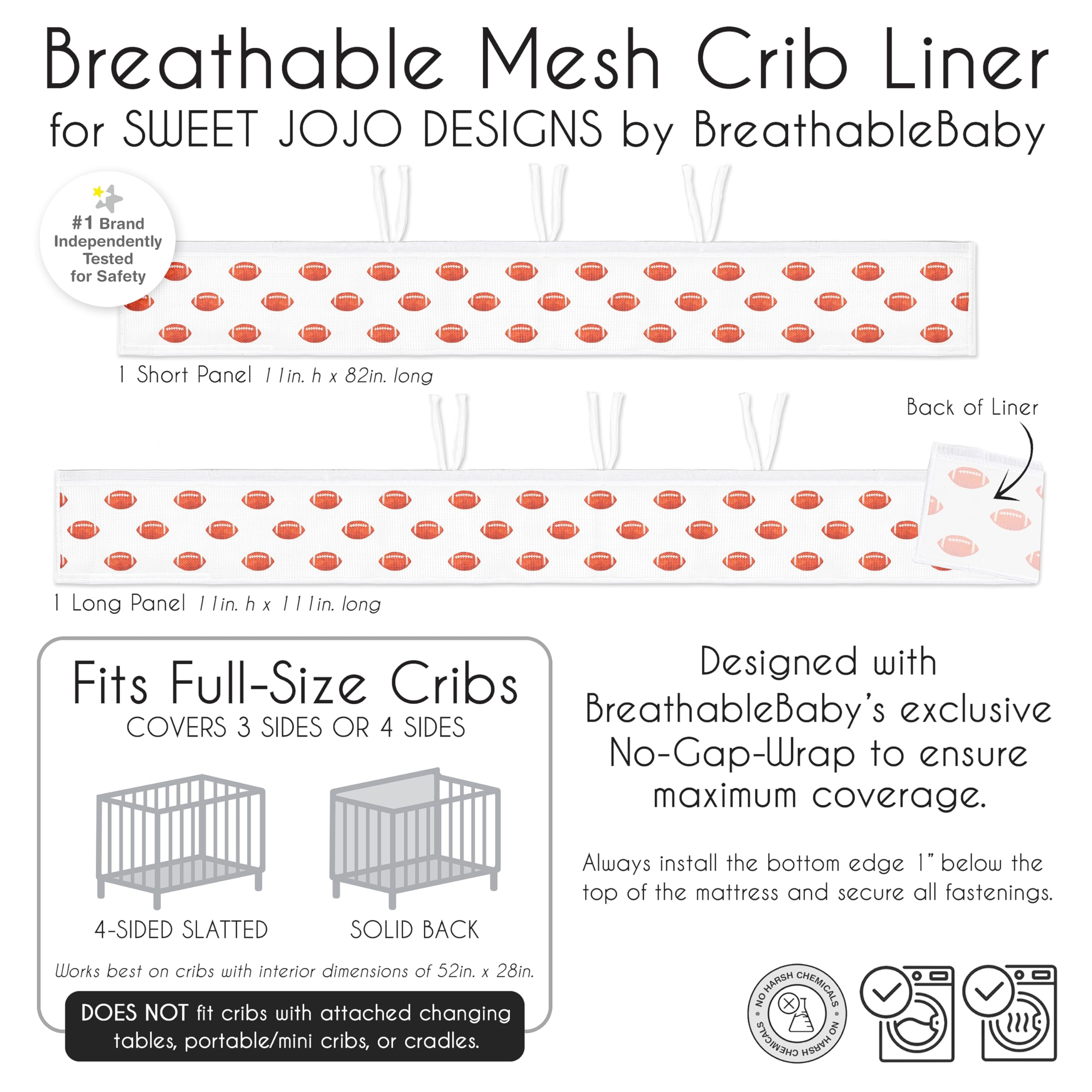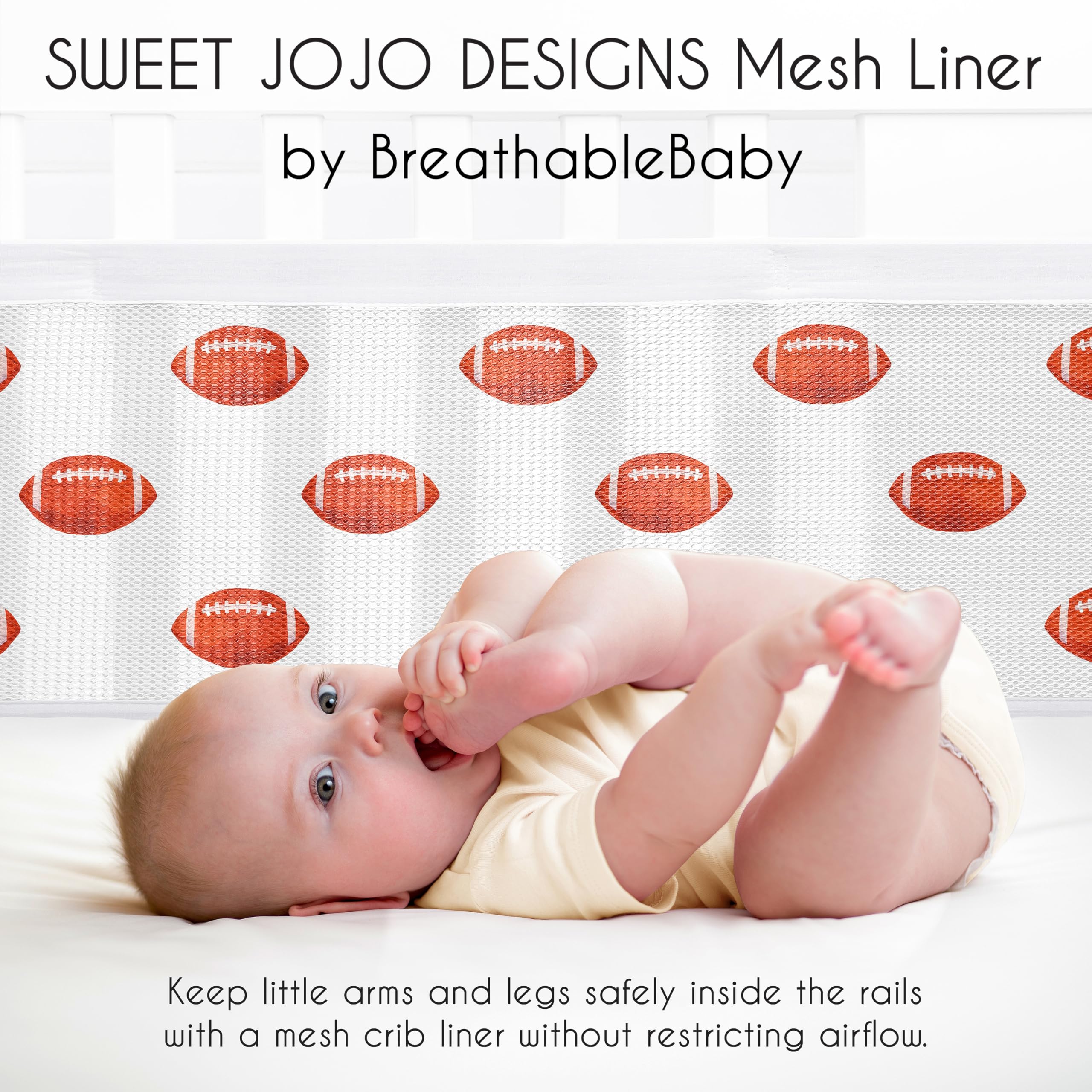 This mesh crib liner features allover footballs with complimentary color palette from the matching Sweet Jojo Designs Football bedding collection of brown and white.