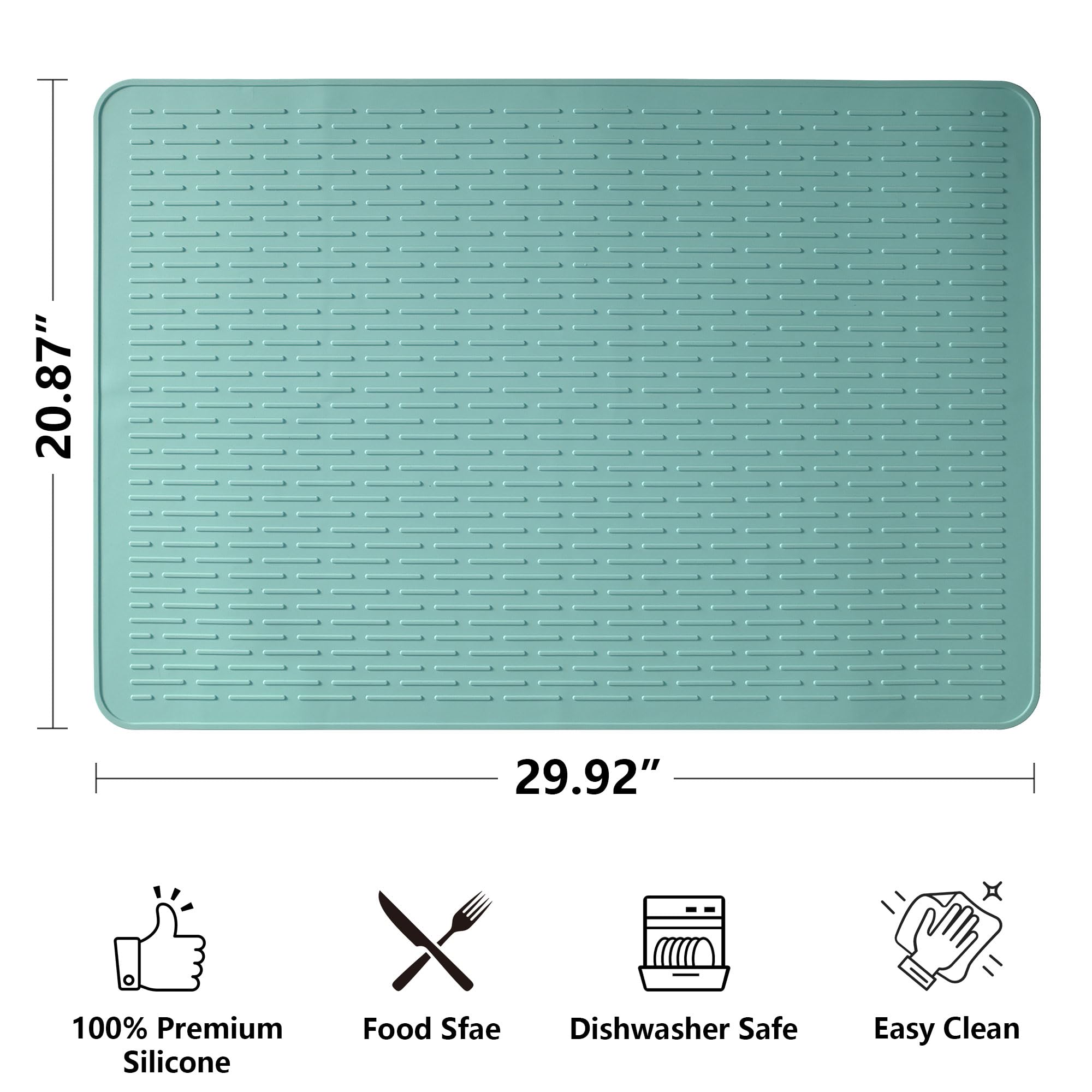 Kitchen Drying Mat:The unique design of wide raised line ridges increases air circulation, improves ventilation, and catches drips from dishes, glasses, fruits, and vegetables. The high edges and waterproof bottom keep the countertop dry and clean, making it an ideal kitchen drying mat.
