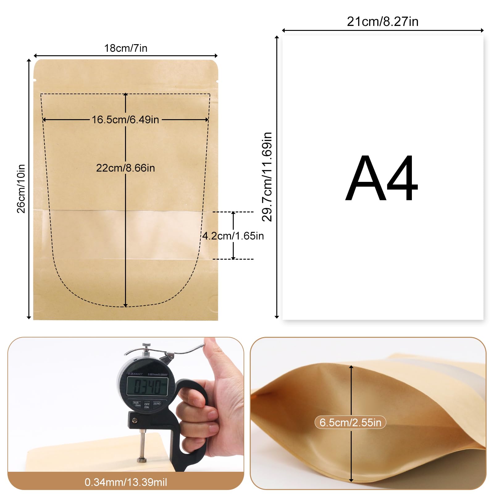 Package included: 100 kraft paper stand-up pouches of 7x10inch