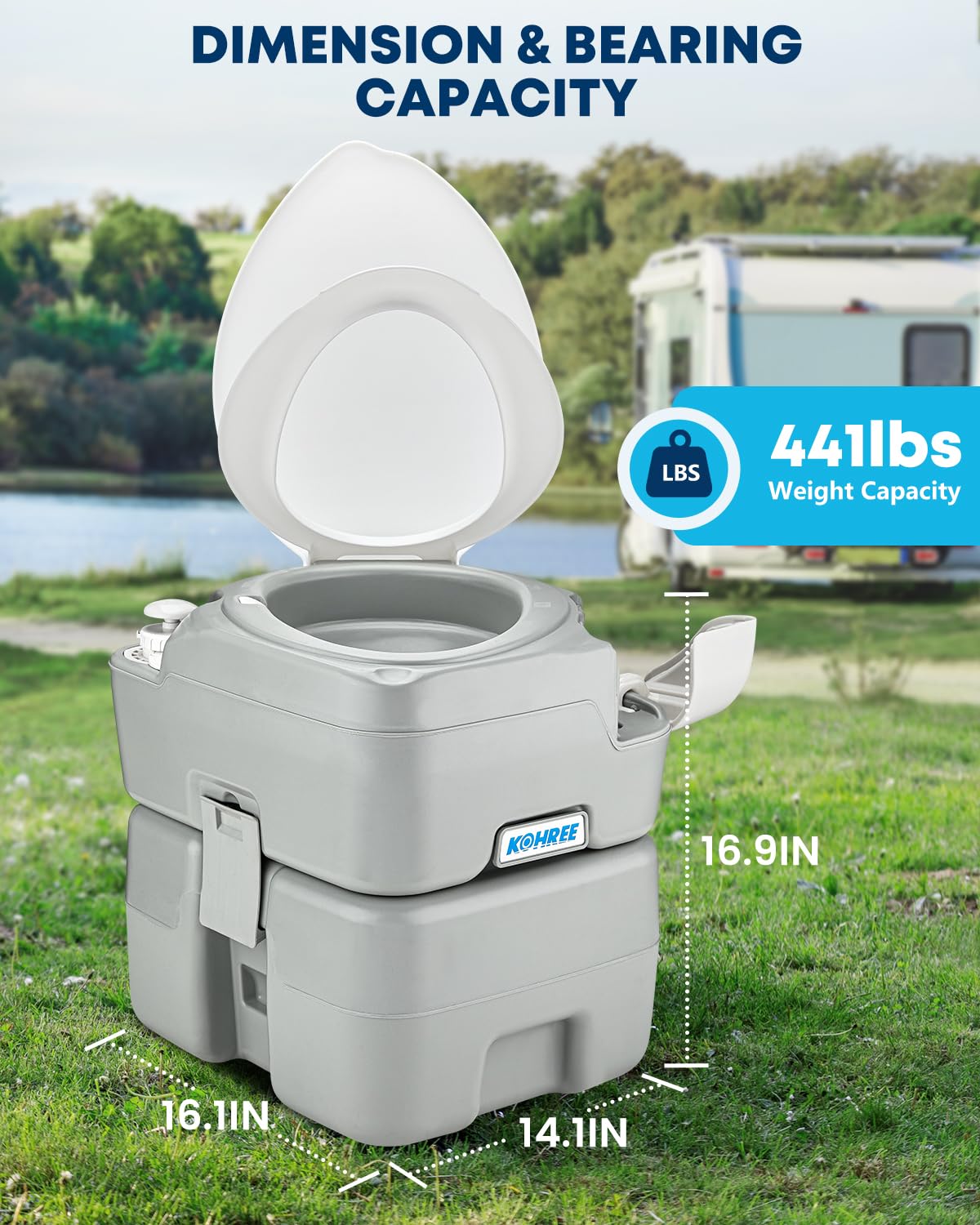 RELIABLE QUALITY & DURABLE: Crafted with premium high-density HDPE and PP materials, Kohree portable camping cassette toilet can support up to 440LB/200KG. Compact design with dimensions of 14.1 inches (L), 16.1 inches (W), and 16.9 inches (H), makes it easy to store and transport.