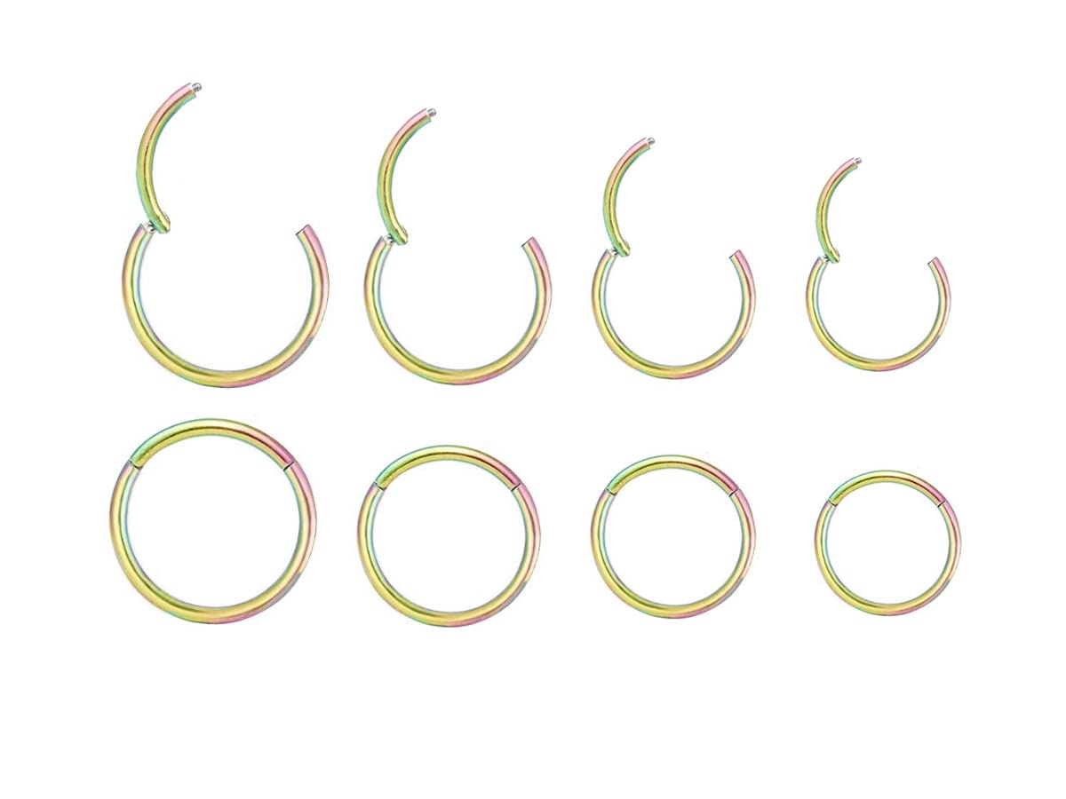 One Order Come With 4 Pairs(8Pcs) Improved Seamless Hoop Piercing With Different Sizes, Pin Gauge size:18 Gauge (1.0mm), Inner Diameter 1/4"(6mm), 5/16" (8mm), 3/8" (10mm), 1/2"(12mm).Color: Rainbow. Perfect Size for body piercings like nostril ,forward helix, helix, cartilage, tragus, anti-tragus, rook, snug, daith, second or third lobe , auricle piercings and lip nipple rings , etc other body piercing