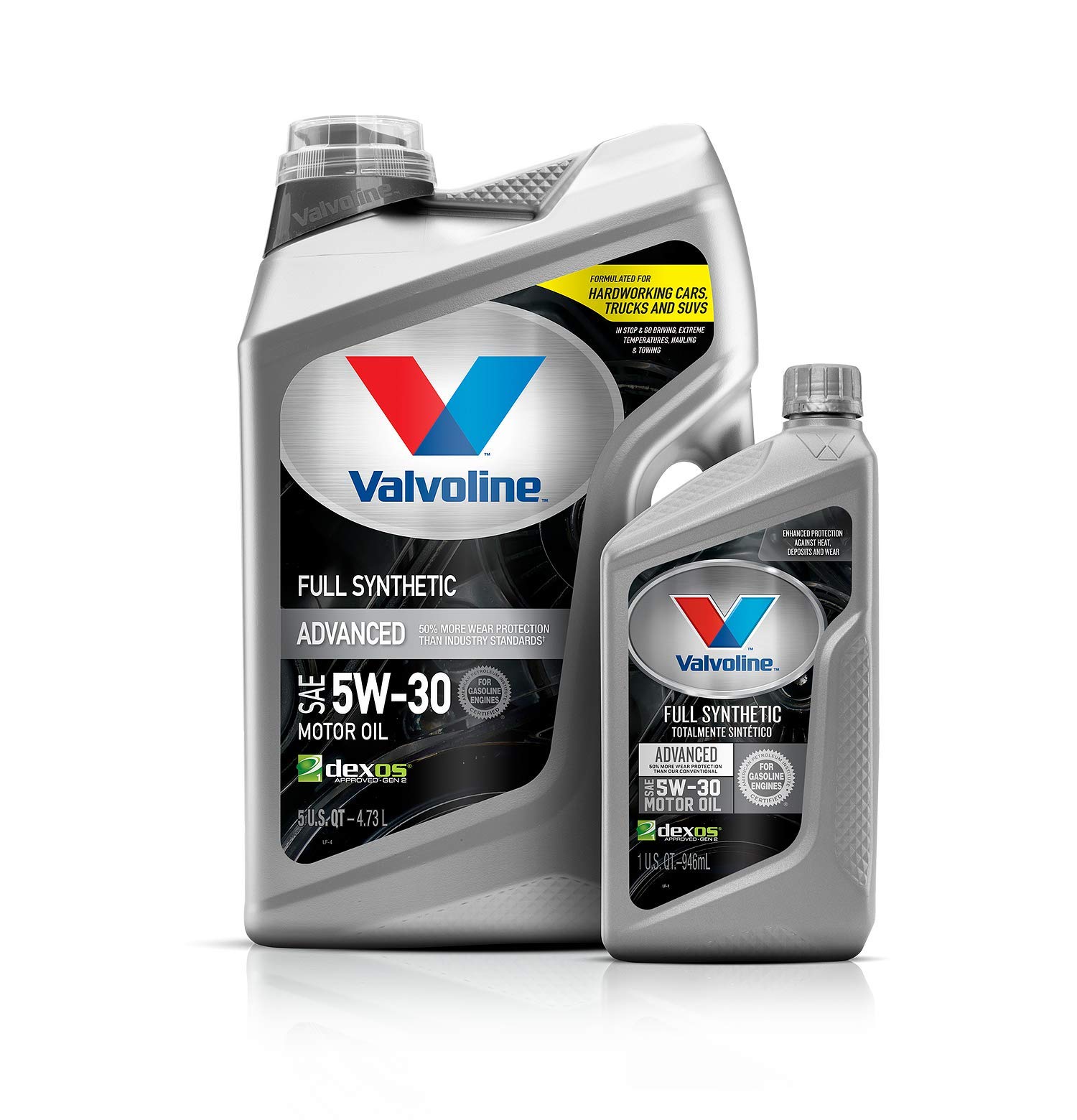 Anything a conventional motor oil can do Valvoline Advanced Full Synthetic can do better. Designed with the highest quality base oils and additives, it delivers 25% better deposit protection and 40% better protection against wear than industry standards. With less wear, you can expect stronger performance, optimal fuel efficiency, and a longer-lasting engine. Driving conditions like short trips or stop-and-go traffic are hard on a vehicle and the car’s engine oil, causing extreme heat and temperature fluctuations inside your motor that can lead to harmful sludge and extra friction. Valvoline Advanced Full Synthetic Motor Oil includes additional boosters to minimize the effects of heat. And for enhanced cold start protection, it flows easily at low temperatures. Step up to one of our best motor oils for superior performance in all types of weather and conditions. GM dexos 1 Gen3 certified and approved in SAE 0W-20 and 5W-30, Valvoline Advanced Full Synthetic Motor Oil provides 24X stronger protection against engine-killing contaminants than the leading full synthetic, keeping your motor running smooth whether it’s a Ford, Toyota, Dodge, Jeep or Honda. Valvoline Advanced Full Synthetic, from the Original Motor Oil brand trusted for more than 150 years.