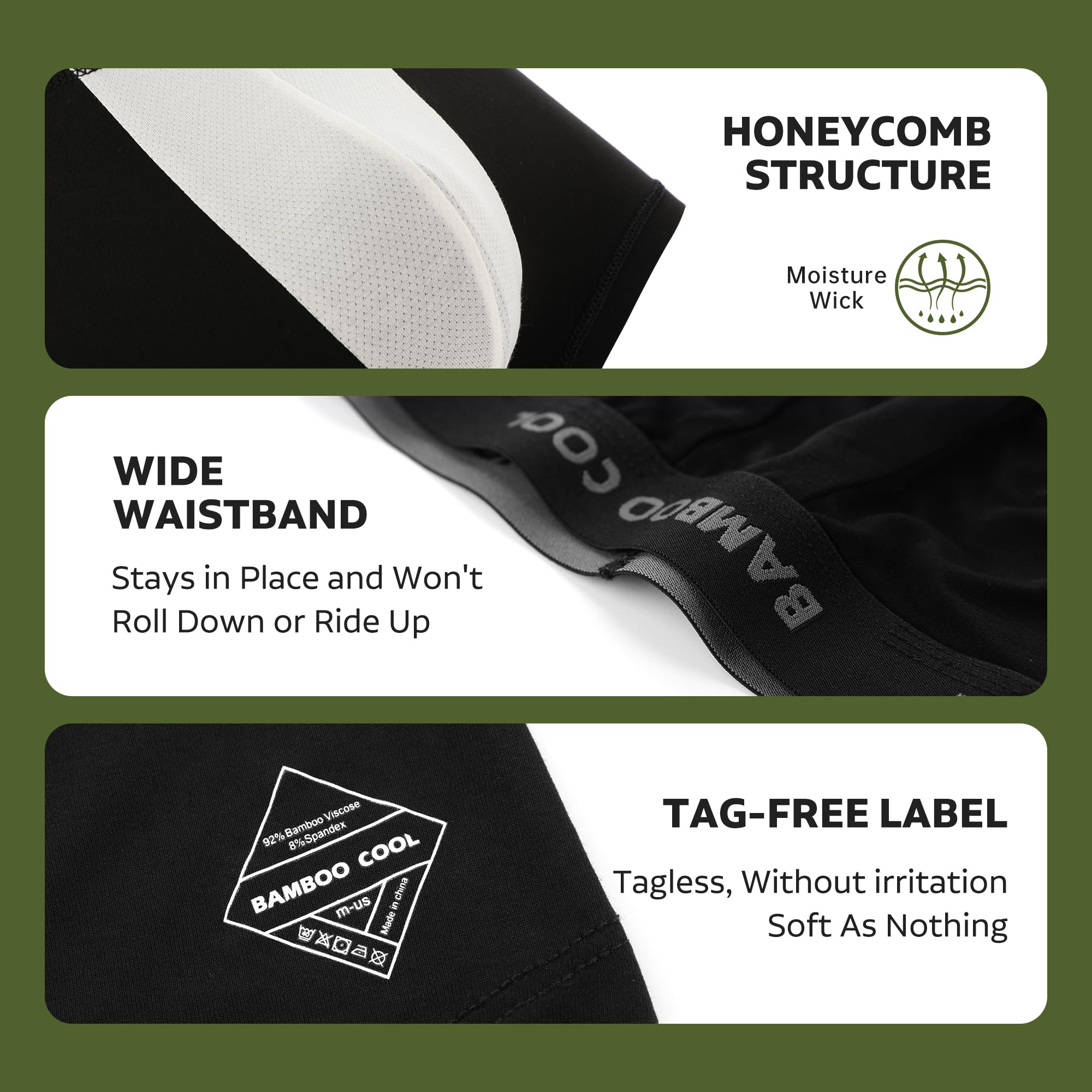 FEATURES: The inside pouch adopts a honeycomb structure, made of raw bamboo viscose material, and the non-stained white bottom crotch is comfortable, and it is dry all day