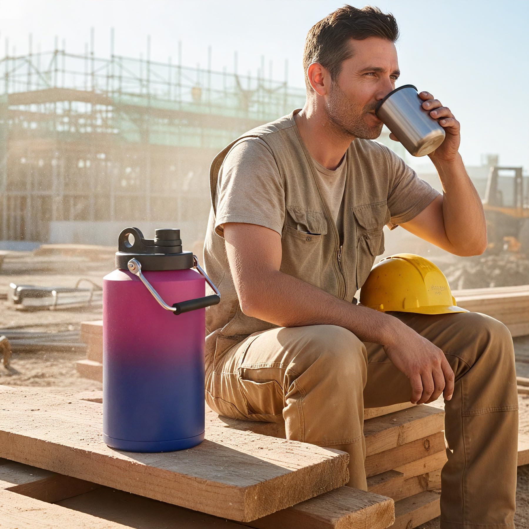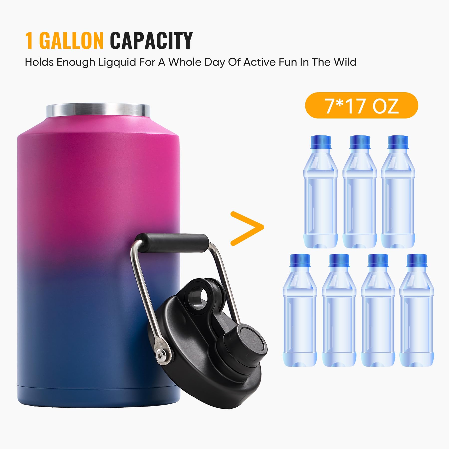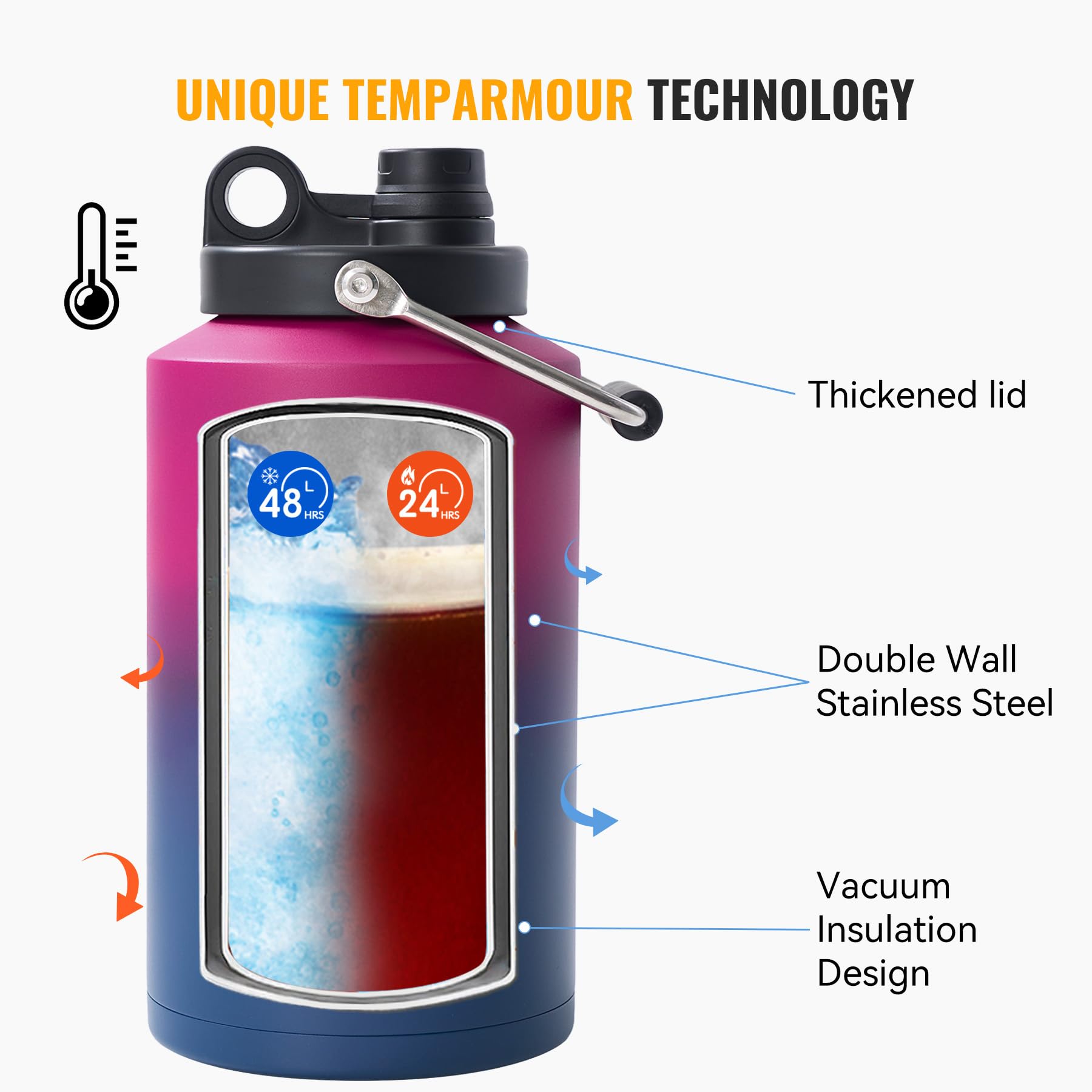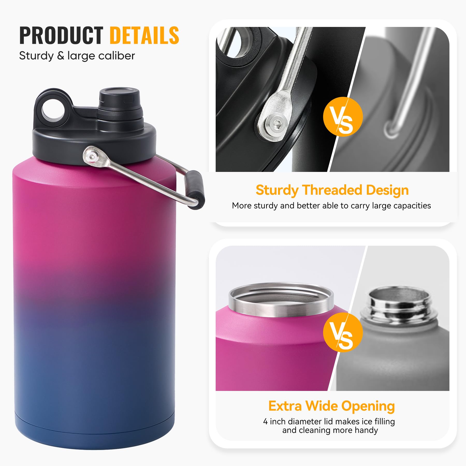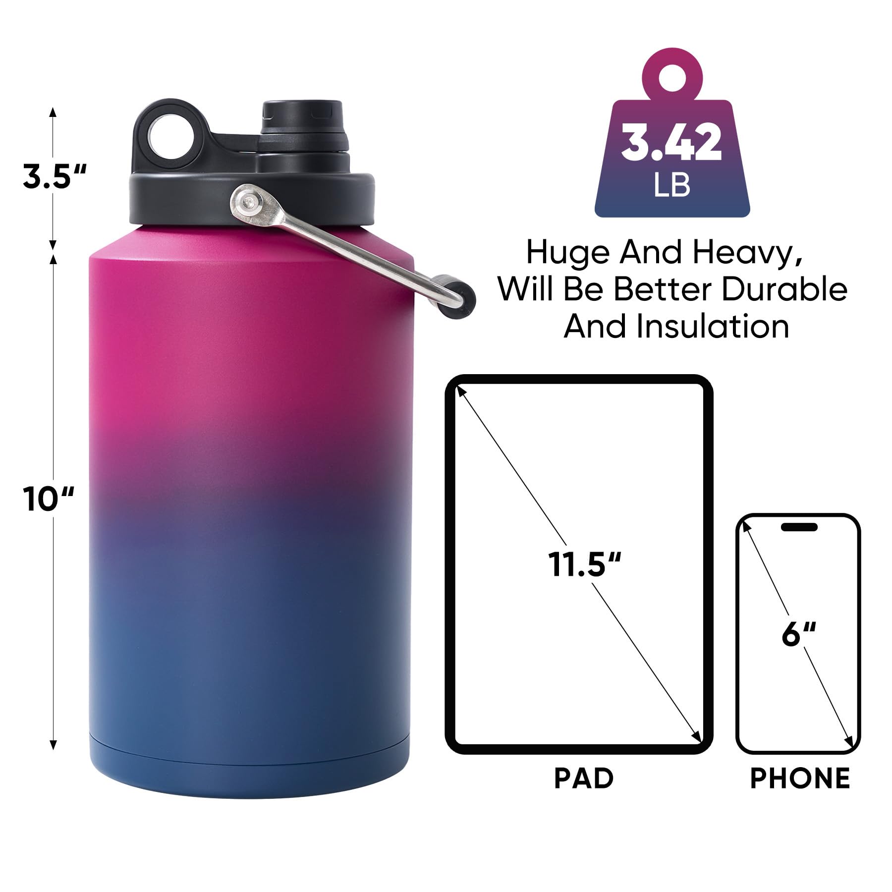 💧VACUUM INSULATED: Double layer vacuum insulated kettle, keeps the liquids icy for up to 48 hours or piping hot for up to 24 hours.This gallon water bottle is made of Powder-coat sweat-free technology, bottle grabbing becomes easy in time after strenuous exercise.