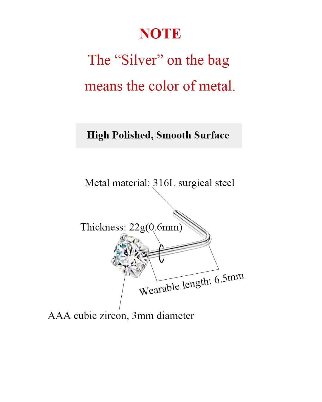This basic L shaped nose rings for women measurement: 6.5mm wearable length and prong set cubic zirconia measures 3mm in diameter. The wire thickness measures 22 gauge (0.6mm).