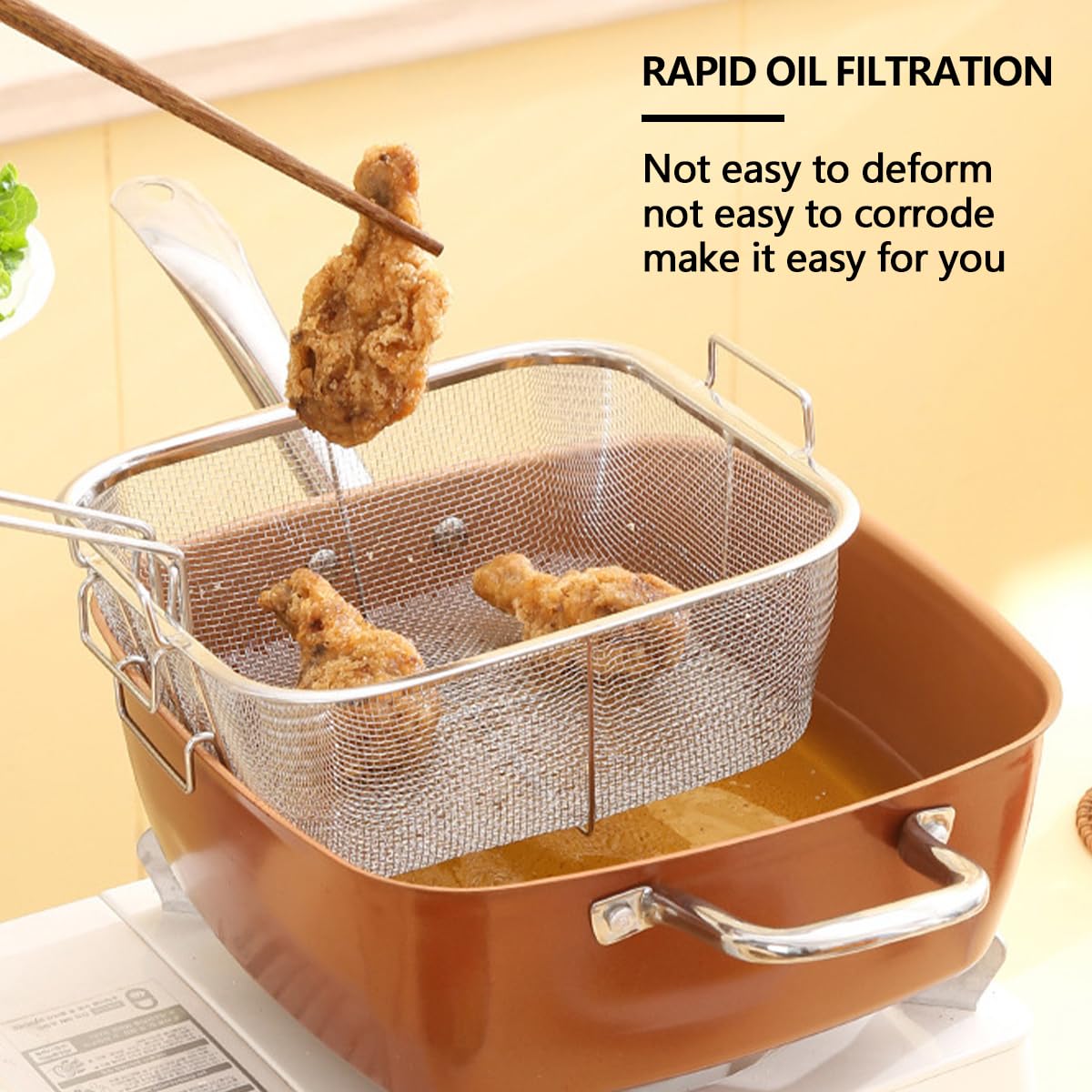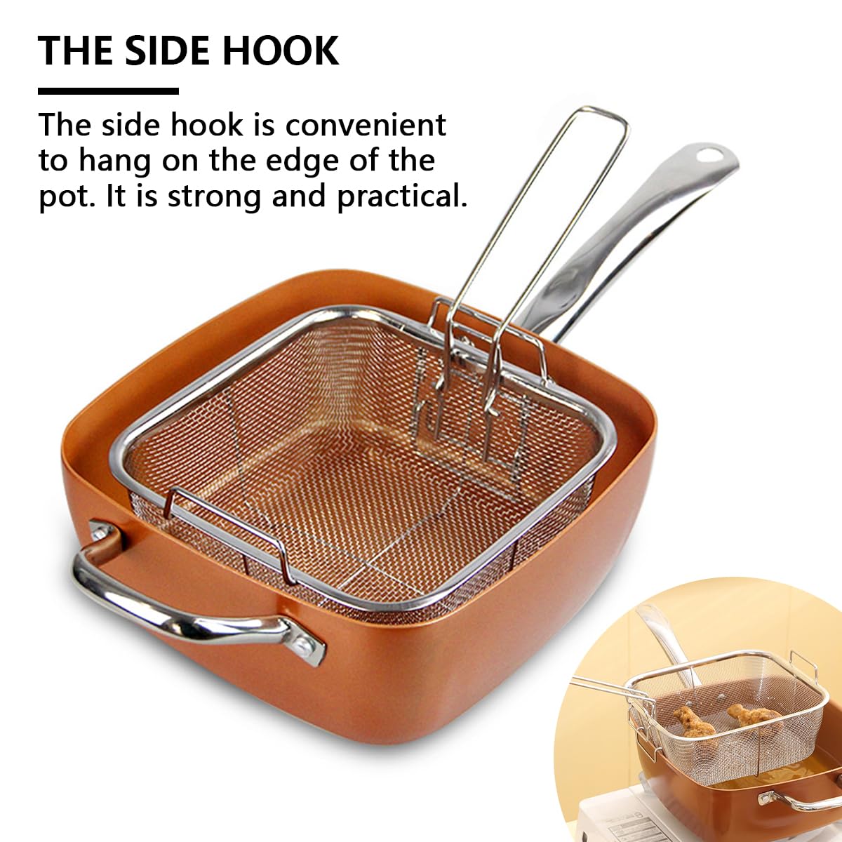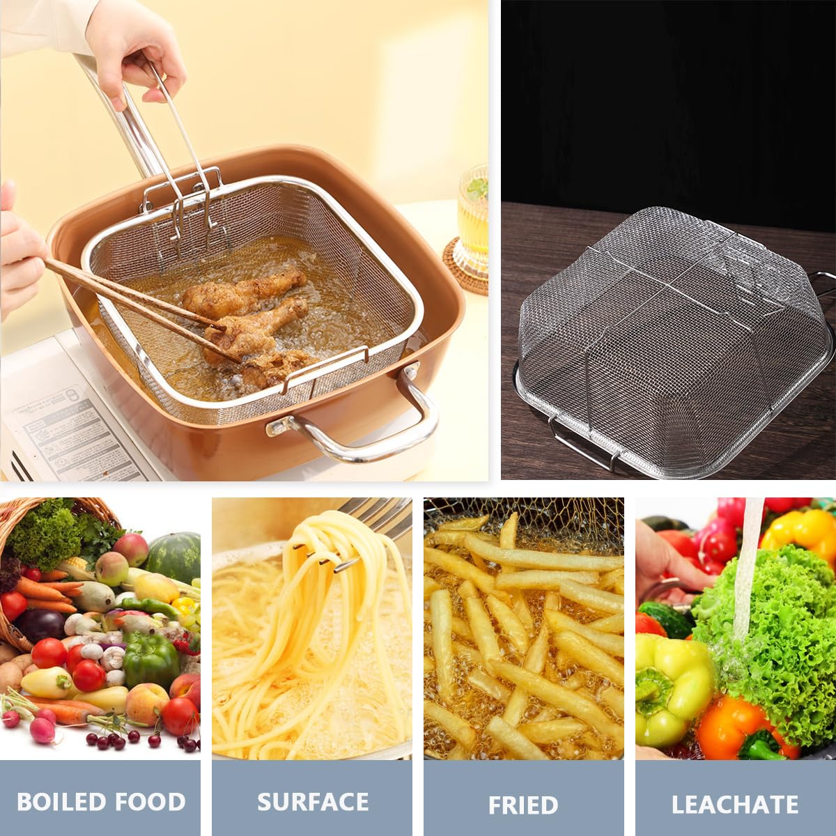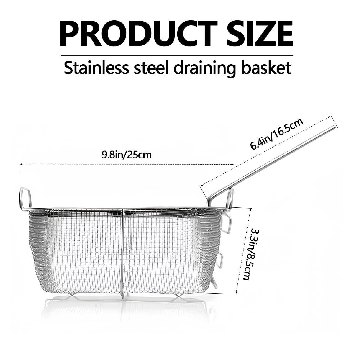 Multifunctional Drainer Basket: this versatile basket is not just for frying. It can also be used as a colander to clean vegetables and fruits or to drain water from boiled food. The long handle protects your hands from hot oil and hot water steam, and it can be hung in the pan for convenience.