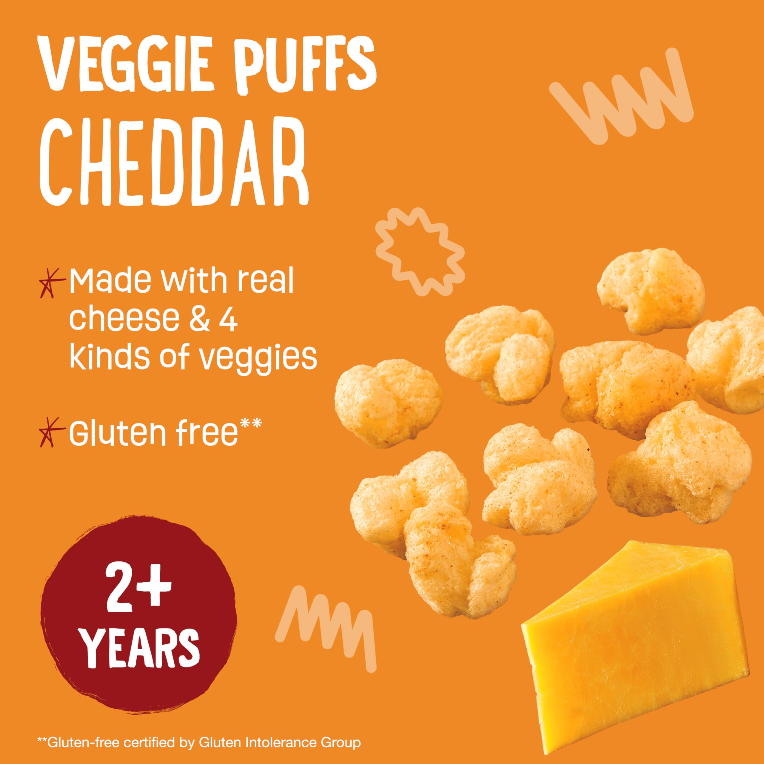 Super Snack: Your little one can enjoy munching on our Cheddar Veggie Puffs at home or on the go. These tasty puffs are perfect for throwing in lunch bags to take to daycare or preschool or enjoying with cheese and veggie slices at home