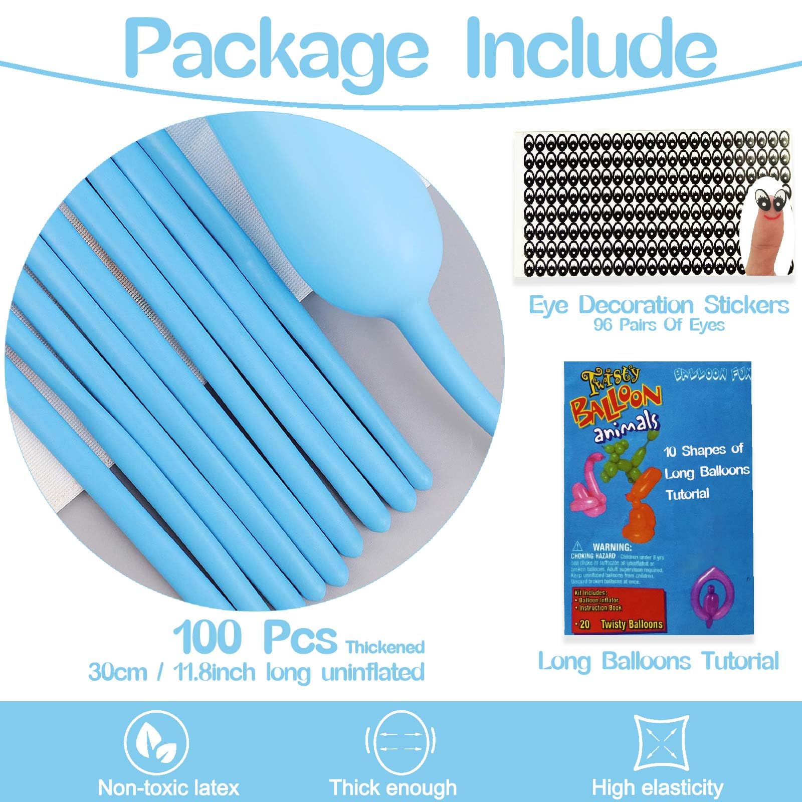 What you get: Pack of 100 Light Blue long balloons, 30cm long uninflated, up to 150cm after inflation, each balloon has undergone rigorous testing to reduce the defect rate as much as possible