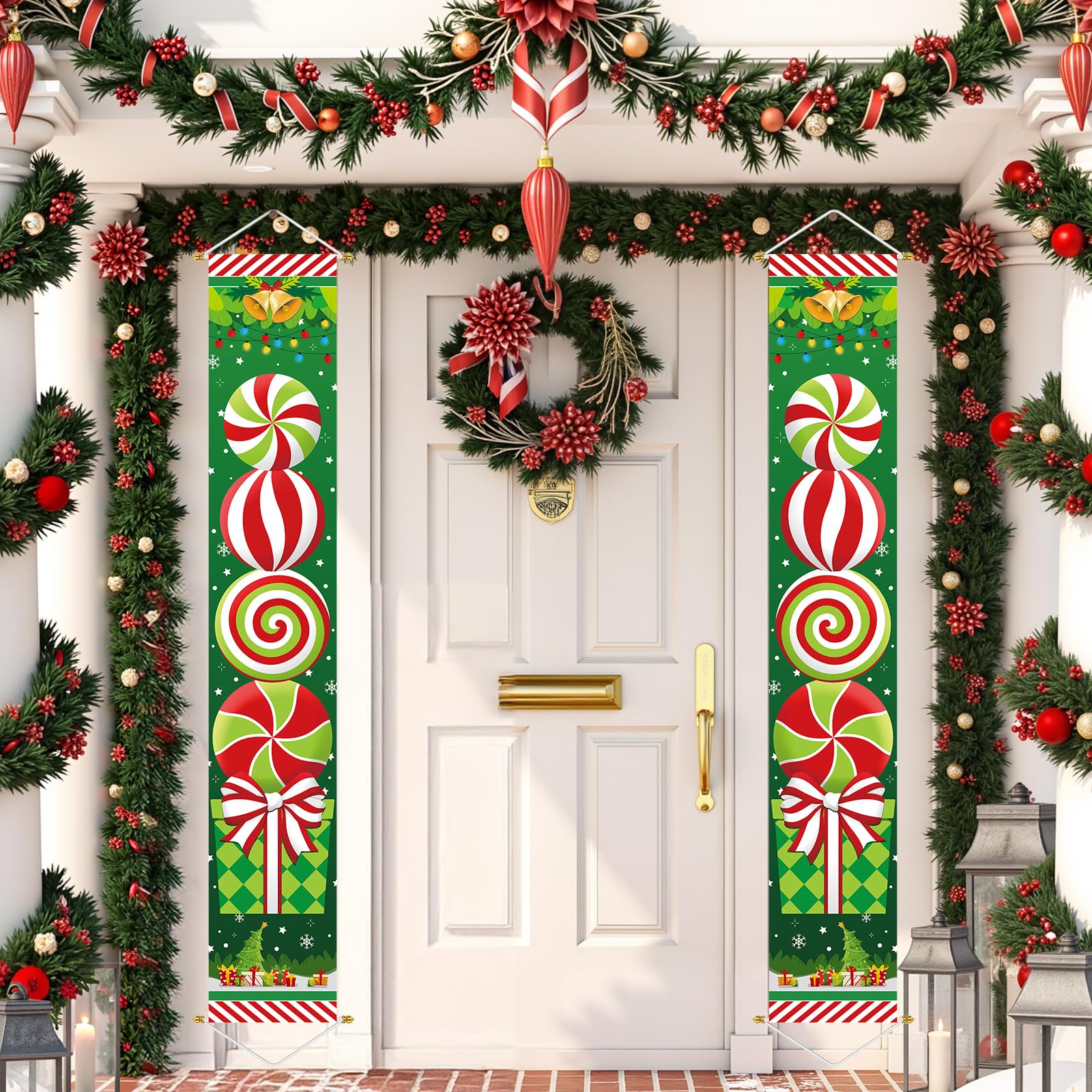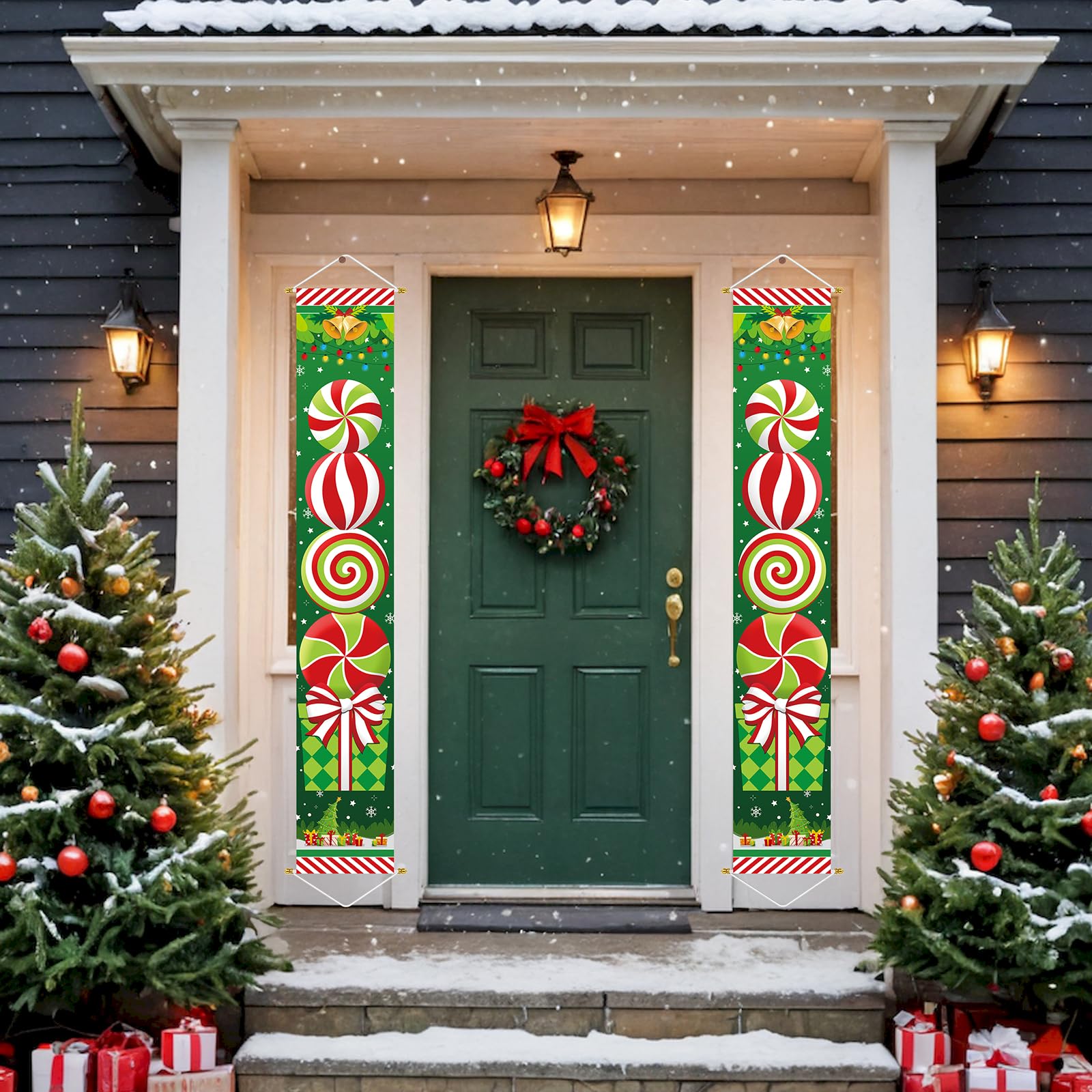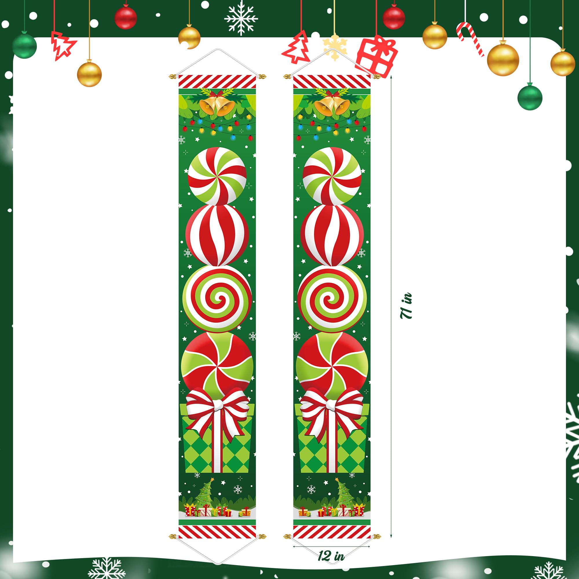PACKAGE INCLUDES: 2 extra large peppermint lollipop Christmas candy front porch door banners. Both in the size of 71" x 13" (L x W). The candys are large enough to be seen from far away. Good size as yard Christmas decorations outdoor.