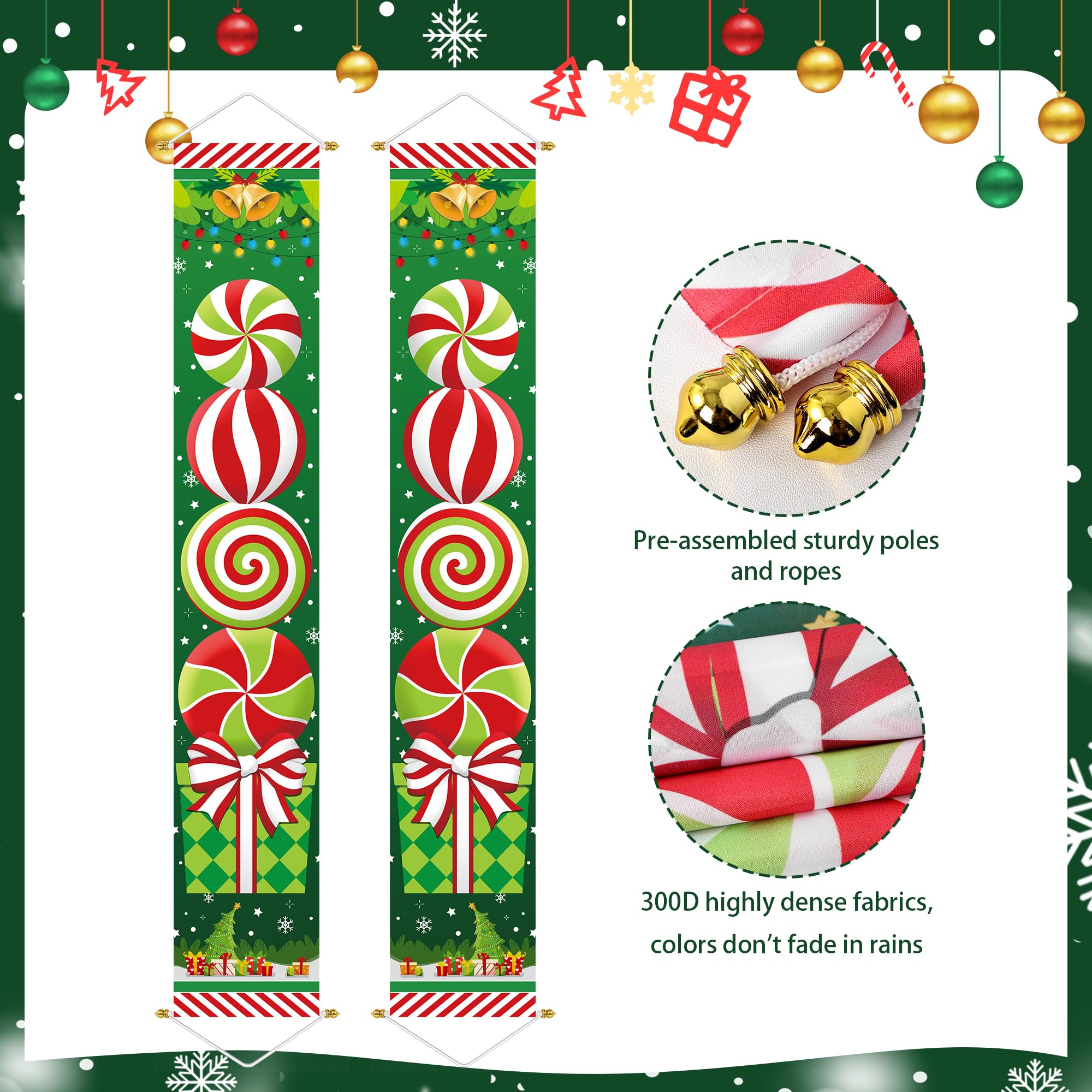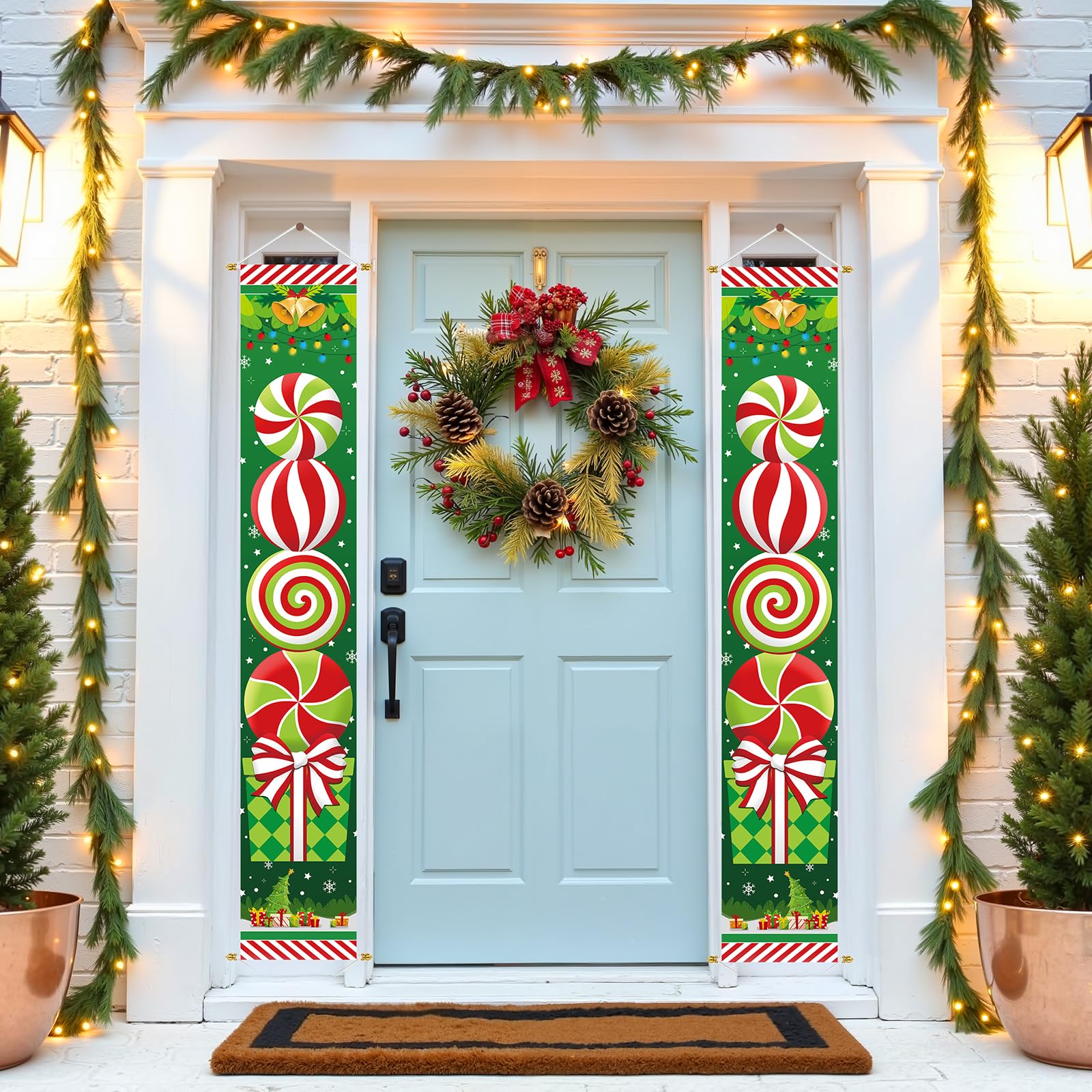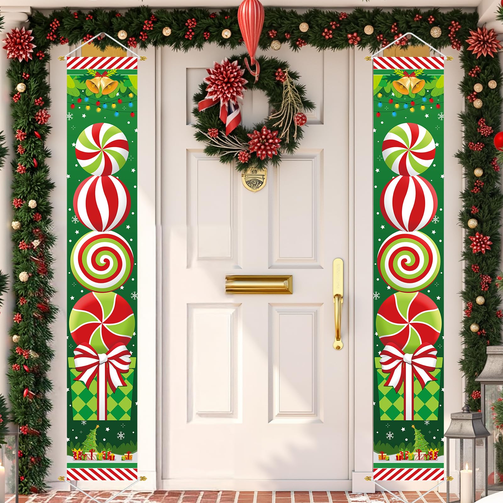 PACKAGE INCLUDES: 2 extra large peppermint lollipop Christmas candy front porch door banners. Both in the size of 71" x 13" (L x W). The candys are large enough to be seen from far away. Good size as yard Christmas decorations outdoor.