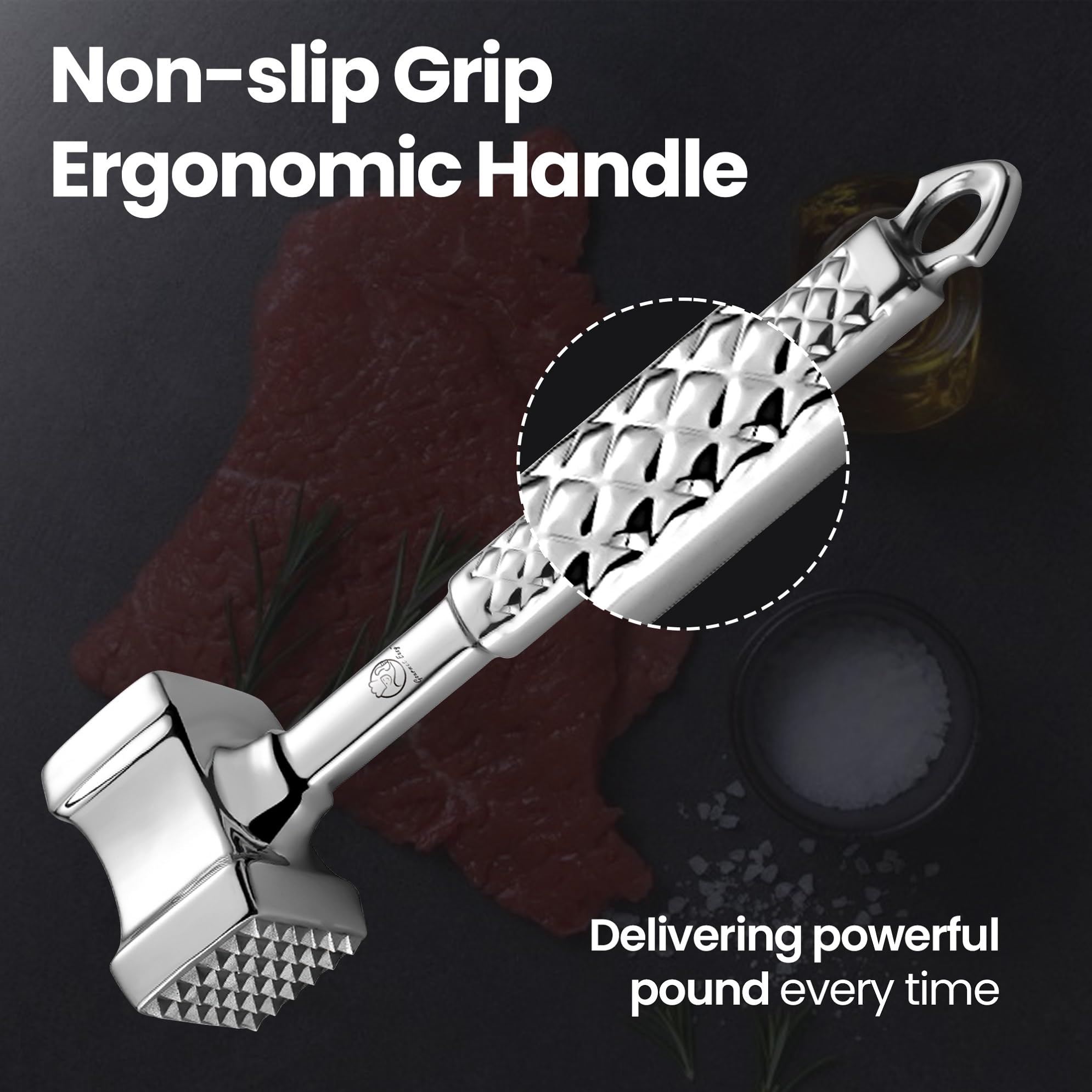 EFFORTLESS MEAT TENDERIZING & FLATTENING: Say goodbye to tough meats! Our stainless steel meat pounder features a dual-sided design: the flat side ensures even pounding for chicken cutlets, while the textured side effectively softens steak and other meats.