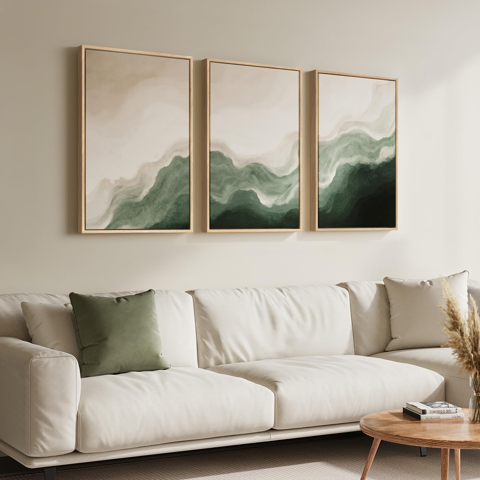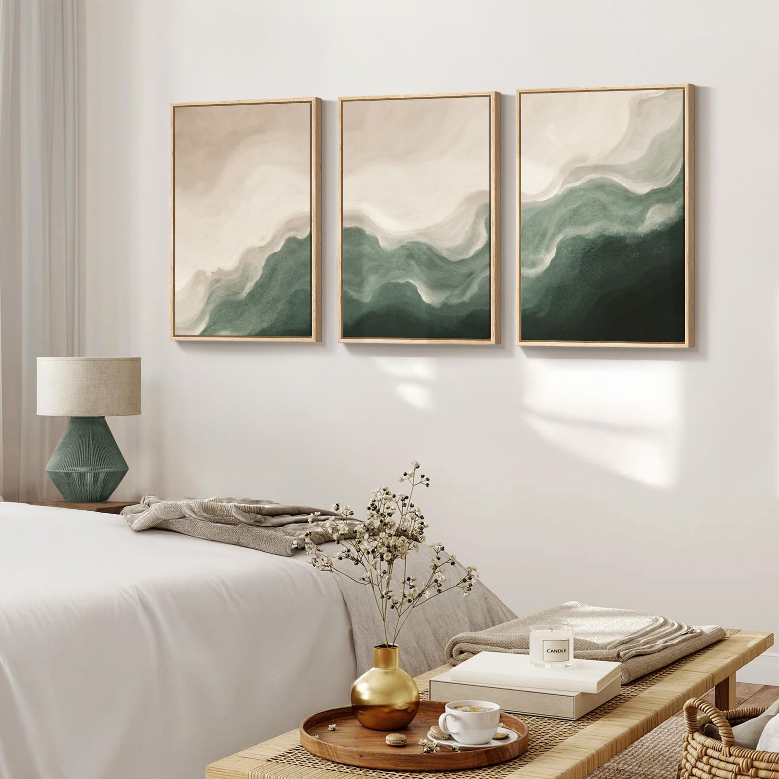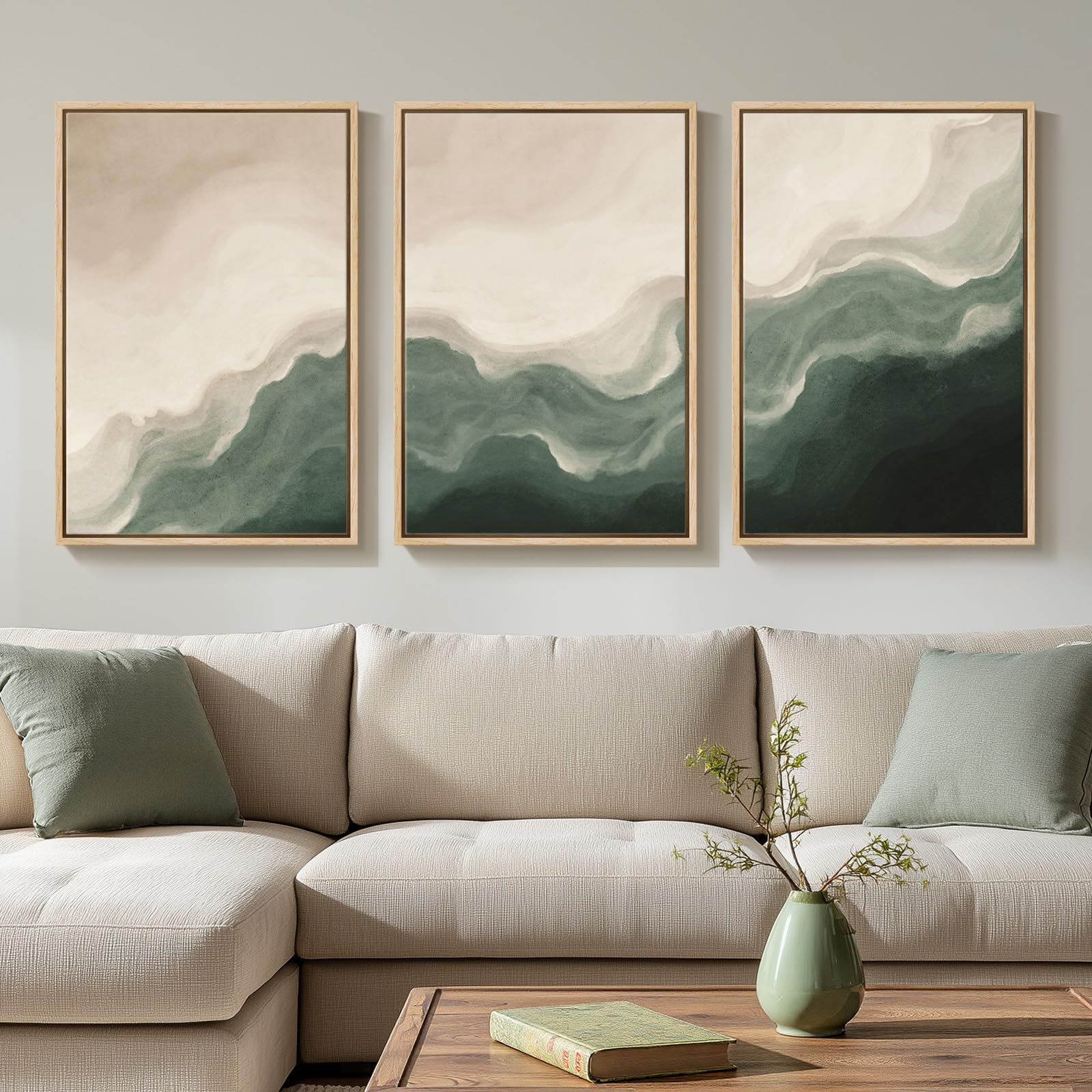 [Abstract Wall Art]: This set of 3 piece abstract wall art showcases soothing green and beige tones with soft flowing layers that evoke a sense of nature and tranquility. The minimalist design paired with its organic wave-like patterns creates a balanced and calming atmosphere, making it an elegant focal point for any interior. Ideal for enhancing your small living room, lounge, bedroom, dining room, hallway, or office, this artwork brings a touch of modern serenity and refined style to your home or workspace
