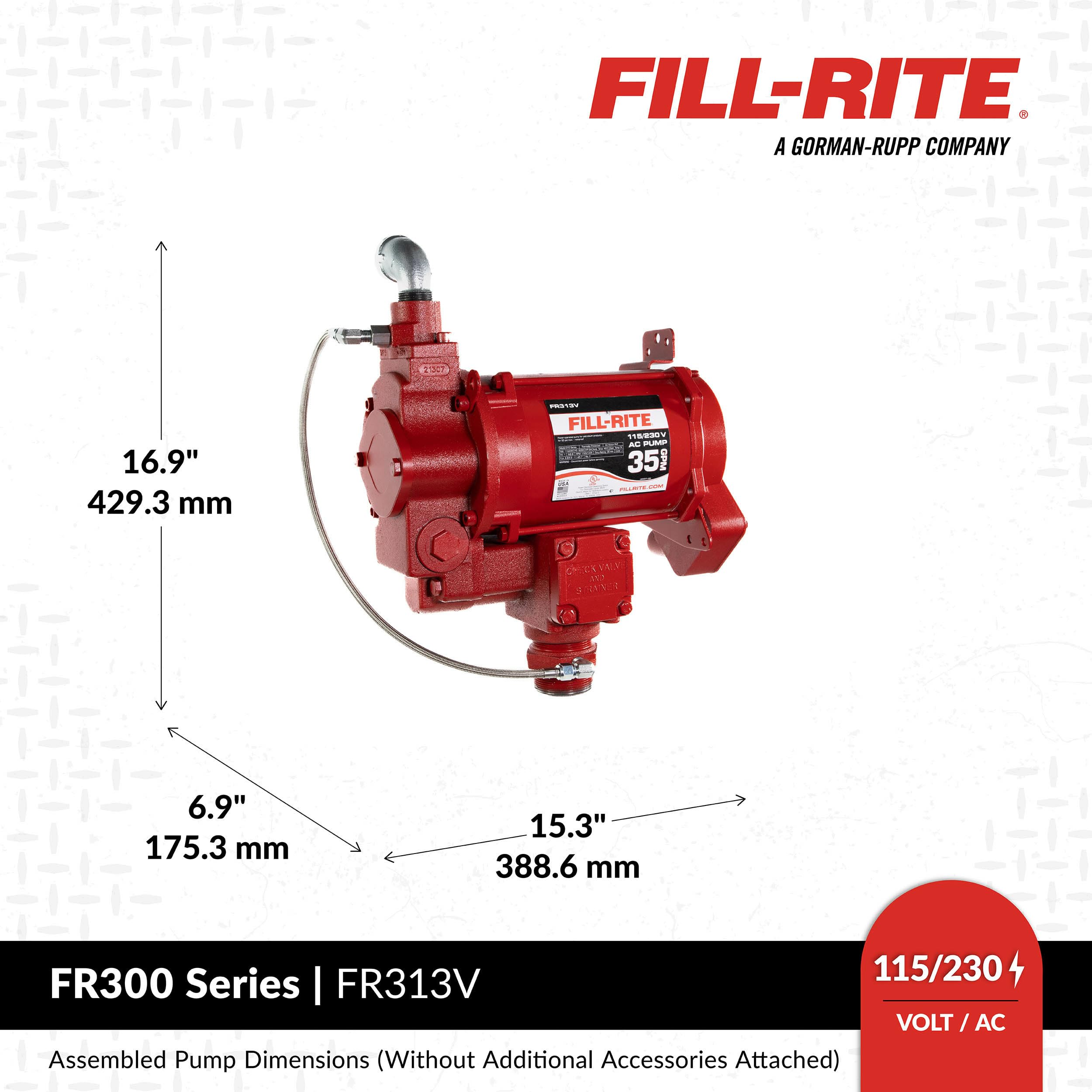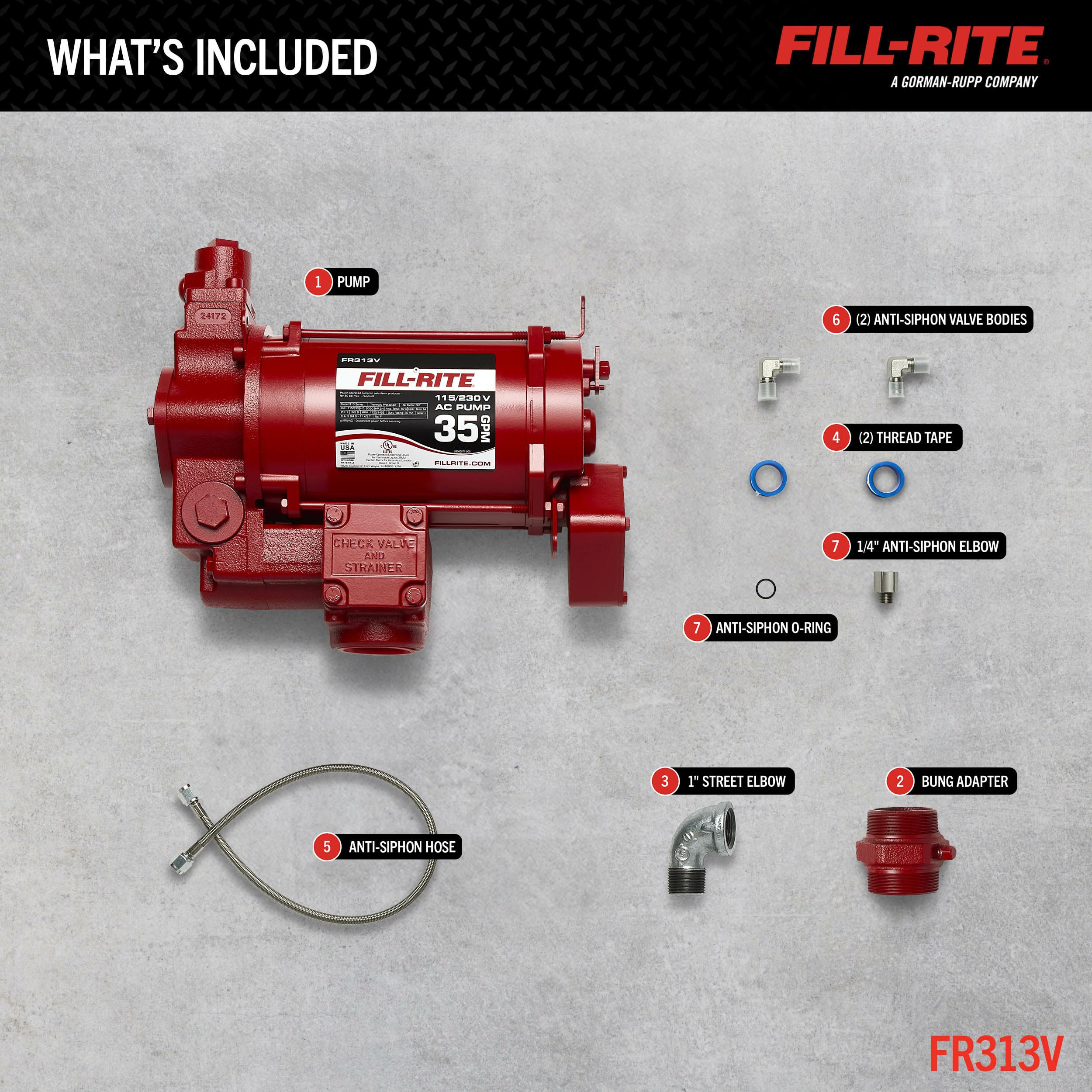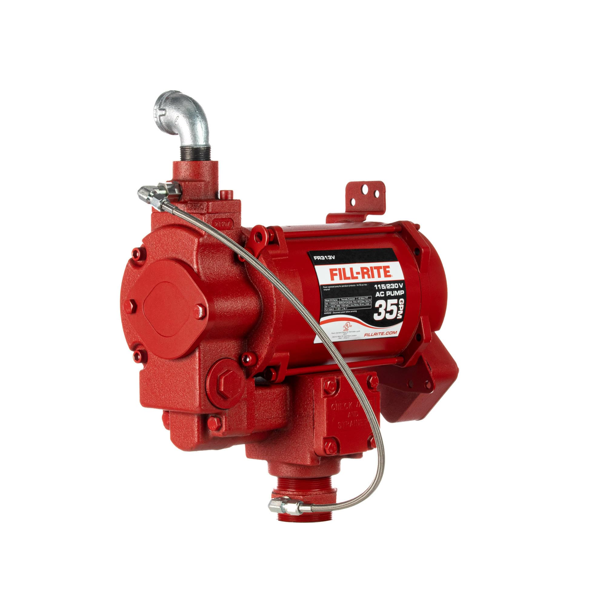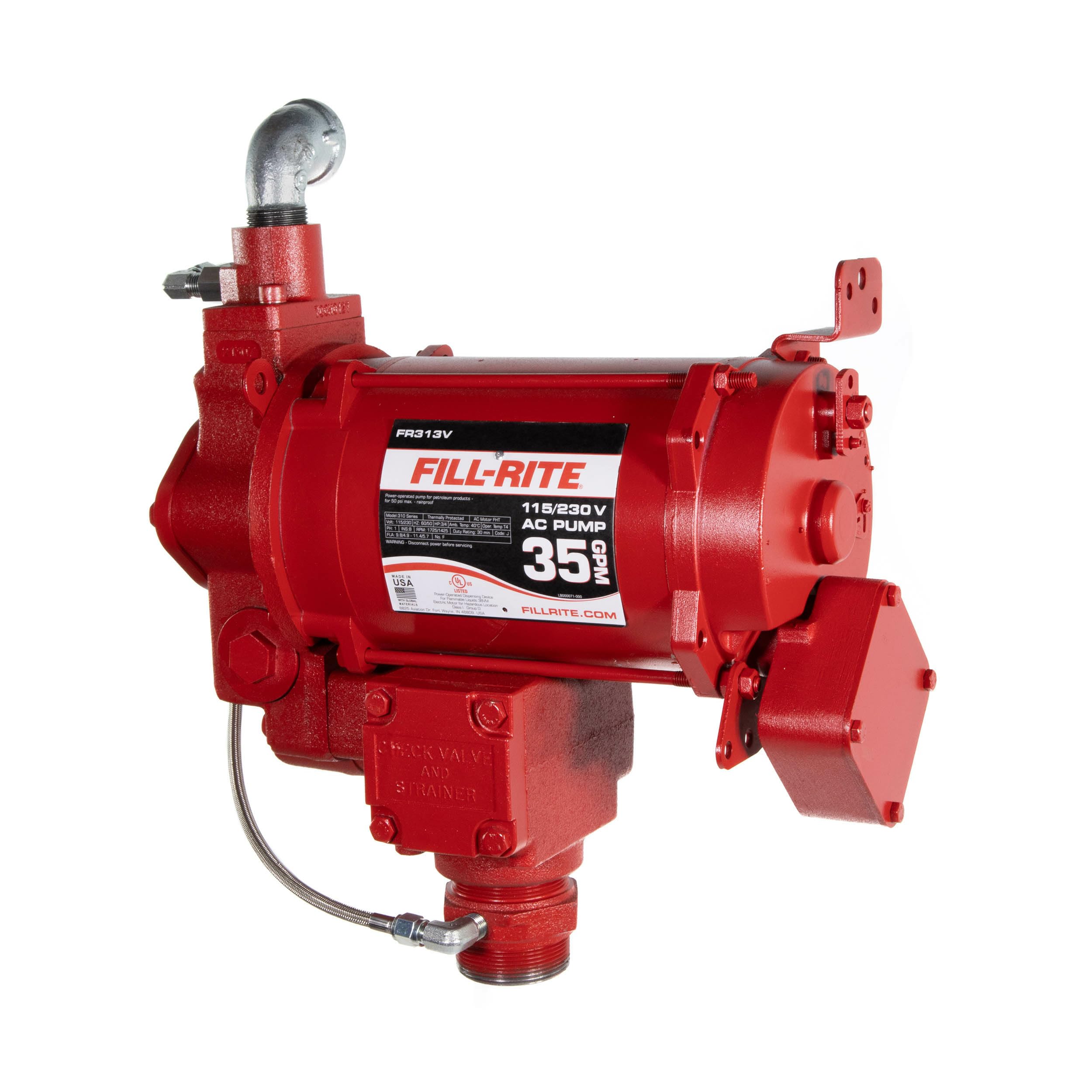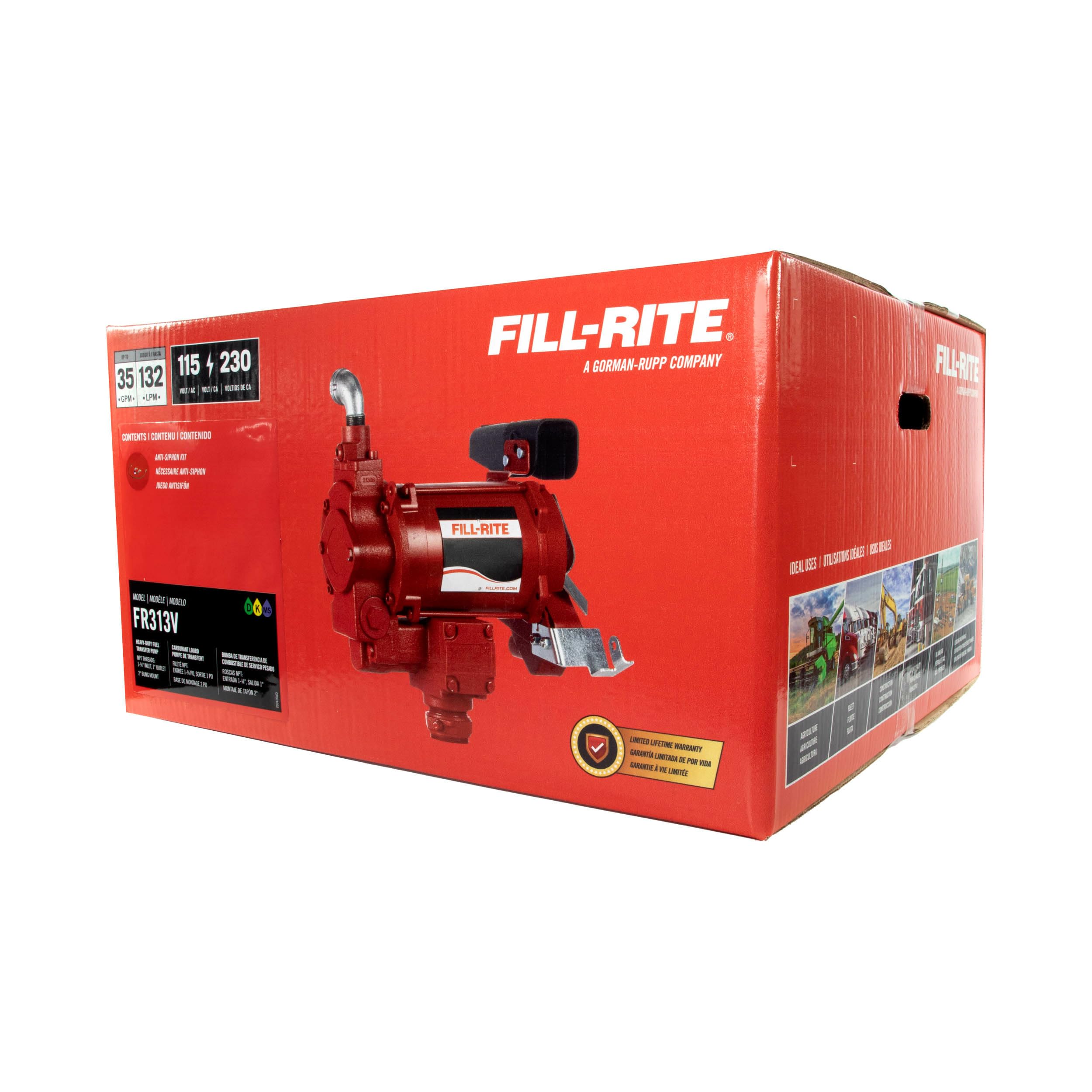 The FR313V is a 115V/230V 35 GPM fuel transfer pump that comes with an anti-siphon kit, 1" street elbow, and 2 rolls of PTFE tape. It can be used to pump diesel, kerosene, ethanol blends up to 15%, methanol blends up to 15%, and biodiesel up to B20. Each fuel transfer pump utilizes Rotary Vane Technology that helps maintain consistent flow performance over the life of the pump. Built to last, with durable cast-iron construction this product will stand the test of time in the toughest environments.