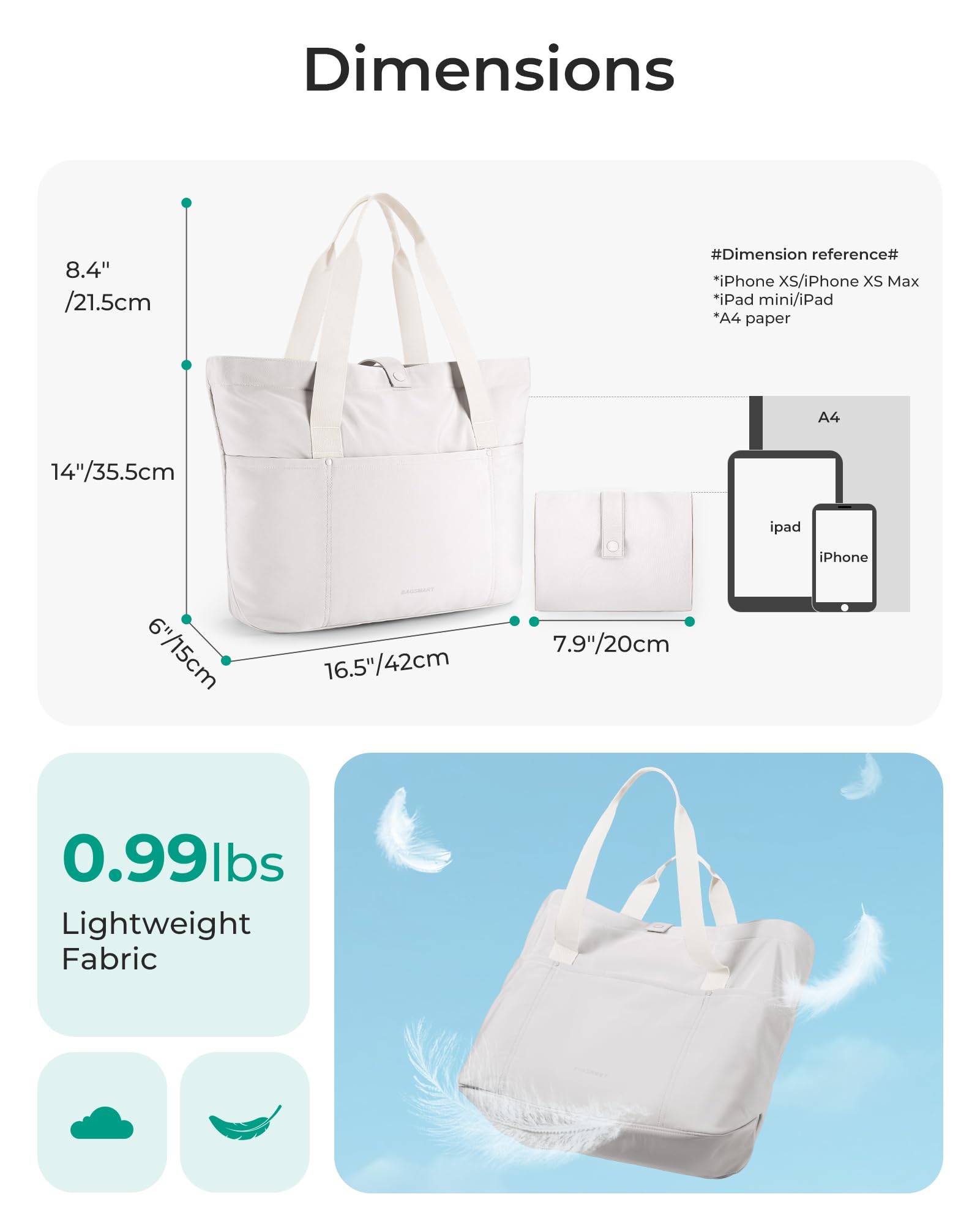 Large Size and Foldable-Unfolded: 16.5''L x 6''Wx 14''H, Folded: 7.9'' x 7''; This large tote bag has a huge capacity and can hold A4 books and 15.6-inch laptops. The travel tote bag can be folded into a small pouch, easy to put into your backpack, travel bag, duffle bag or suitcase, save your space.