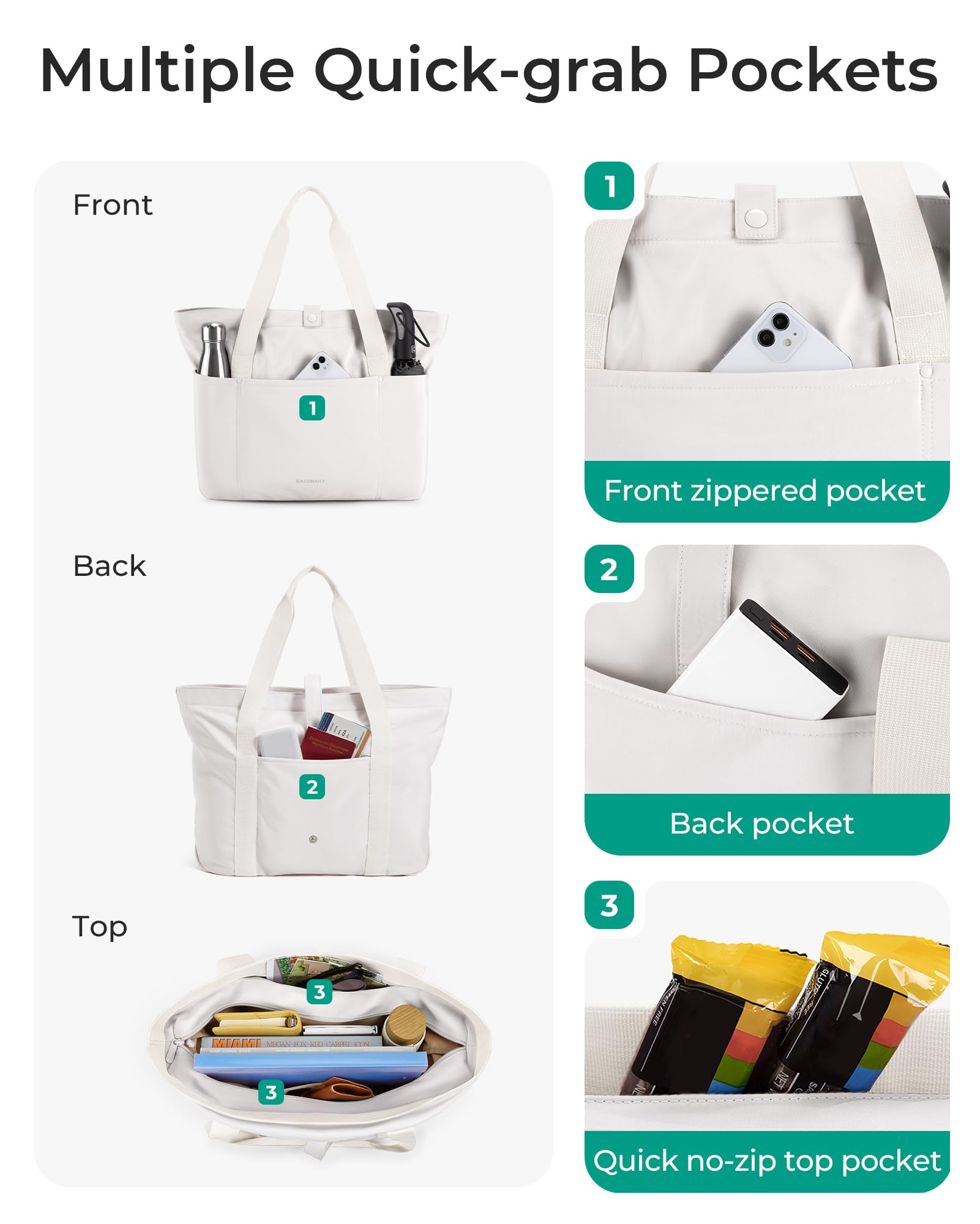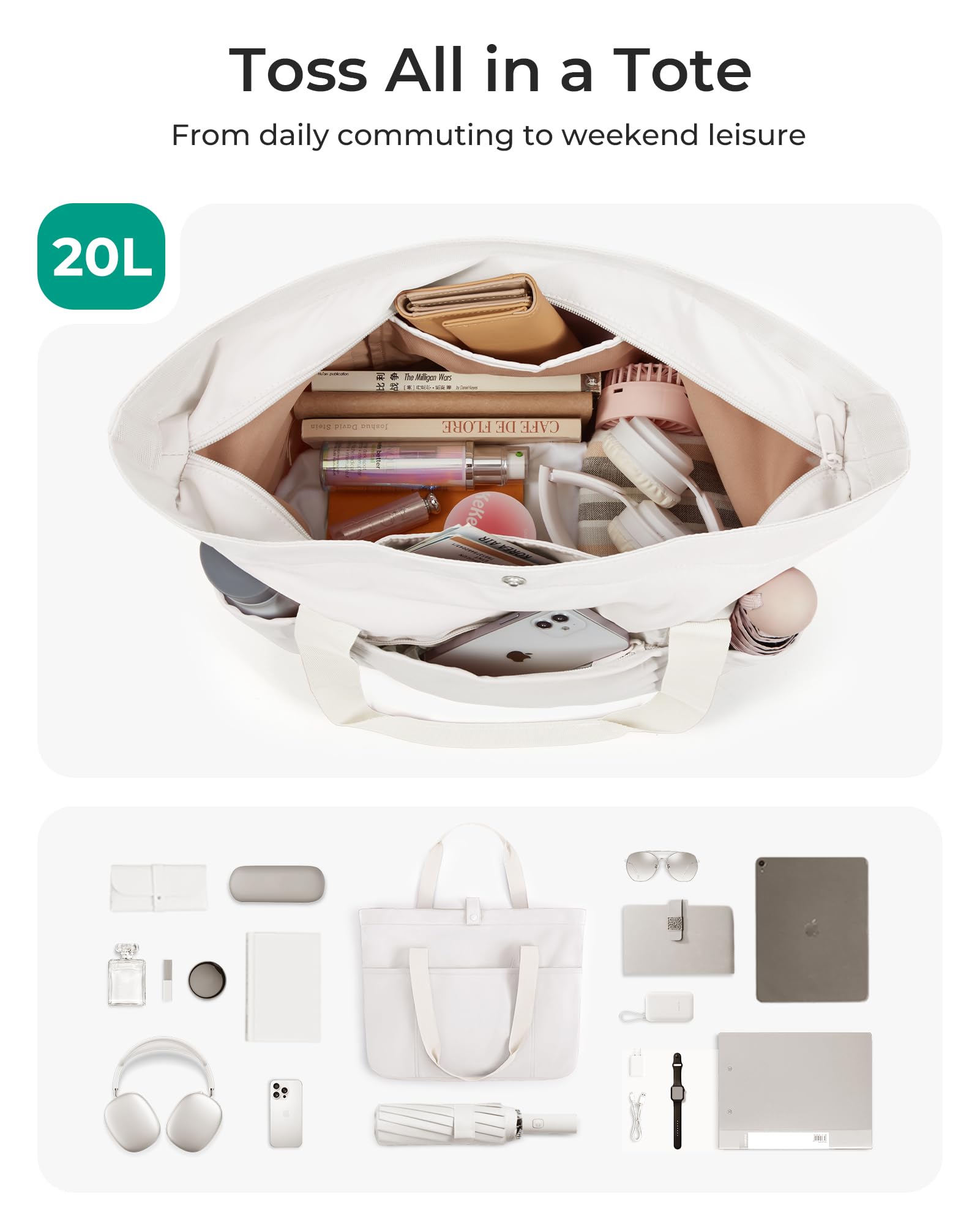 Roomy Space-Capacity 20L,The women tote bag feasures 6 separate pockets; Main zipper compartment can easily hold A4 folder, clothes, etc. 2 Outer handy pockts+ 1 front zippered pocket+1 slip pocket+ 1 back pocket allow you quick access the items you need.