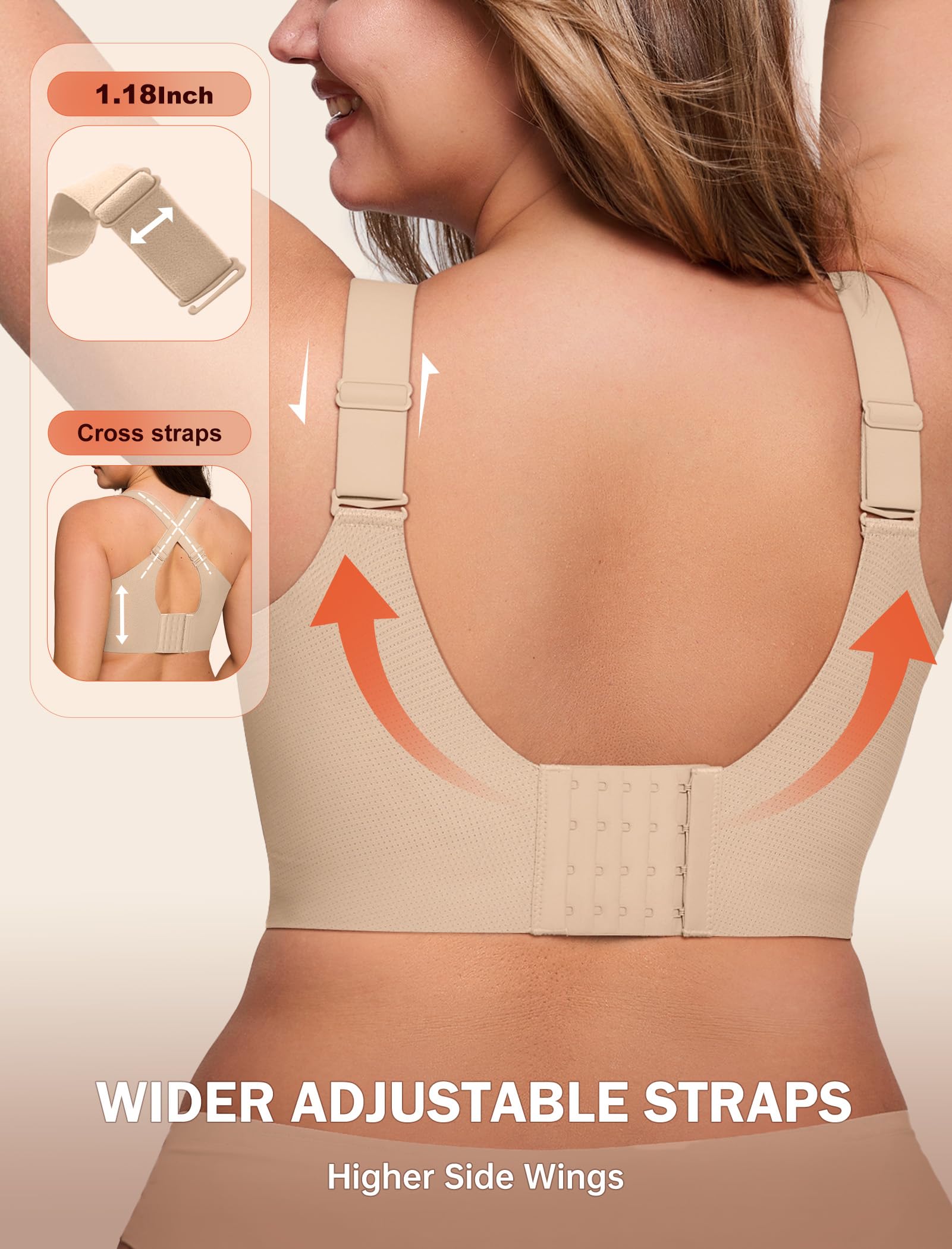 【Back Smoothing Bras & Wider Hooks】The back features precision glue-point technology for superior comfort, with a contoured wave-shaped inner layer that hugs your curves flawlessly. This sleek design not only enhances aesthetics but also smooths and conceals back bulges for a perfectly streamlined silhouette. The bras for women no underwire features 5 rows of 4 buckles and a free extender for a customizable fit.