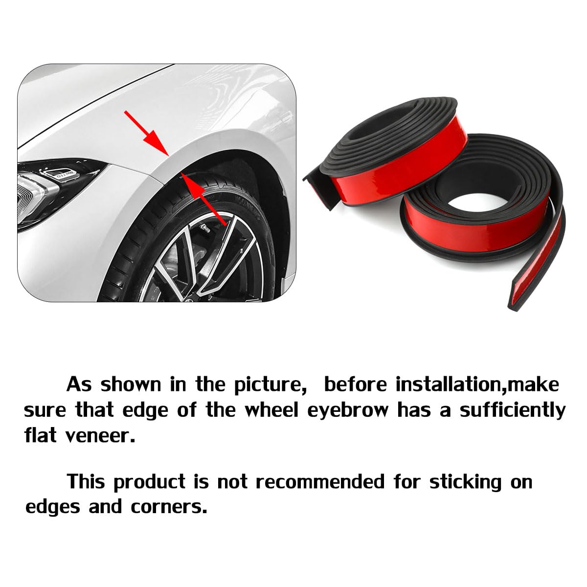 before installation,make sure that edge of the wheel eyebrow has a sufficiently flat veneer. Please refer to the instruction manual and installation video during installation. The product needs to be bent while sticking, and after installation, it is necessary to press firmly on every position to ensure that the double-sided tape is completely attached.