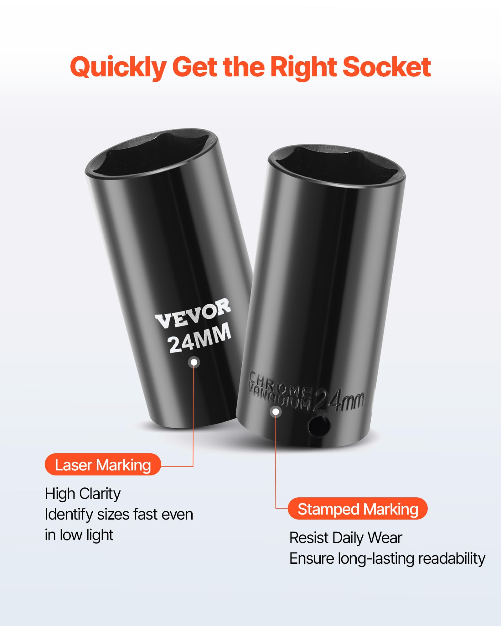 Easy-to-Read Size Markings: With laser and stamped markings, this impact socket set allows you to quickly identify the right size, even in low-light environments such as car undercarriages. The stamped design resists wear for long-lasting readability