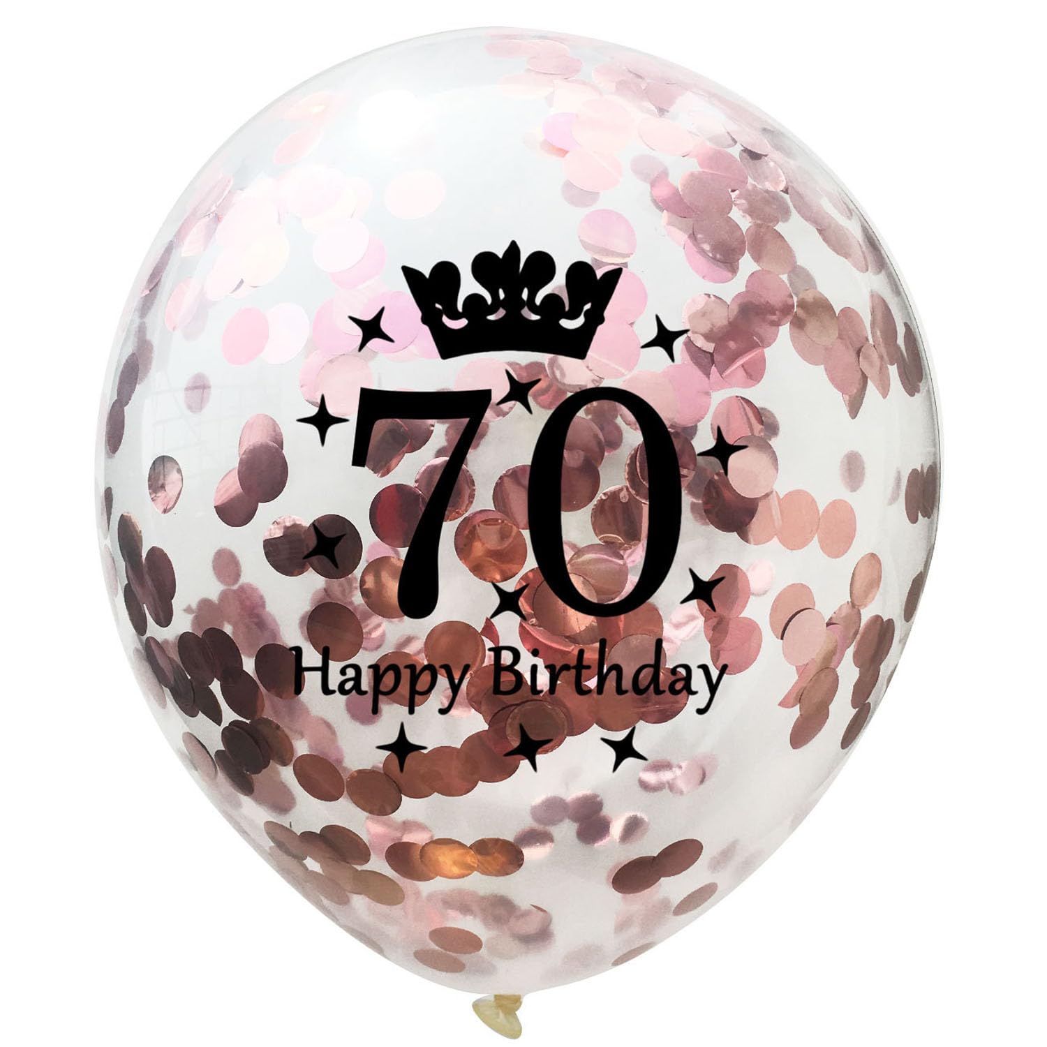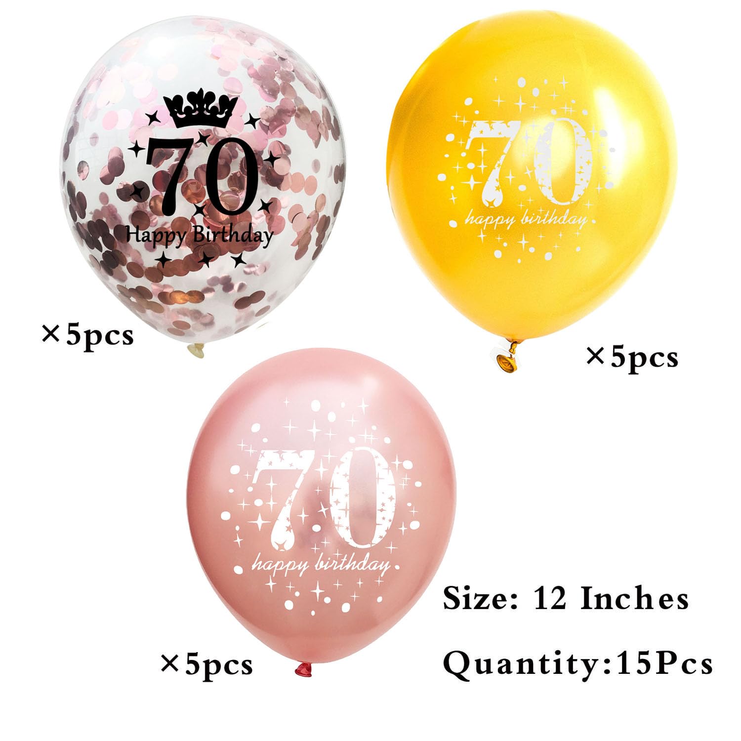 Package:5 pieces 12 inch rose gold latex balloon printed with the words "70 Happy Birthday",5 pieces 12 inch gold latex balloon printed with the words"70 Happy Birthday",5 piece 12 inch rose gold confetti balloons printed with the words"70 Happy Birthday",very suitable for women 70th birthday party decorations