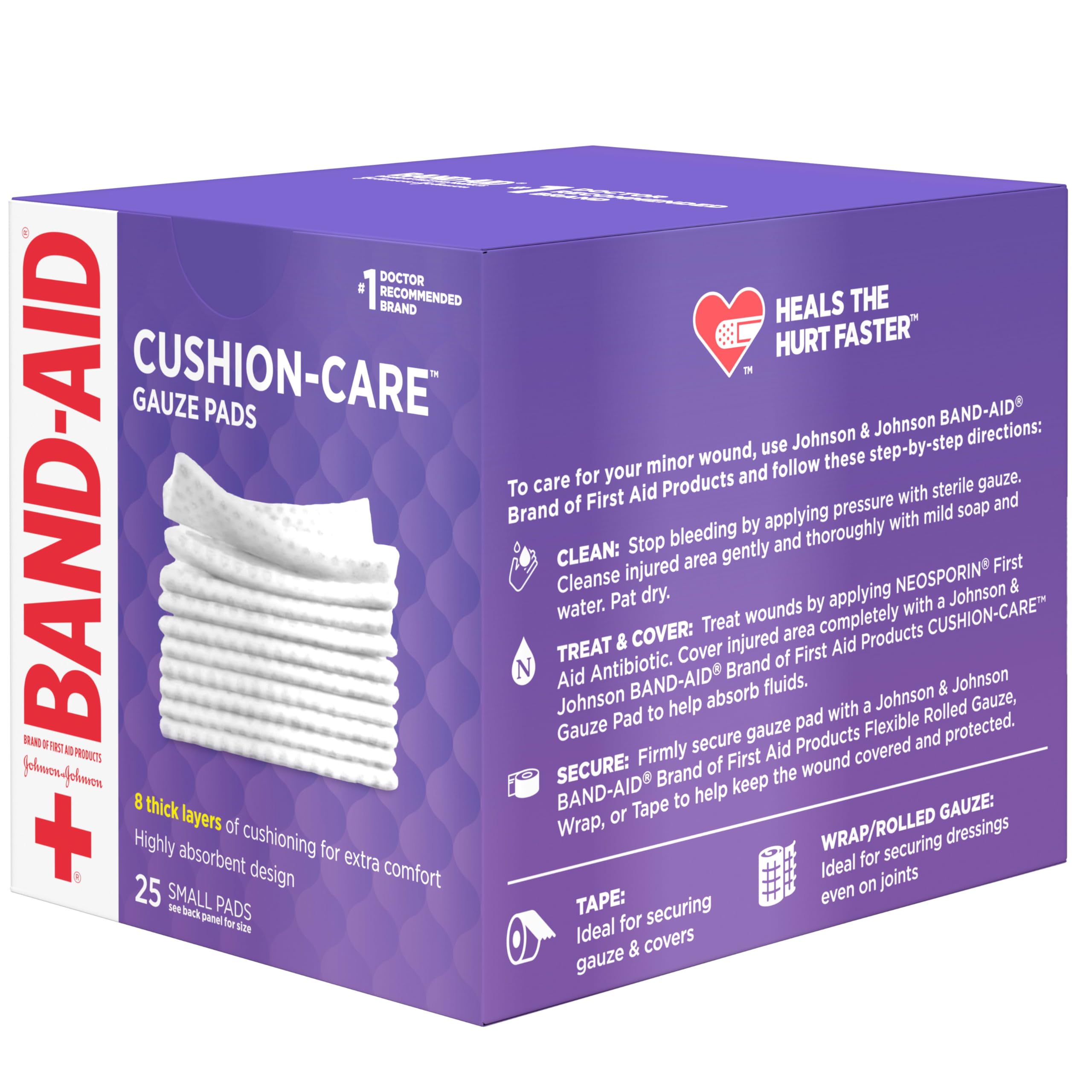 A covered wound heals faster than an uncovered one. Band-Aid Brand Sterile Cushion-Care Absorbent Gauze Pads for first aid and wound care are designed to protect minor cuts, scrapes and burns. Made with unique Quilt-Aid Technology, these individually-wrapped sterile gauze pads feature deep pockets to wick away blood and fluid from wounds to help keep them clean. Cushion-Care Gauze Pads have 8 thick layers of soft cushioning providing extra comfort for minor wounds. These small square sterile pads are 2 inches x 2 inches in size and can be used with Band-Aid Brand of First Aid Products Flexible Rolled Gauze to firmly secure the non-stick, absorbent gauze dressing in place. From the #1 doctor-recommended brand, these non-adhesive gauze pads are essential wound care supplies that are a great addition to a home first aid kit and are not made with natural rubber latex.