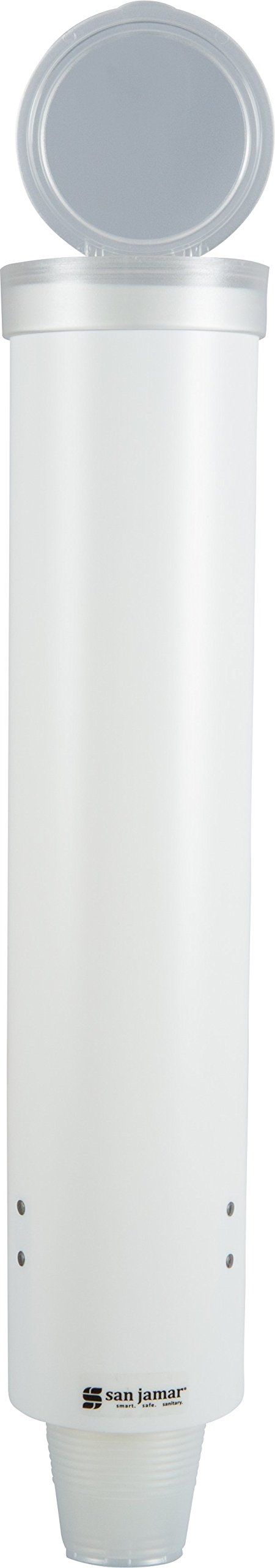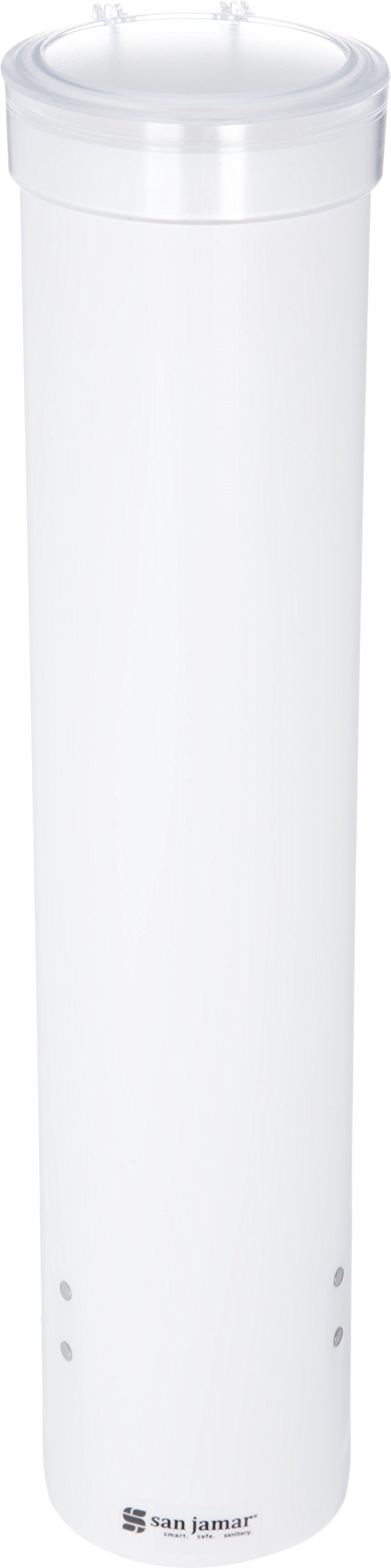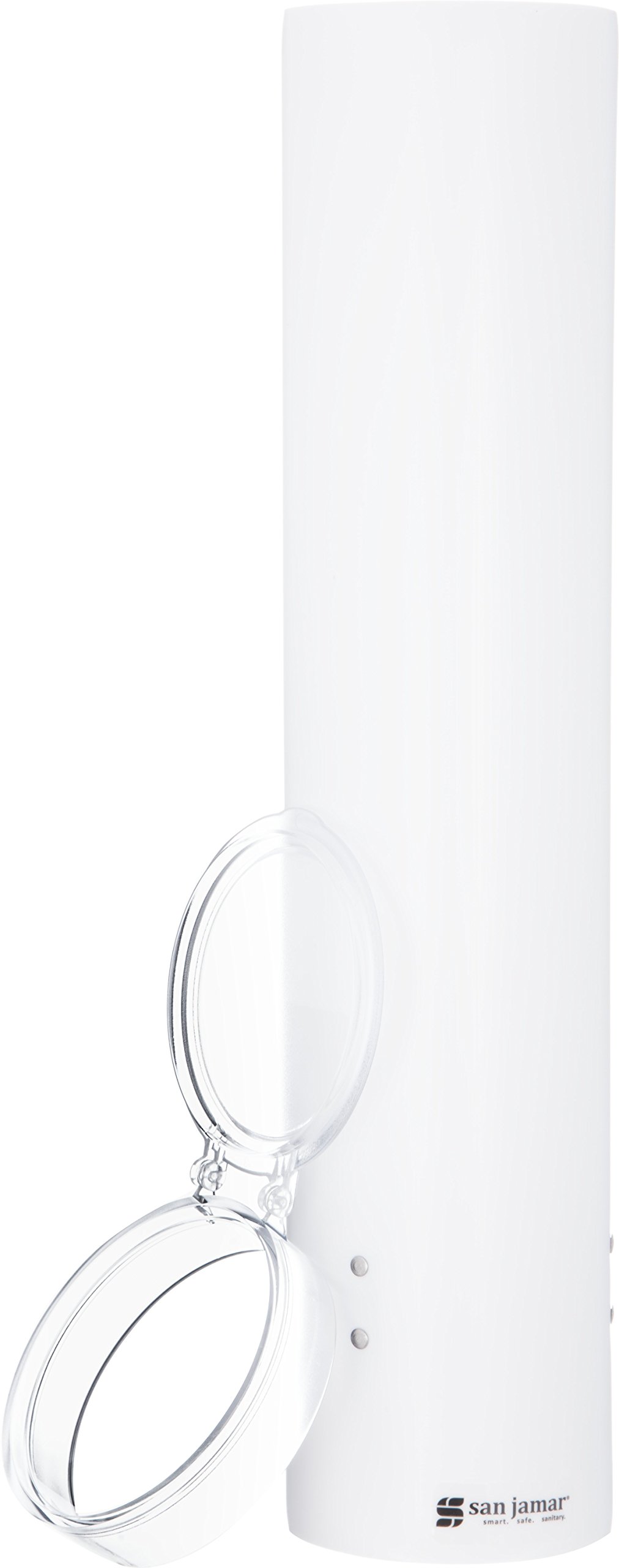 Water Cup Dispenser, medium, wall mount, pull-type, 16"L tube, top loading, self adjusting, transparent flip cover, plastic, fits 4 to 10 oz. flat bottom cups or cone cups with 2-1/2" to 3-1/4" rim diameter, white