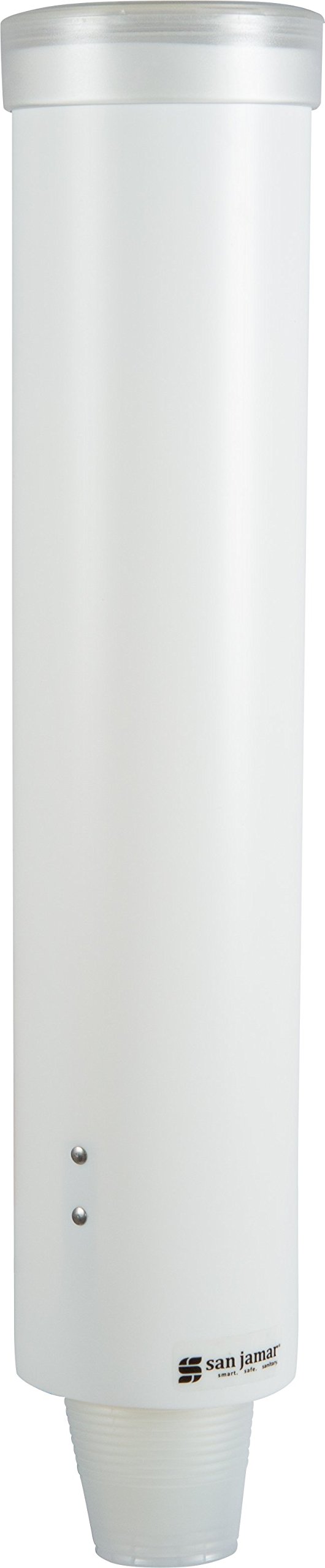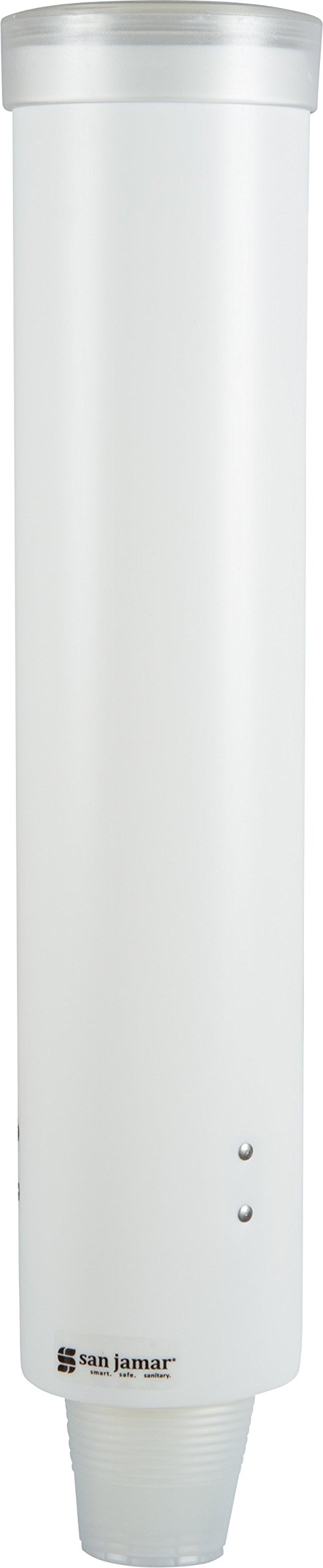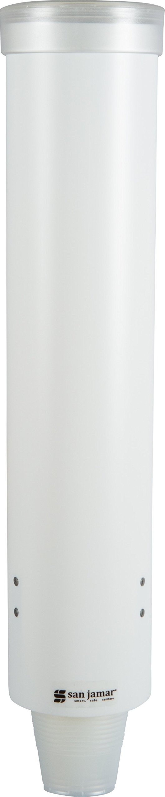Water Cup Dispenser, medium, wall mount, pull-type, 16"L tube, top loading, self adjusting, transparent flip cover, plastic, fits 4 to 10 oz. flat bottom cups or cone cups with 2-1/2" to 3-1/4" rim diameter, white