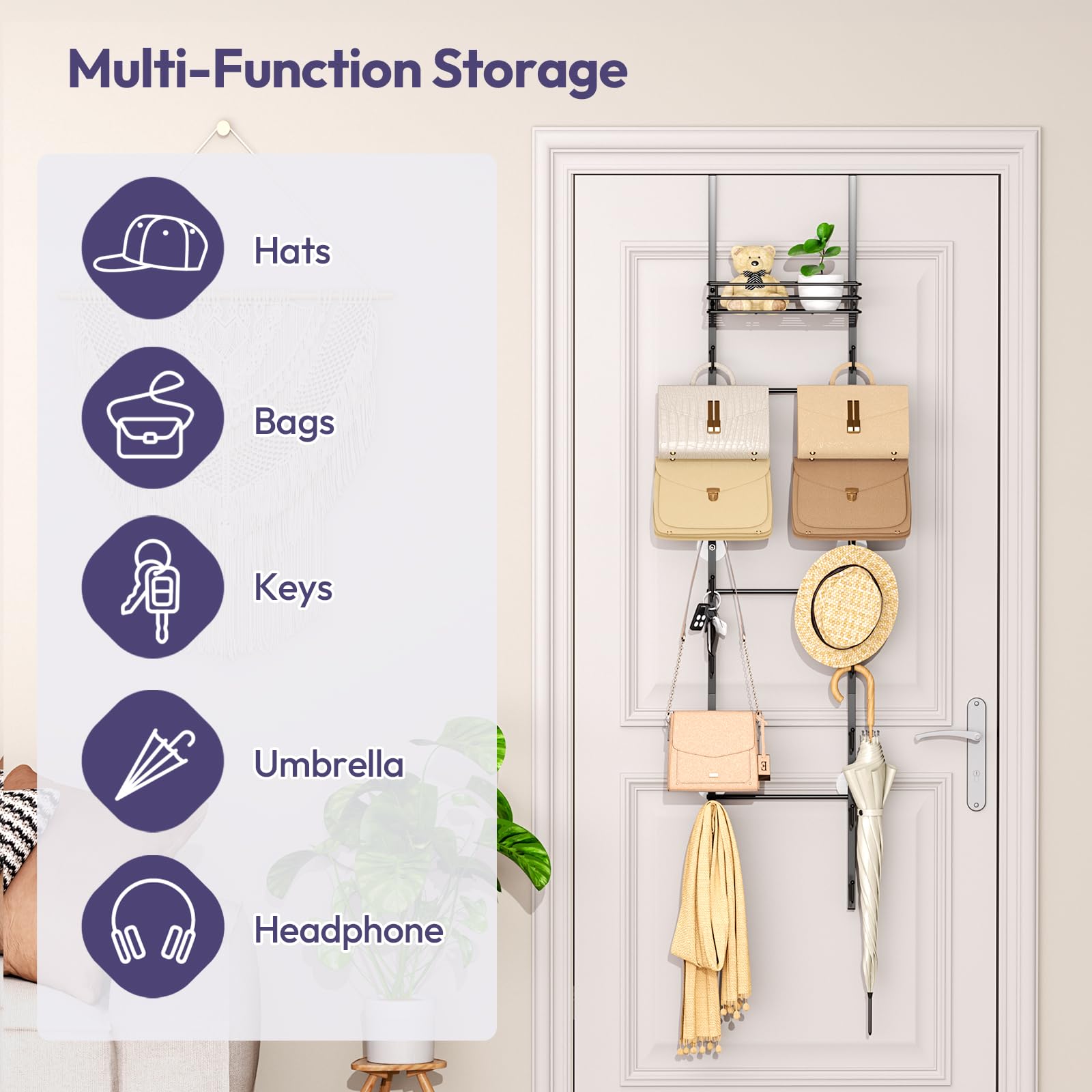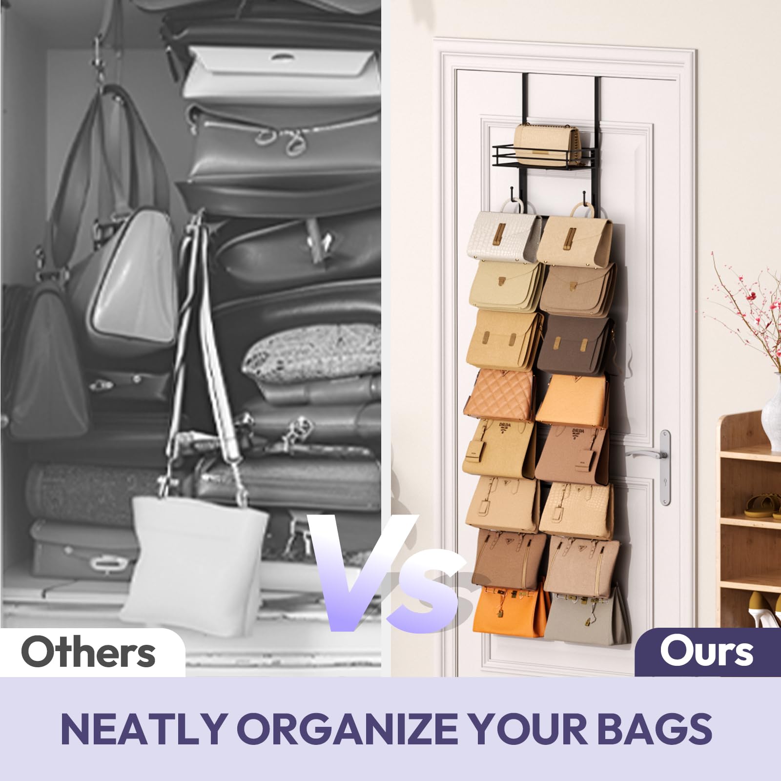 [Secure and Stable]: The over the door handbag organizer includes anti-sway adhesive pads prevents swinging or sliding. Use it as a purse holder for closet or a dependable vertical rack—it keeps everything in place, whether holding a small purse organizer or larger totes
