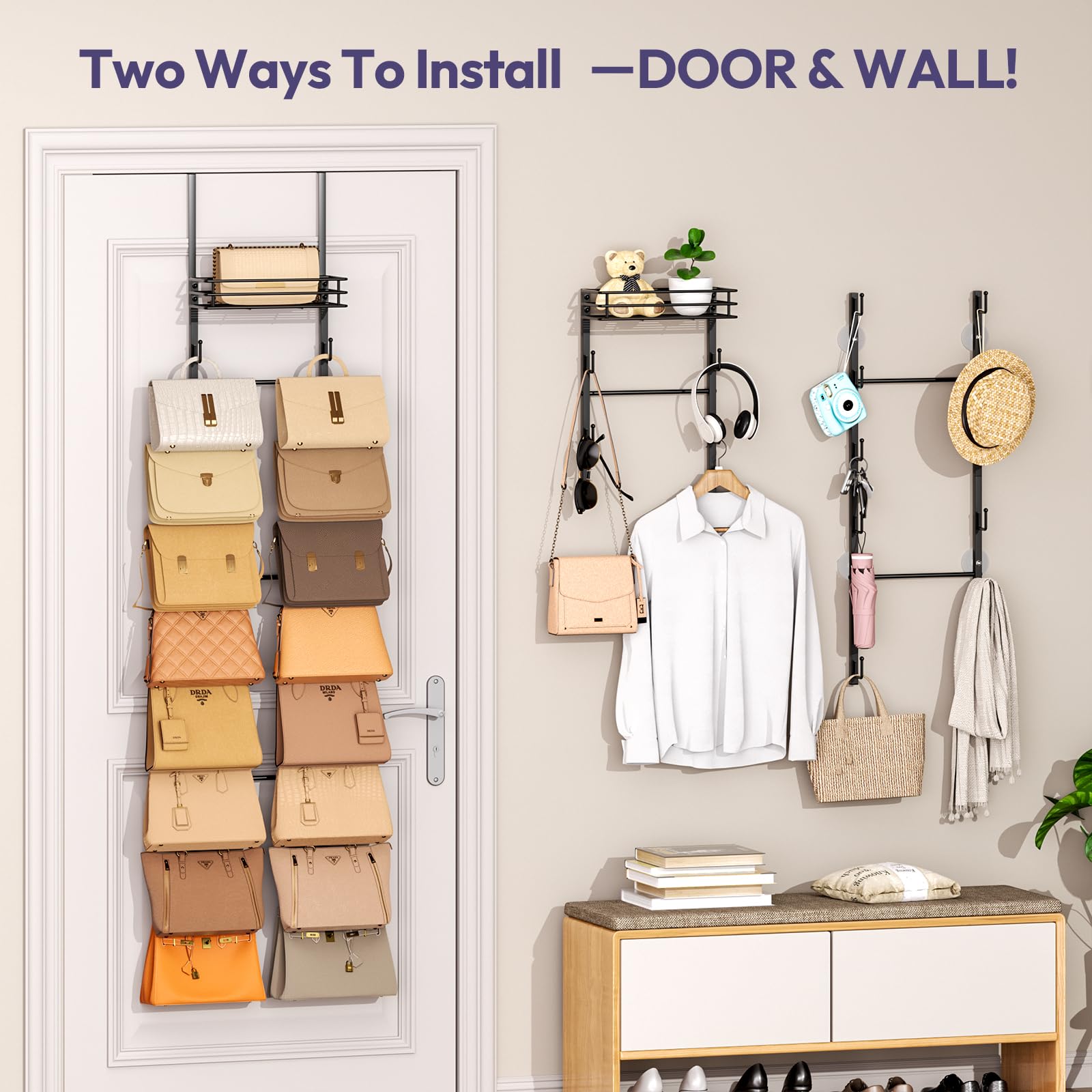 [Dual Installation Modes]: Choose what works for you—hang it over the door or mount it on the wall. This purse storage adapts to your space and style. Whether you're organizing everyday bags or weekend totes, this heavy-duty handbag storage system serves as a durable and elegant purse holder for homes, dorms, and studios