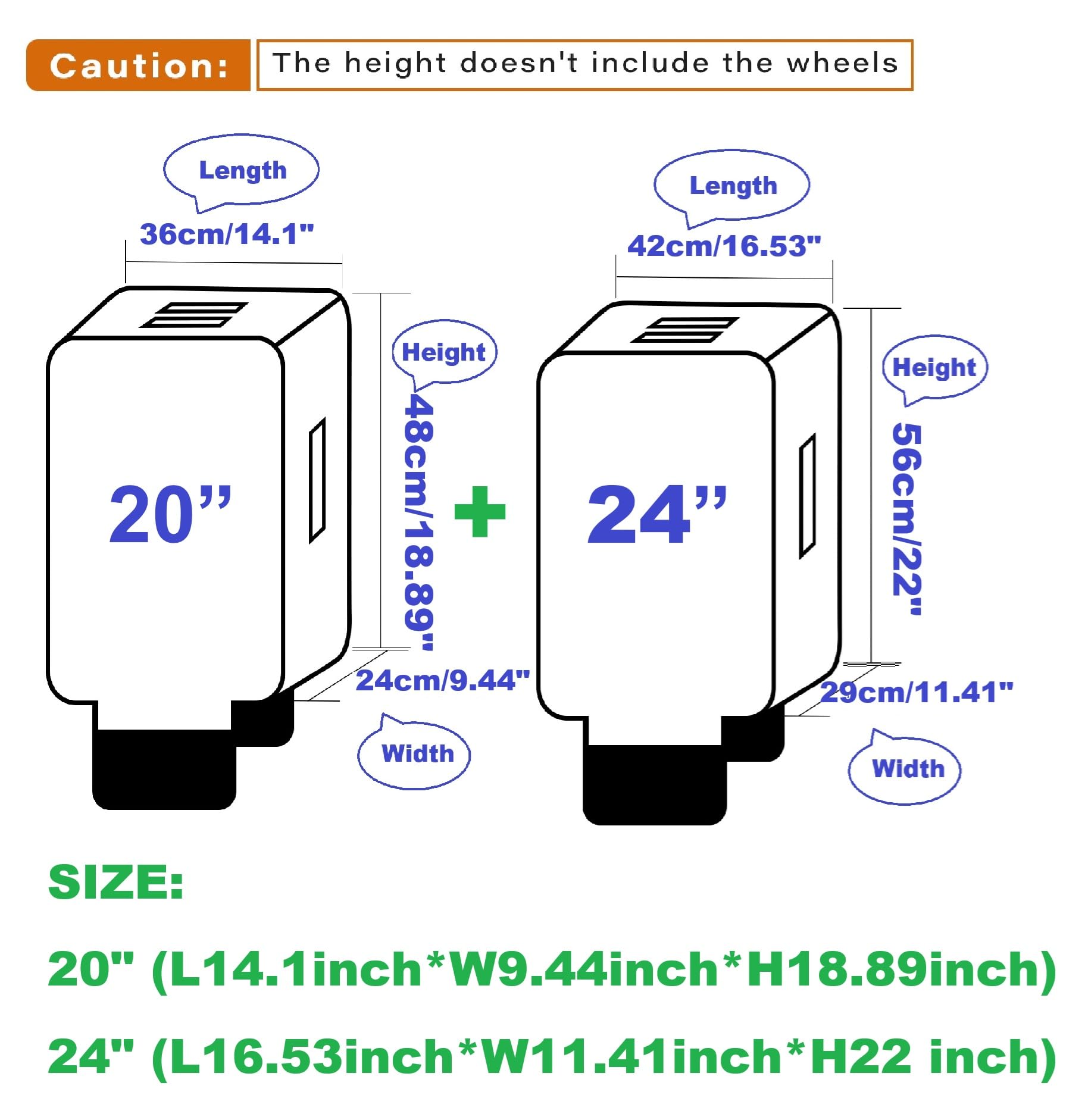 PVC Suitcase Cover Size: 24 inch Suitcase cover size is about 16.53"L x 11.4"W x 22"H, not includes the wheel height ,20 inch Suitcase cover size is about 14.1''L x 9.44''Wx 18.89''H,not includes the wheel height,Pls make sure your Suitcase size before place the order