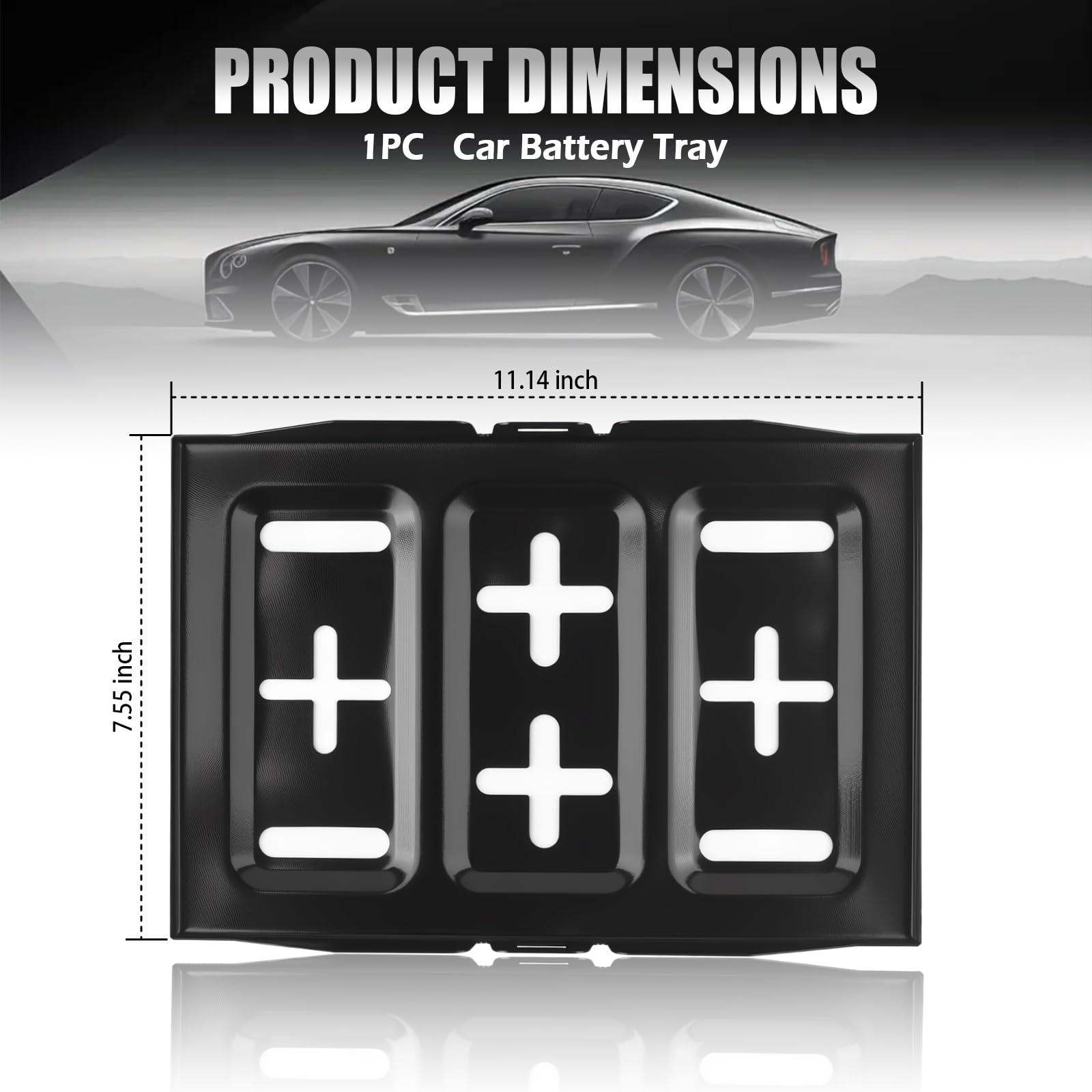 USE OUR CAR BATTERY TRAY TO SECURELY HOLD CAR BATTERY IN PLACE AND EXTEND LIFE OF BATTERY, YOU DESERVE IT Product Attributes Colors: Black Sizes: 11.14*7.55 inch Weight: 18.52 oz Material: Iron Packaging: 1* Car Battery Tray How to Install: 1. Cut the battery cables, disconnect the power supply, dismantle all battery mounting components, and dismantle the battery 2. Clean mounting area free of dust and impurities to avoid obstruction when mounting trays 3. Unscrew all mounting components such as screws and dismantle the old battery tray 4. Align the new battery tray with the mounting holes and place it in place 5. Re-fasten the old fixing components to the new battery tray in the same way as before and keep that it is securely fixed 6. Place the battery on the tray, refasten the original components in place and reconnect the cables, taking care to use the battery with care to avoid injury 7. Installation complete Product Feature & Functions 1. The car battery tray can securely hold the car battery, avoiding the battery from shaking and rattling, avoiding battery collision and damage, and prolonging the service life of the battery 2. Practical car battery tray, you can use it to add a second battery to your car, you can also use it to directly replace the tray of the existing battery to provide better support, a good choice for car battery maintenance 3. Made of iron, with high strength and hardness, sturdy and durable, not easy to break and damage, the surface baking paint treatment, so that it is not easy to rust 4. Designed with multiple mounting points for easy installation, adapting to different installation scenarios, widely applicable to most standard batteries, as long as the size is suitable