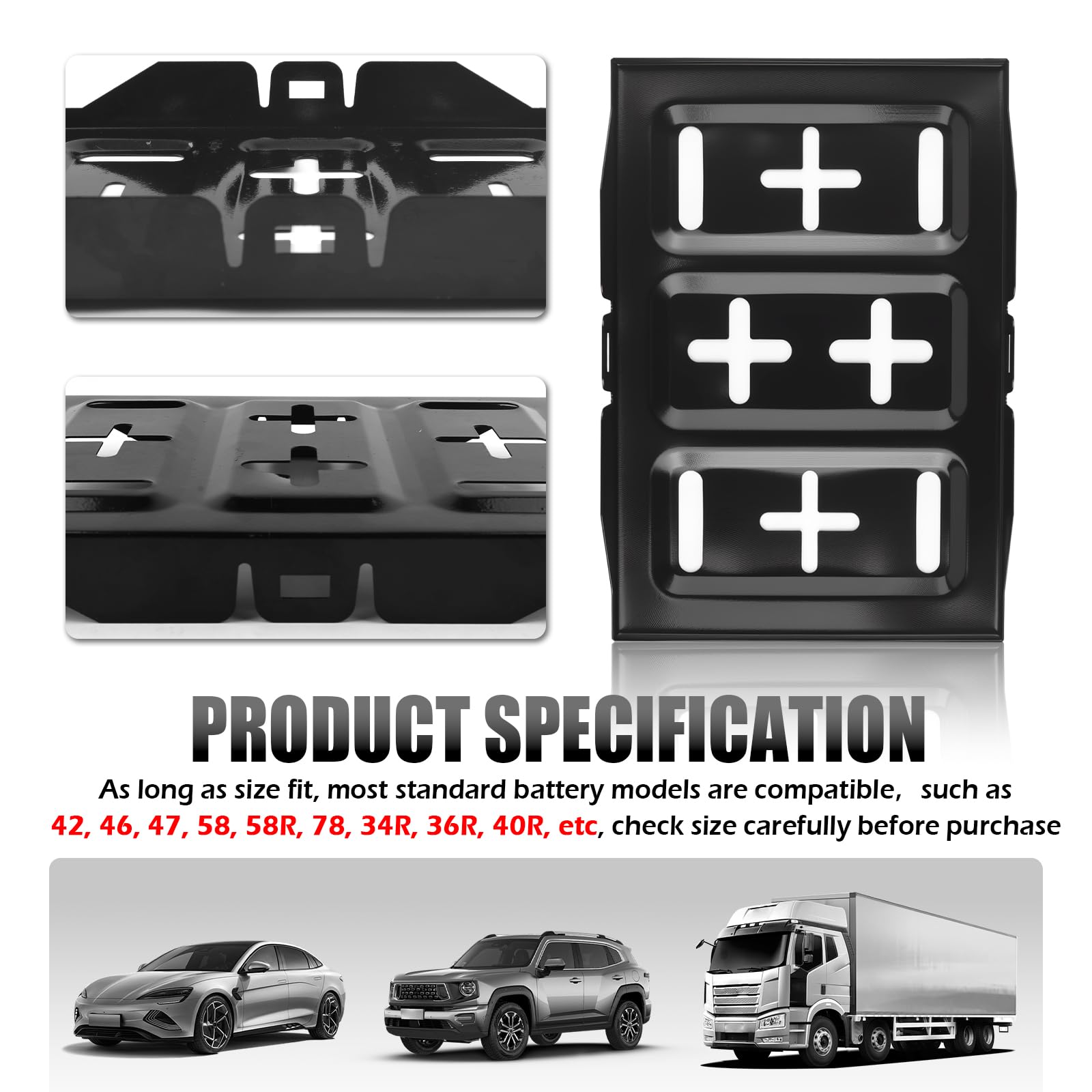 Product Specification: Car battery tray total size 11.14*7.55 inch, widely used in cars/SUVs/trucks/electric vehicles/RVs/boats, etc, as long as size fit, most standard battery models are compatible, such as 42, 46, 47, 58, 58R, 78, 34R, 36R, 40R, etc, check size carefully before purchase