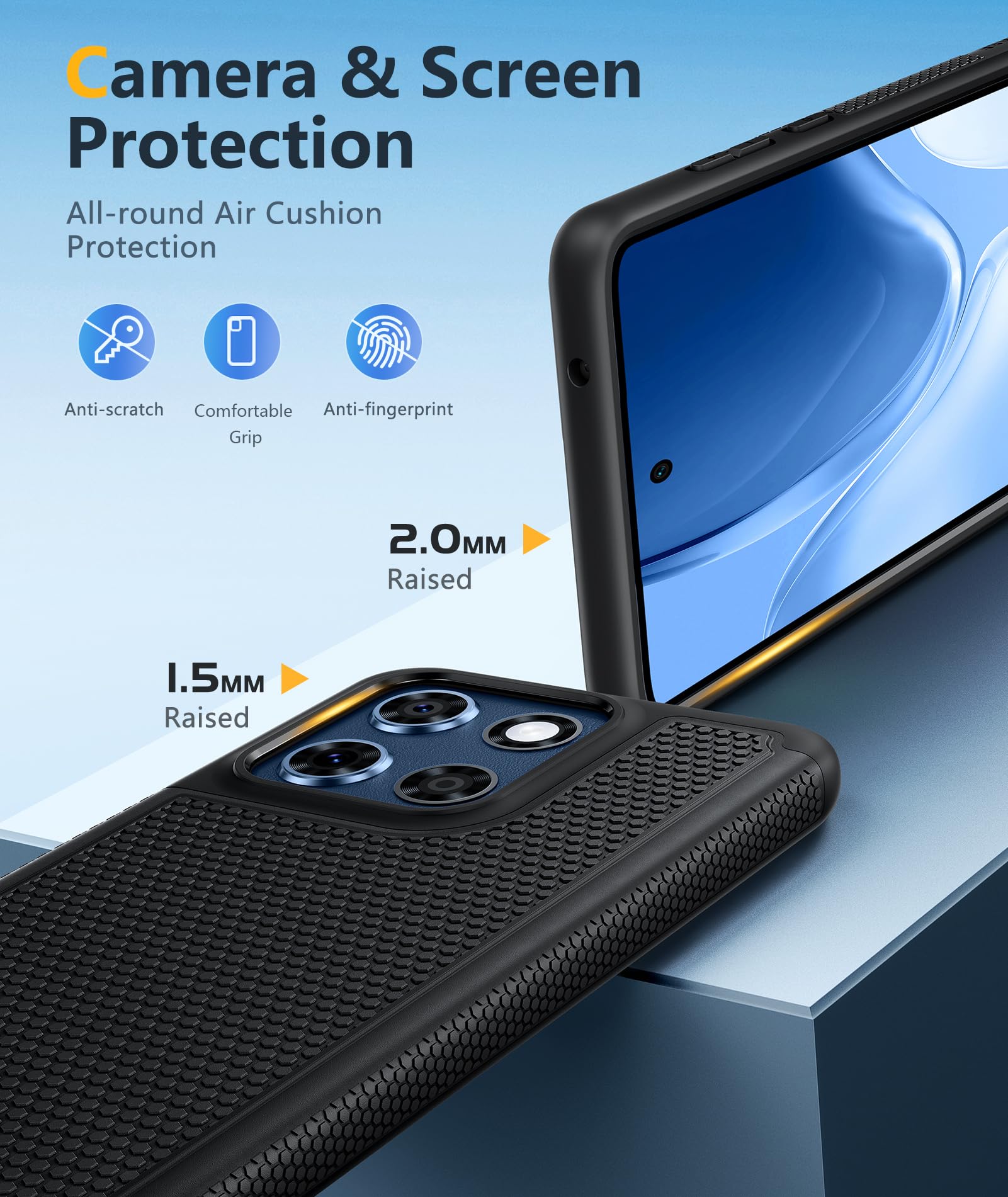 Dual-layer hybrid covers: A soft TPU inner case, four-corner airbags and honeycomb inner design for shock absorption and heat dissipation, a hard PC back outer shell for strong impact resistance against accidental drops, 14ft military-grade drop protection. 2.0mm raised bezel camera guard, and 1.5mm raised front edge to prevent screen scratches