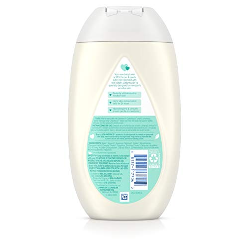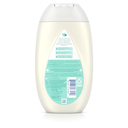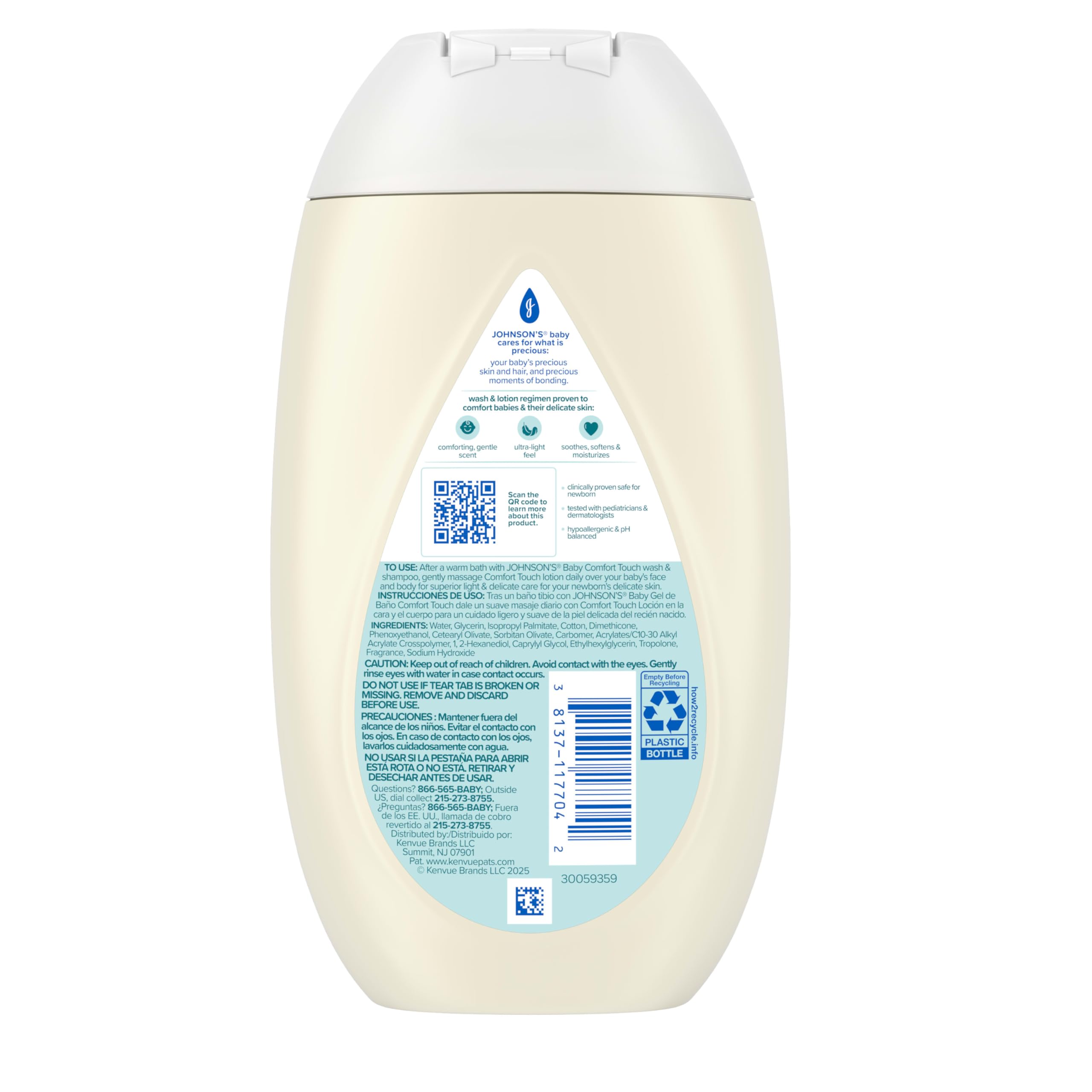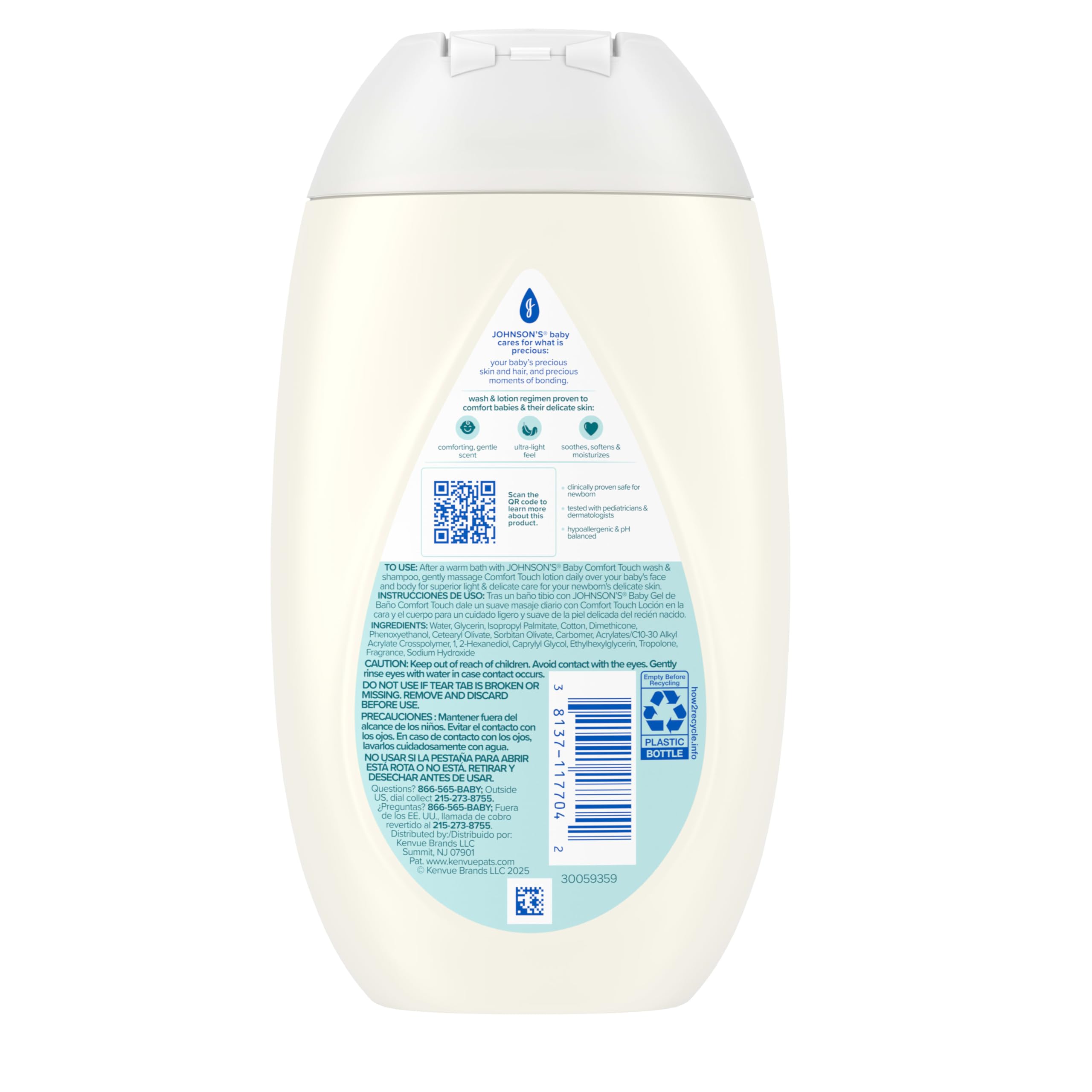 Hydrate your baby's delicate skin all day long with Johnson's Comfort Touch Newborn Baby Face & Body Lotion. With a gentle, lightweight formula specifically clinically proven safe for your newborn's skin, this nourishing baby body & face lotion soothes, softens, and moisturizes delicate skin to keep baby comfortable all day long. Pediatrician and dermatologist tested, this baby lotion for silky moisturization is pH-balanced and features a comforting, gentle scent. This hypoallergenic baby lotion keeps baby’s skin moisturized and has no added parabens and dyes. Our formulas, with a gentle, comforting scent, are proven to help build parent and baby connection* *when Johnson’s Baby Comfort Touch Wash & Shampoo and Johnson’s Baby Comfort Touch Lotion are used as part of a two-step routine. Comfort Touch Routine: Wash & lotion regimen proven to comfort babies & their delicate skin*: 1: Wash with Johnson’s Baby Comfort Touch Wash & Shampoo 2: Moisturize with Johnson’s Baby Comfort Touch Lotion *when Johnson’s Baby Comfort Touch Wash & Shampoo and Johnson’s Baby Comfort Touch Lotion are used as part of a two-step routine. Our Formula: Safe for Newborns Hypoallergenic, pH-balanced, and made with no added parabens or dyes. Pediatrician Tested Brand Story: Johnson’s Baby cares for what’s precious: your baby’s precious skin and hair, and precious moments of bonding. For over 125 years, we’ve been committed to crafting gentle, science-backed baby care products that support happy, healthy bonding moments. World's #1 Baby & Child Care Brand* *Source Euromonitor International Limited; Beauty and Personal Care 2025 ed. As per Baby and Child-Specific Products Category; all retail channels; value sales at RSP; 2024 data.