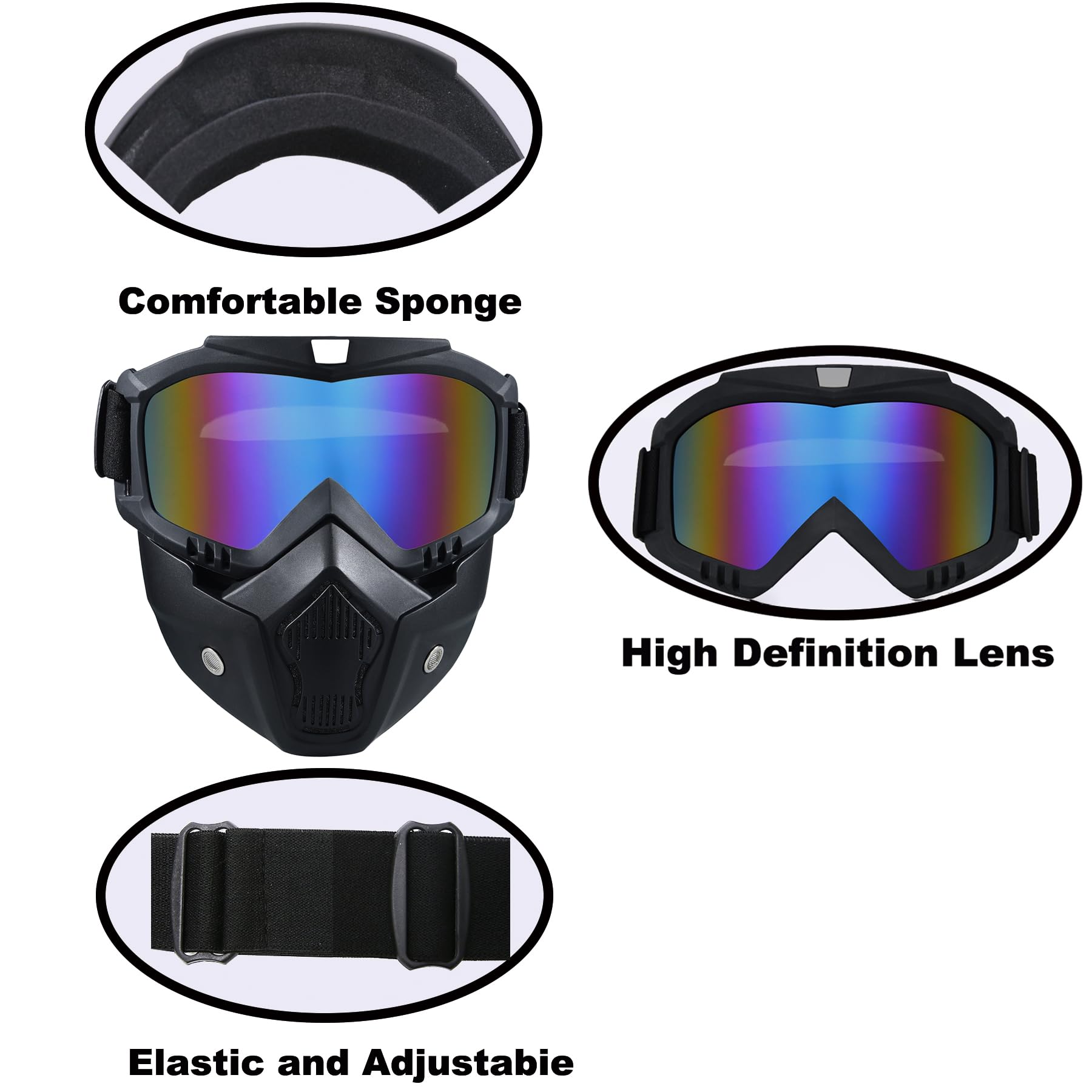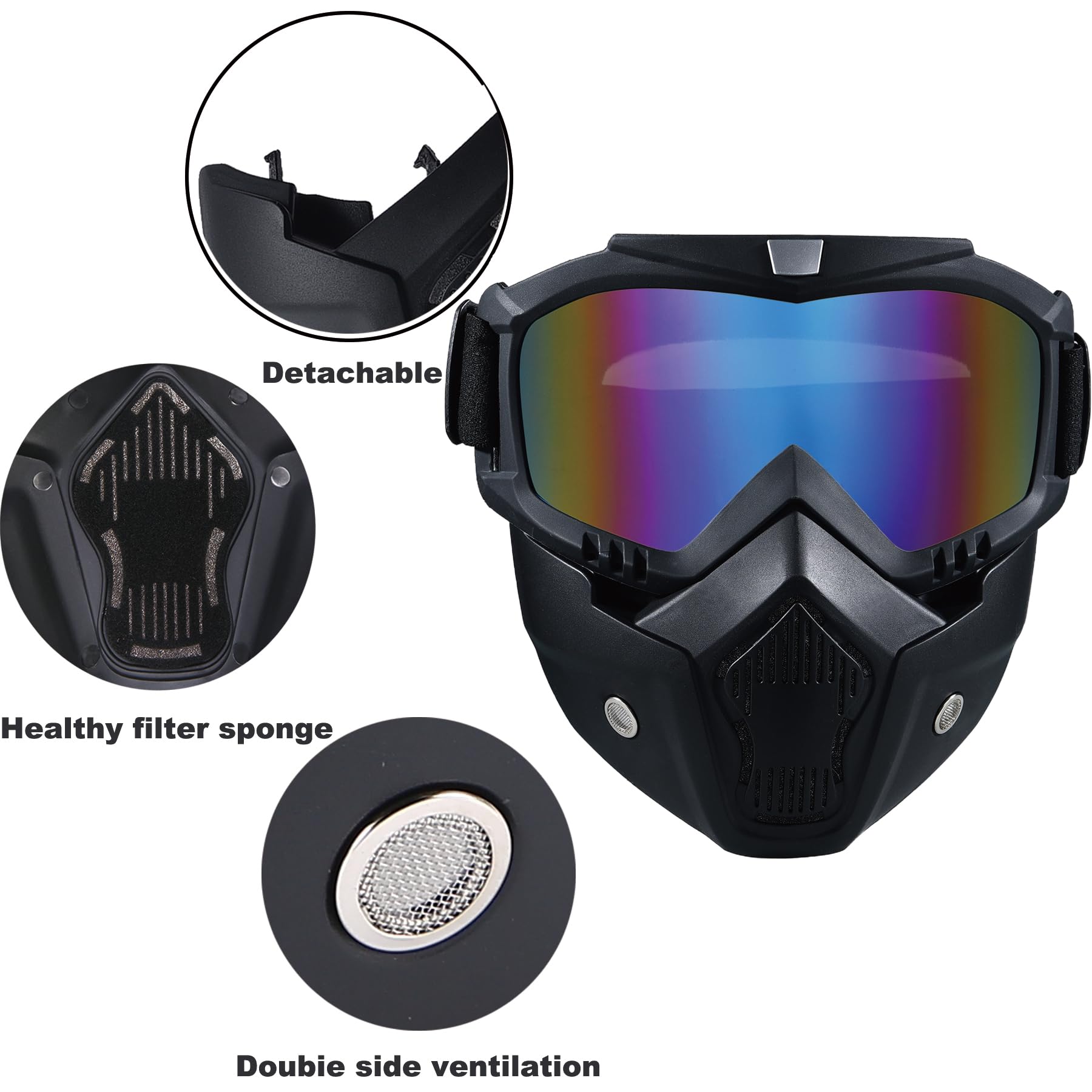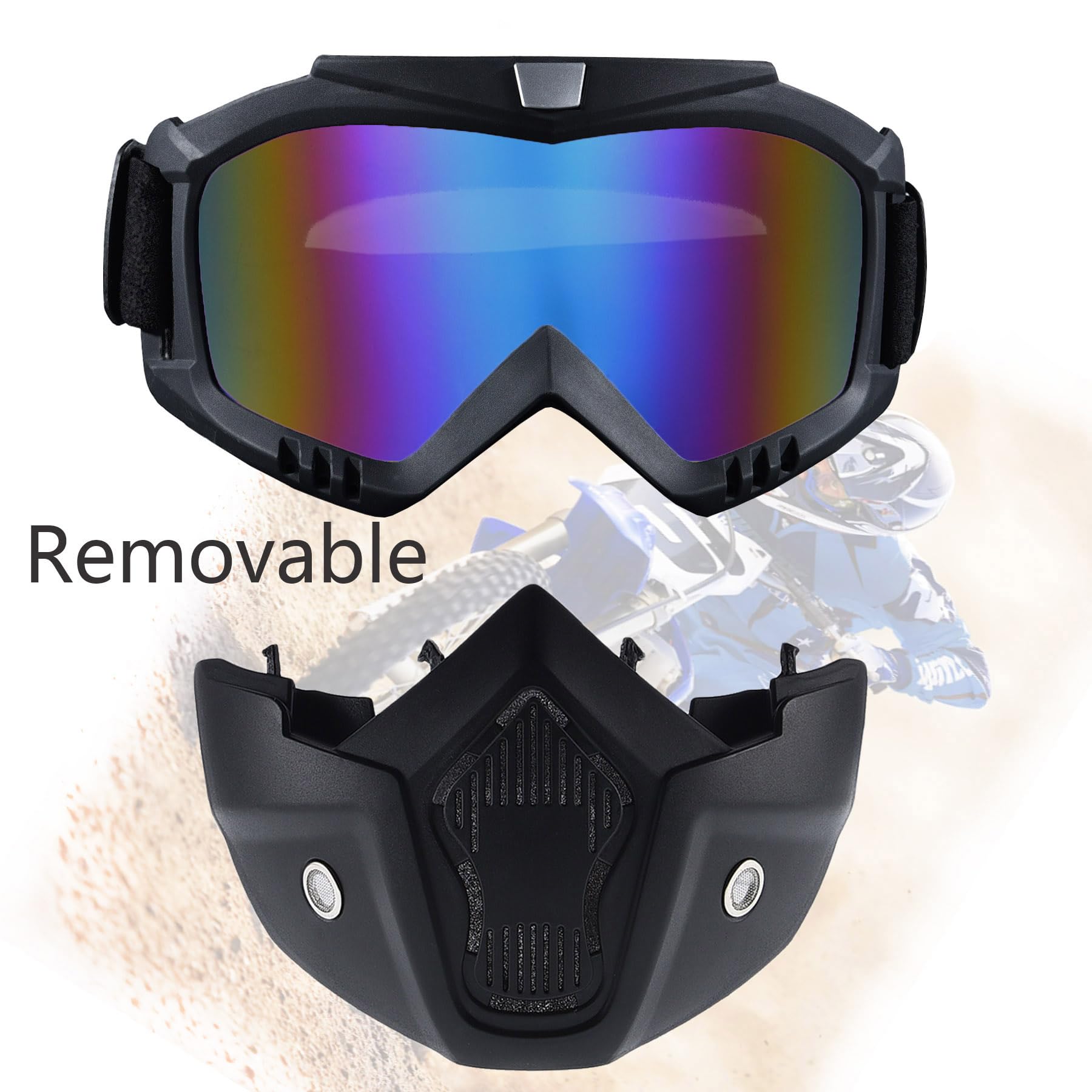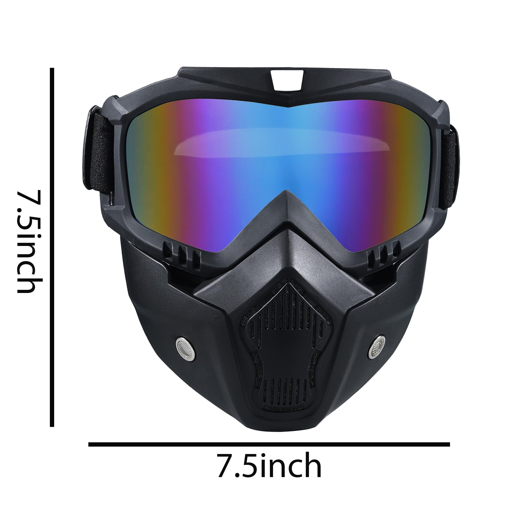 Package Contents:2x Face Mask withDetachable Goggles Size: One size fits most Frame Width: About 7.48 inch Frame Height: About 7.08 inch Material: TPU (Frame), PC (lens) Features:Multifunctional Goggles Windproofand Dustproof,anti- UV , anti-dazzle,better protect your eyes。 You can use it for Climbing,motorcycling,riding, snowmobile, skiing, Airsoft,Paintball, Jungle CF game and so on.