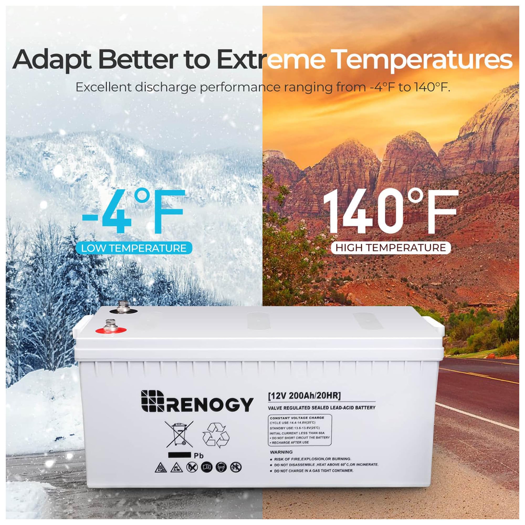 Long Shelf Life: Made of high purity materials, Renogy deep cycle agm batteries reduce the monthly Self discharge Rate below 3% at 77℉ (25℃), which is 5 times lower than their flooded counterparts.