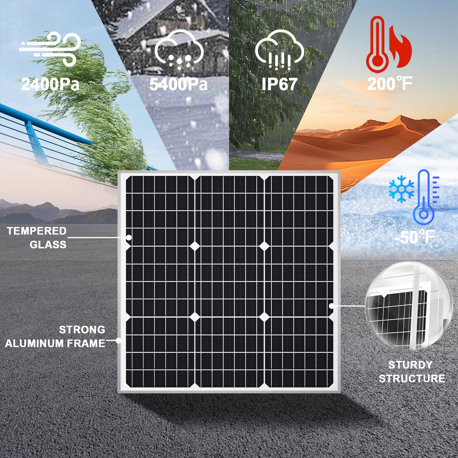 【Built to Last】 Low-iron tempered glass surface and corrosion-resistant aluminum frame, make this solar panel 100% waterproof and rustproof, and provide the prolonged lifespan up to 25 years. This 12V solar panel can withstand all weather conditions such as sandstorm, strong wind, thunderstorm, blizzard, hail, etc. It can withstand up to 2400Pa wind pressure and 5400Pa snow load