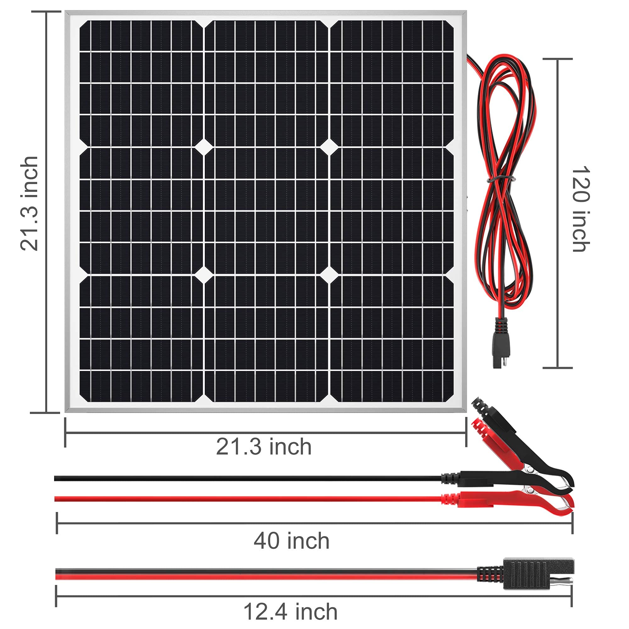 【High Conversion Rate】This 50W solar panel with monocrystalline A+ solar cell has an excellent cell efficiency of 21%-30%. Designed to charge and maintain 12V rechargeable batteries like LiFePO₄, Lithium Ion, AGM, SLA, GEL, EFB, MF, etc. Keep batteries charged for trailer, tractor, truck, boat, motorcycle, RV, car, lawn mower, water pump, gate opener, electric fence, etc