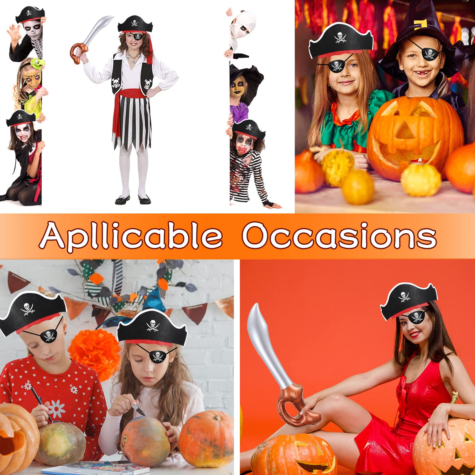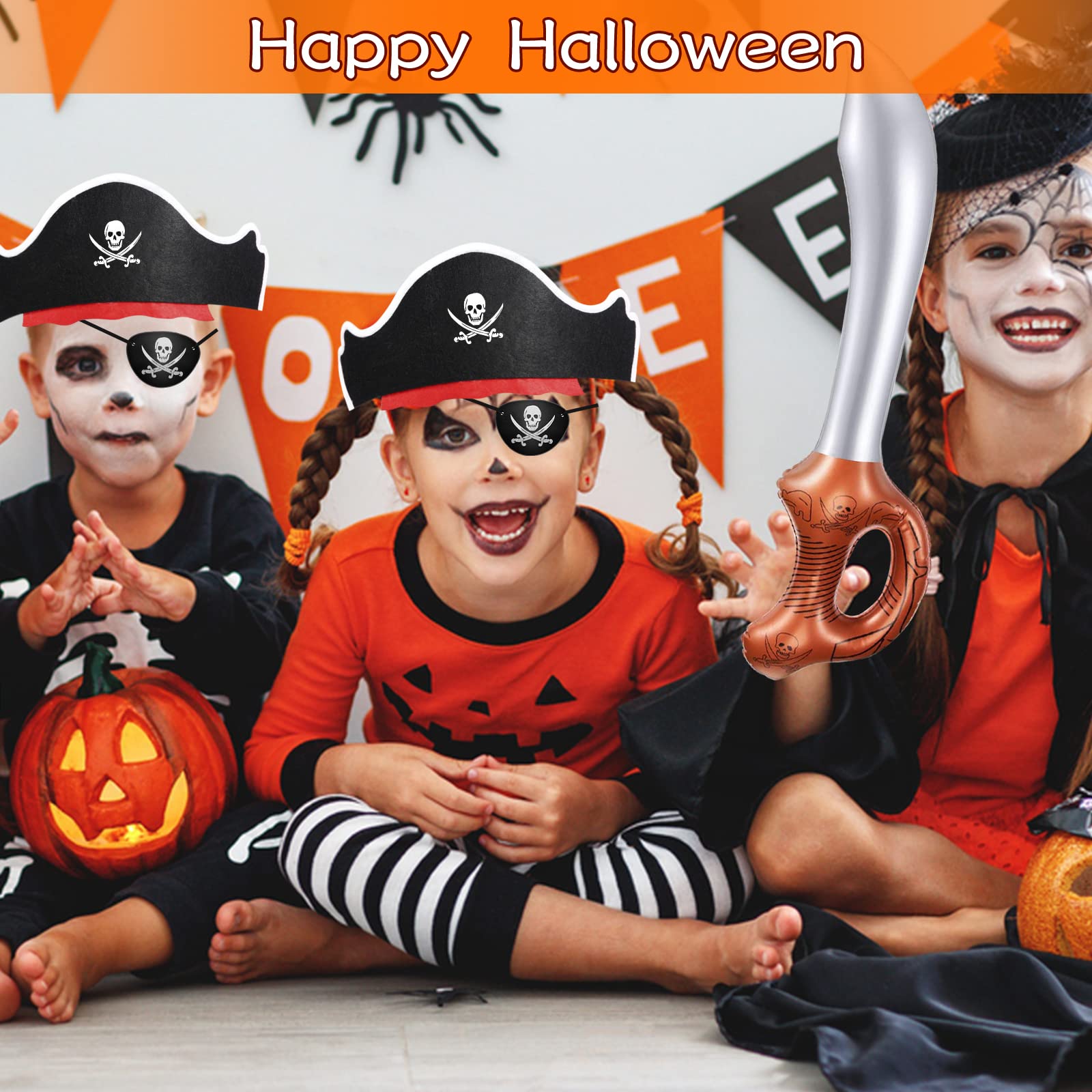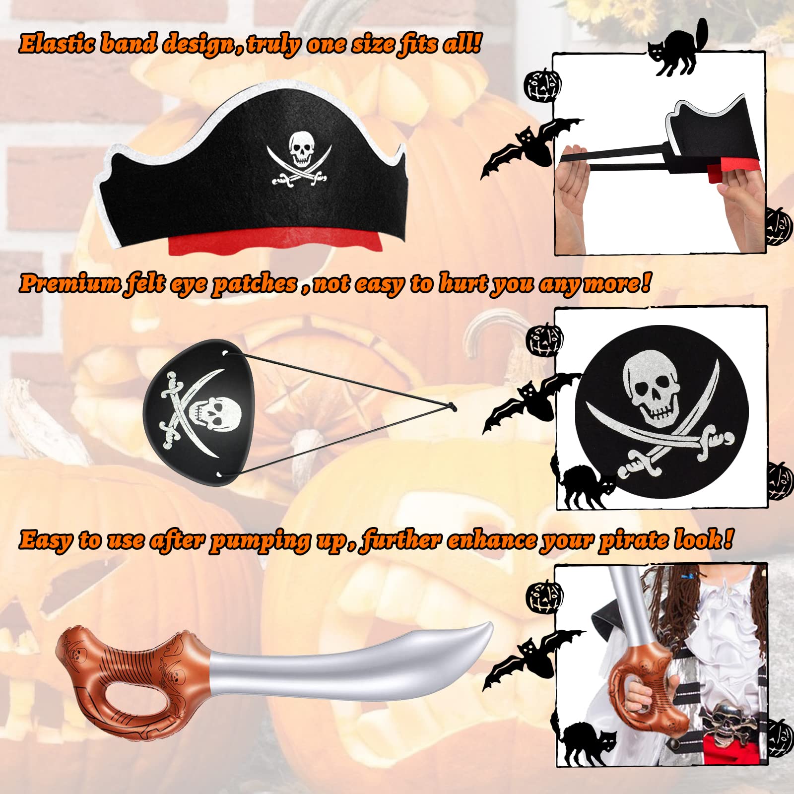 Premium Material: Our pirate eye patches and hats are fabulous with a nice, thick fabric, which feels soft and comfortable; The fabric we use have been upgraded with premium felt instead of using plastic eye patches; Not easy to break and hurt you anymore; And the inflatable swords are made of premium PVC, easy to carry and reusable
