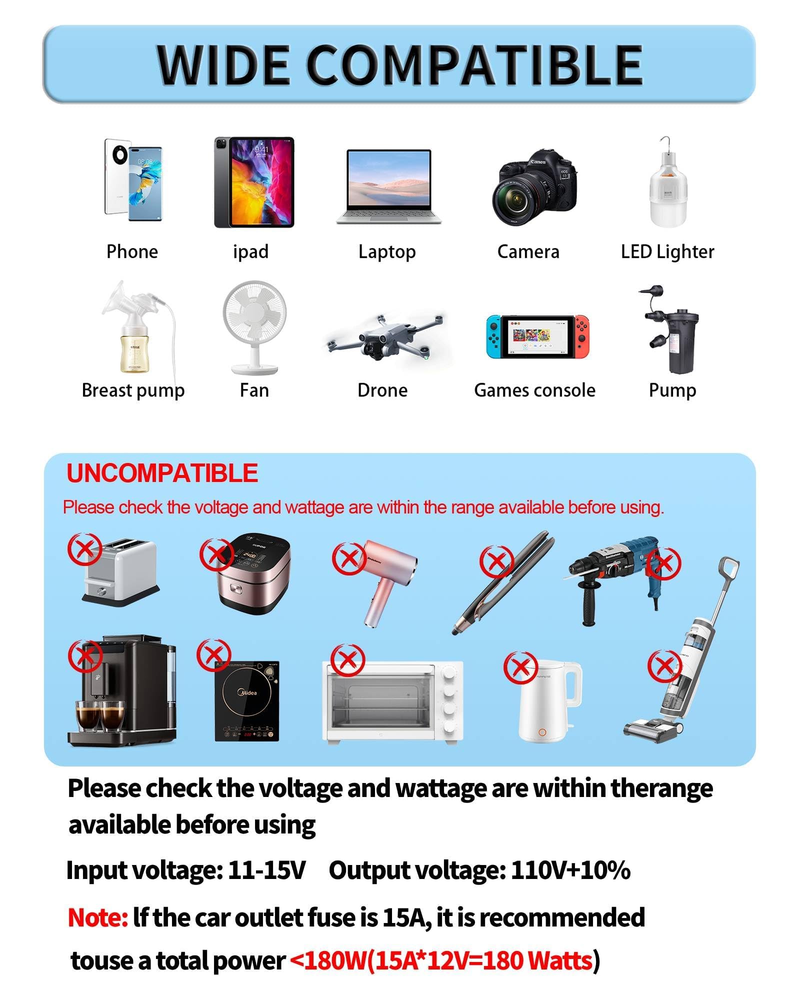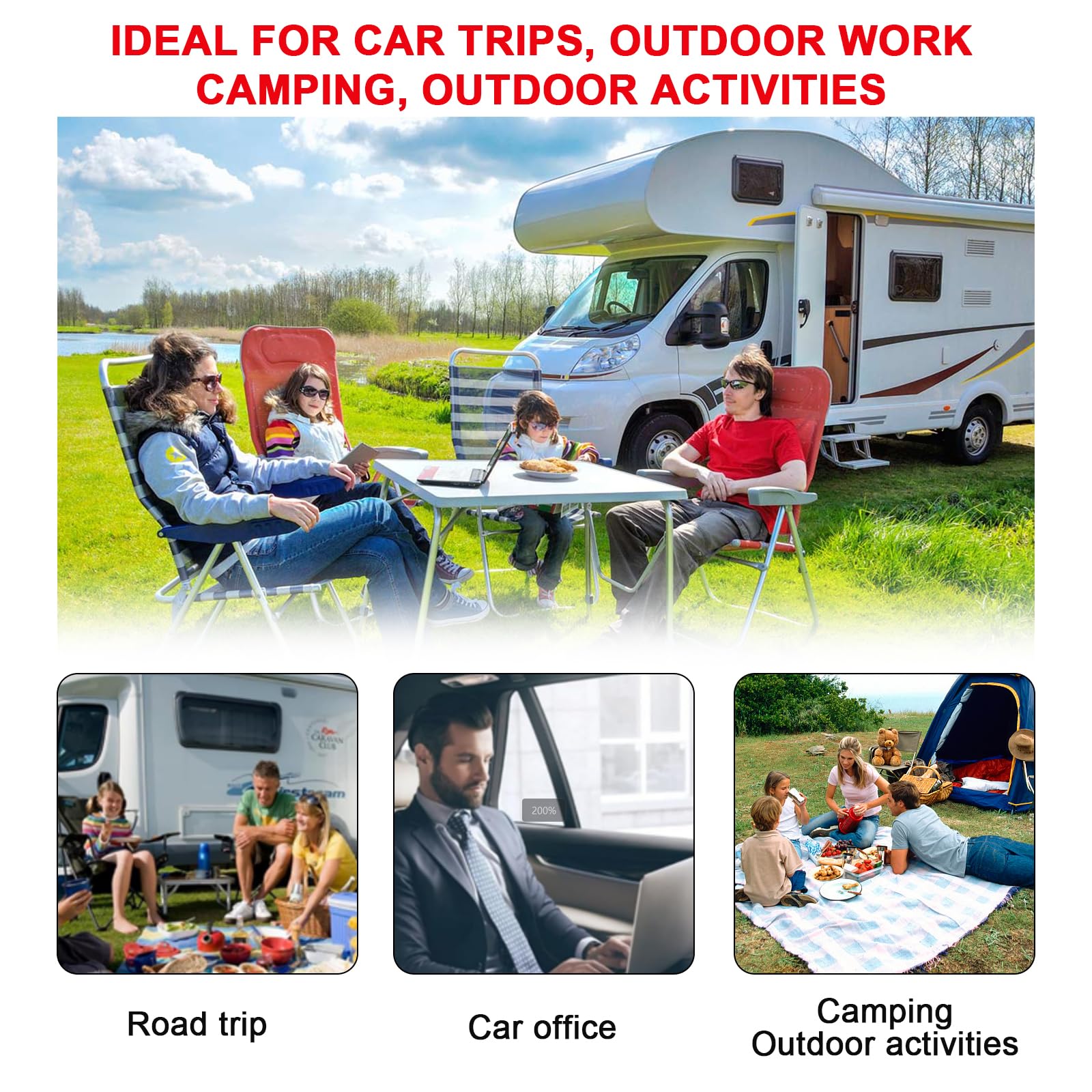 【Ideal for Road Trips】: Can be connected to the power supply using a cigarette lighter (less than 150W) or cables. The USB-A ports are suitable for charging devices such as Kindles, smartphones, iPads, tablets, cameras, and AirPods. The AC outlets provide a reliable power supply for appliances requiring 1000W to 1200W, including laptops, DVD players, breast pumps, bottle warmers, and other similar devices.