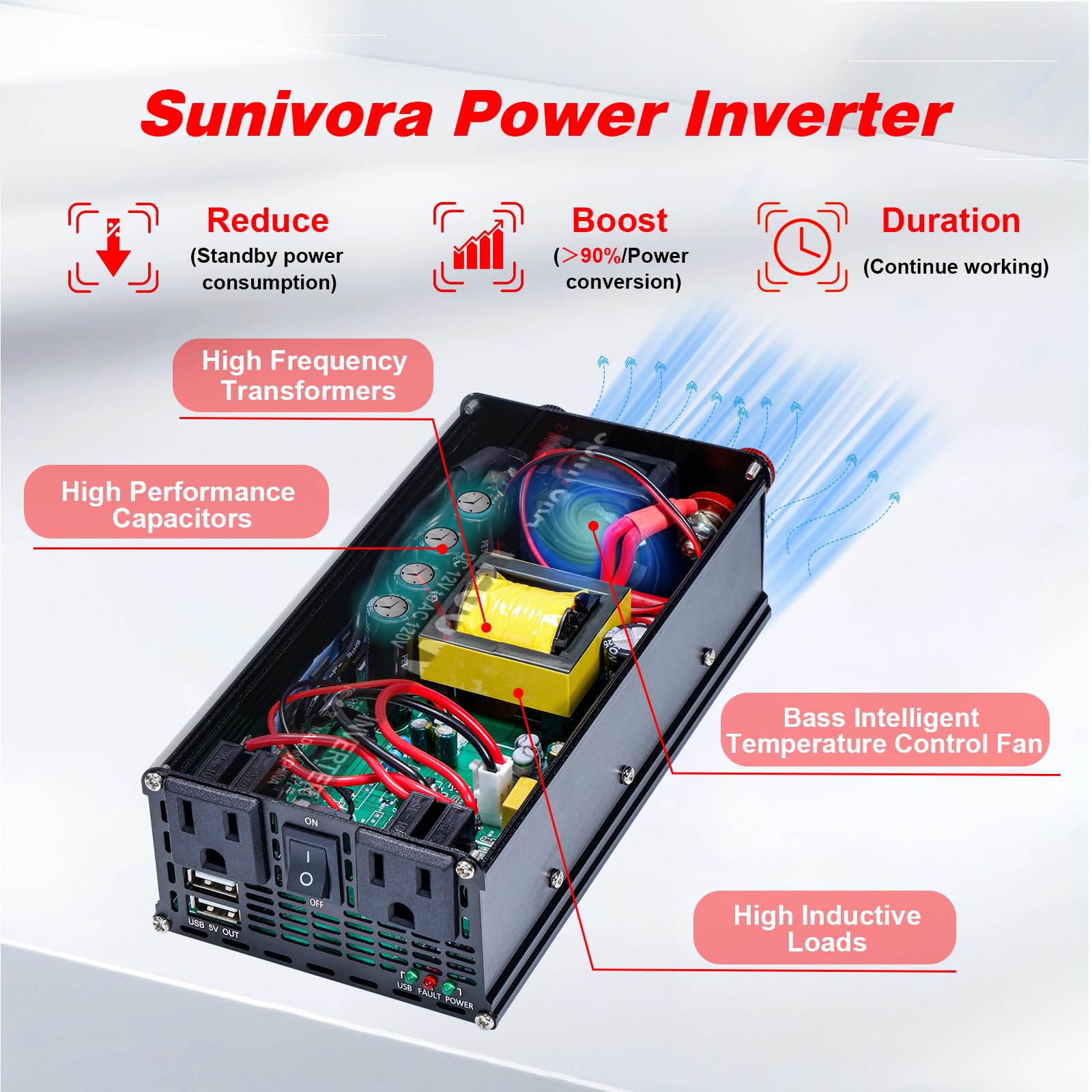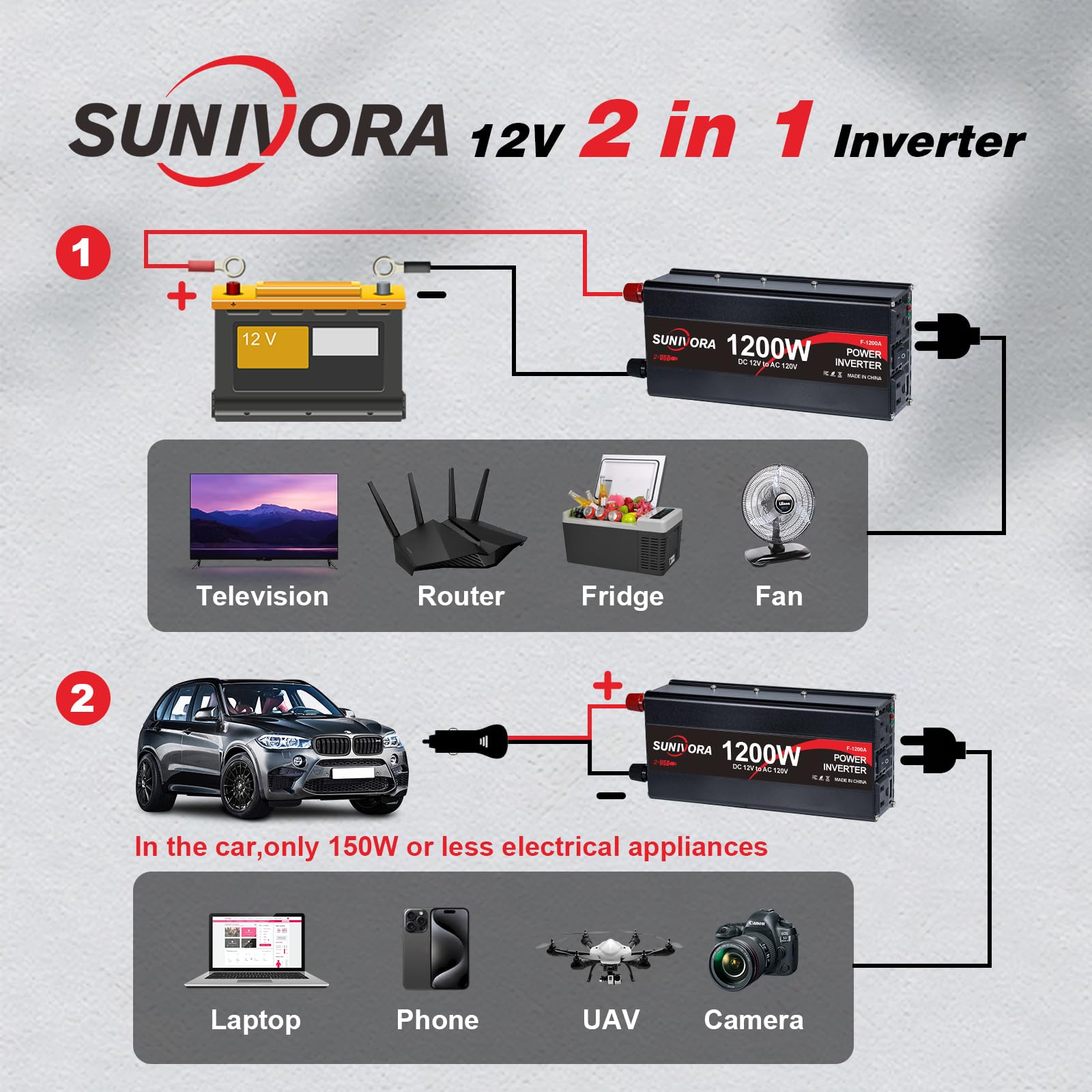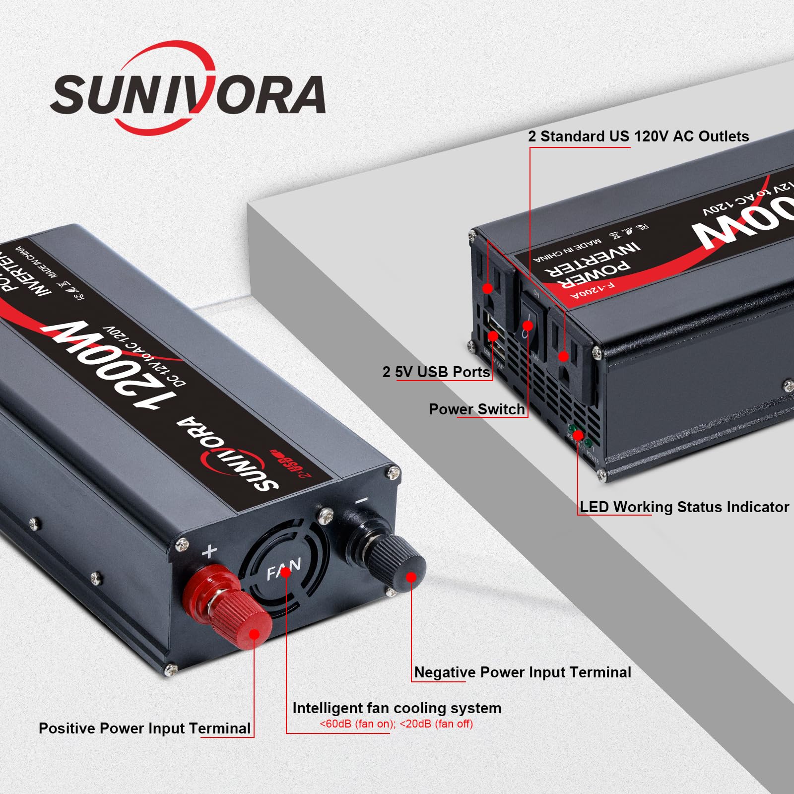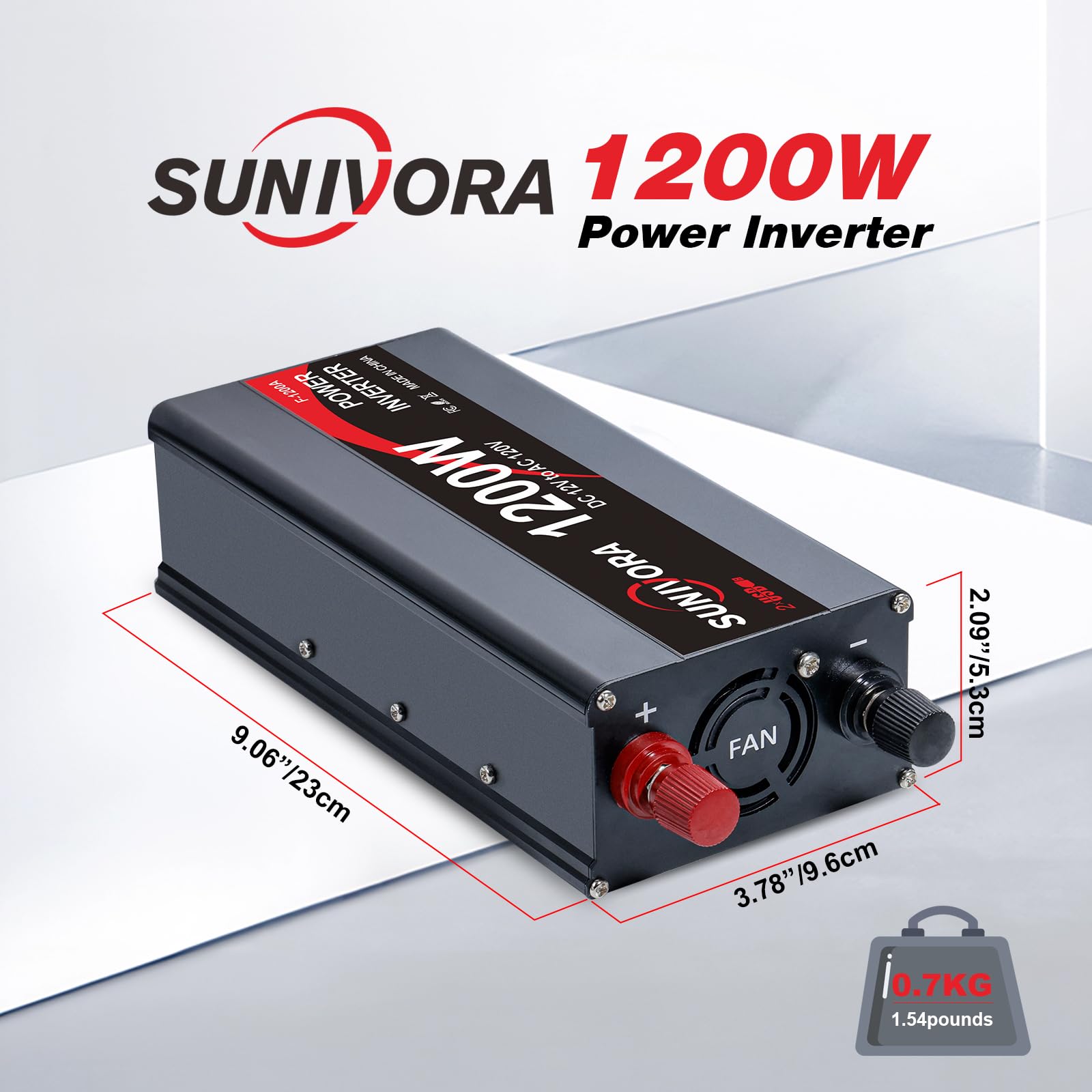 【What You Will Get】: Sunivora 1200W Power Inverter with 20-inch cigarette lighter plug,1 set of battery cables (1x red, 1x black), user manual, 12-month warranty, and friendly customer service. If you aren't satisfied with the product, please feel free to contact us, and we will solve it for you in the first time.