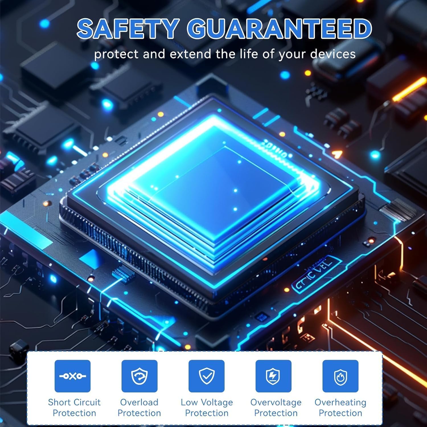 【Intelligent Protection System】: Built-in intelligent chip protects the inverter, electrical equipment, car battery, etc. There are over-voltage protection, overload protection, over-temperature protection, under-voltage protection, and short-circuit protection. When you see the indicator light shows red, don't be anxious, this is the protection mechanism is activated.
