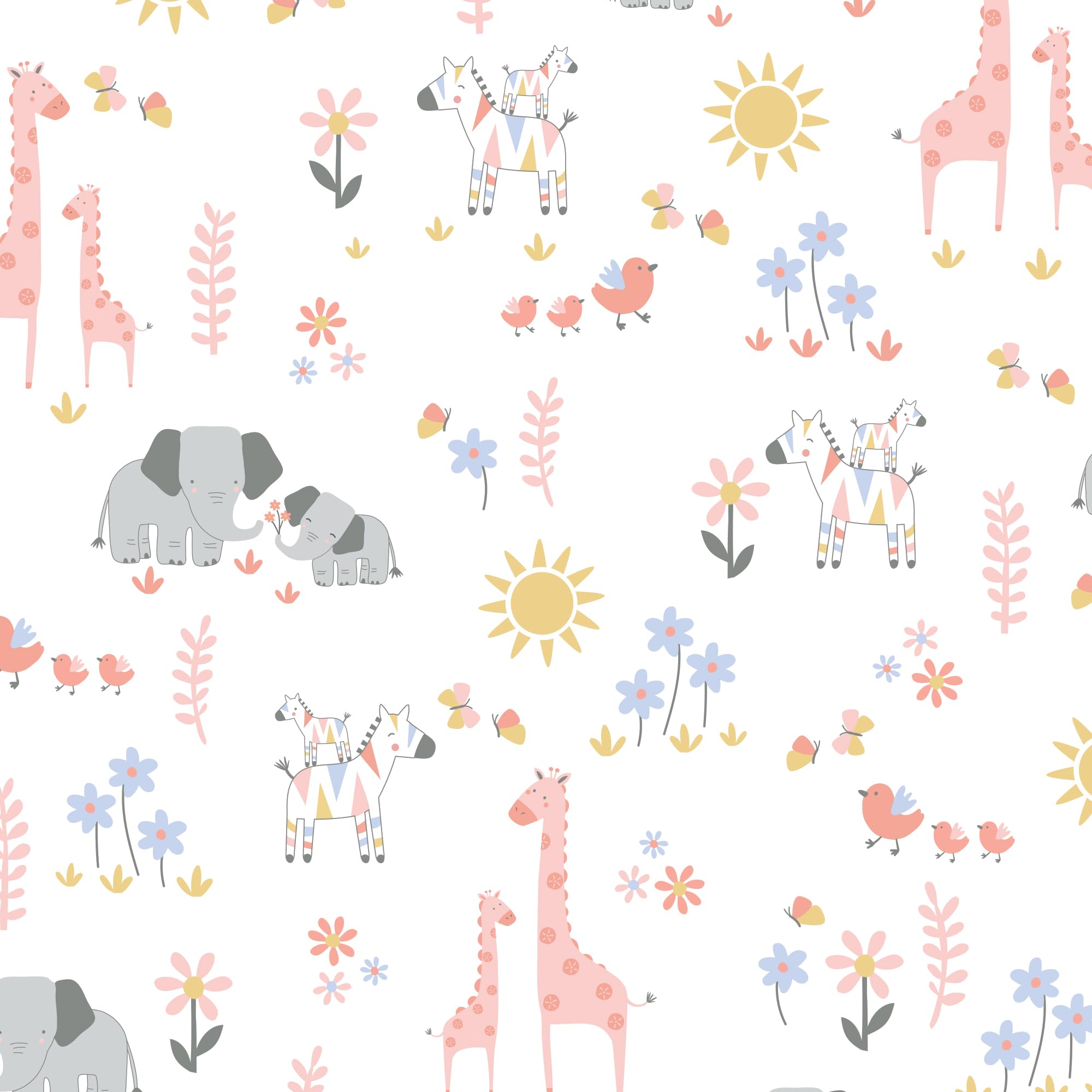 Features mommy and baby jungle animals along with butterflies, plants, and scattered wildflowers