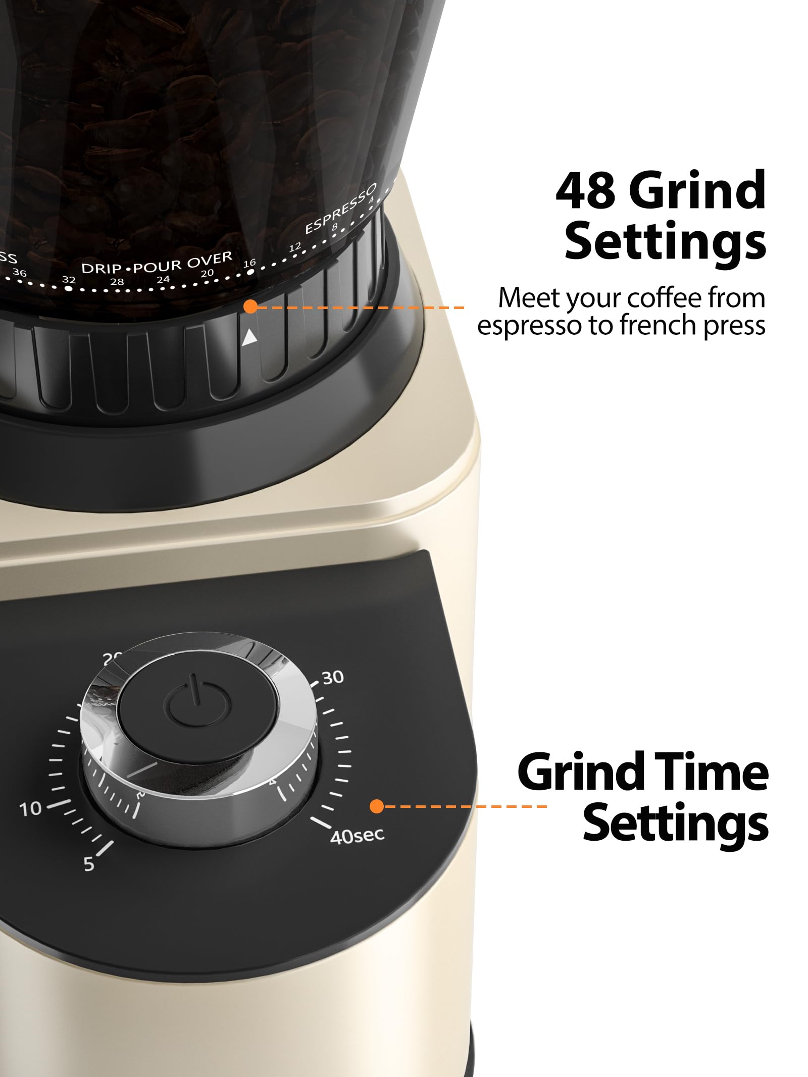 48 Grind Settings and Large Capacity : The Aromaster electric coffee grinder offers 48 different settings, from fine espresso to coarse French press. The timer allows you to adjust the amount of coffee powder, and the large chamber can grind up to 3.9 ounces, perfect for families and offices