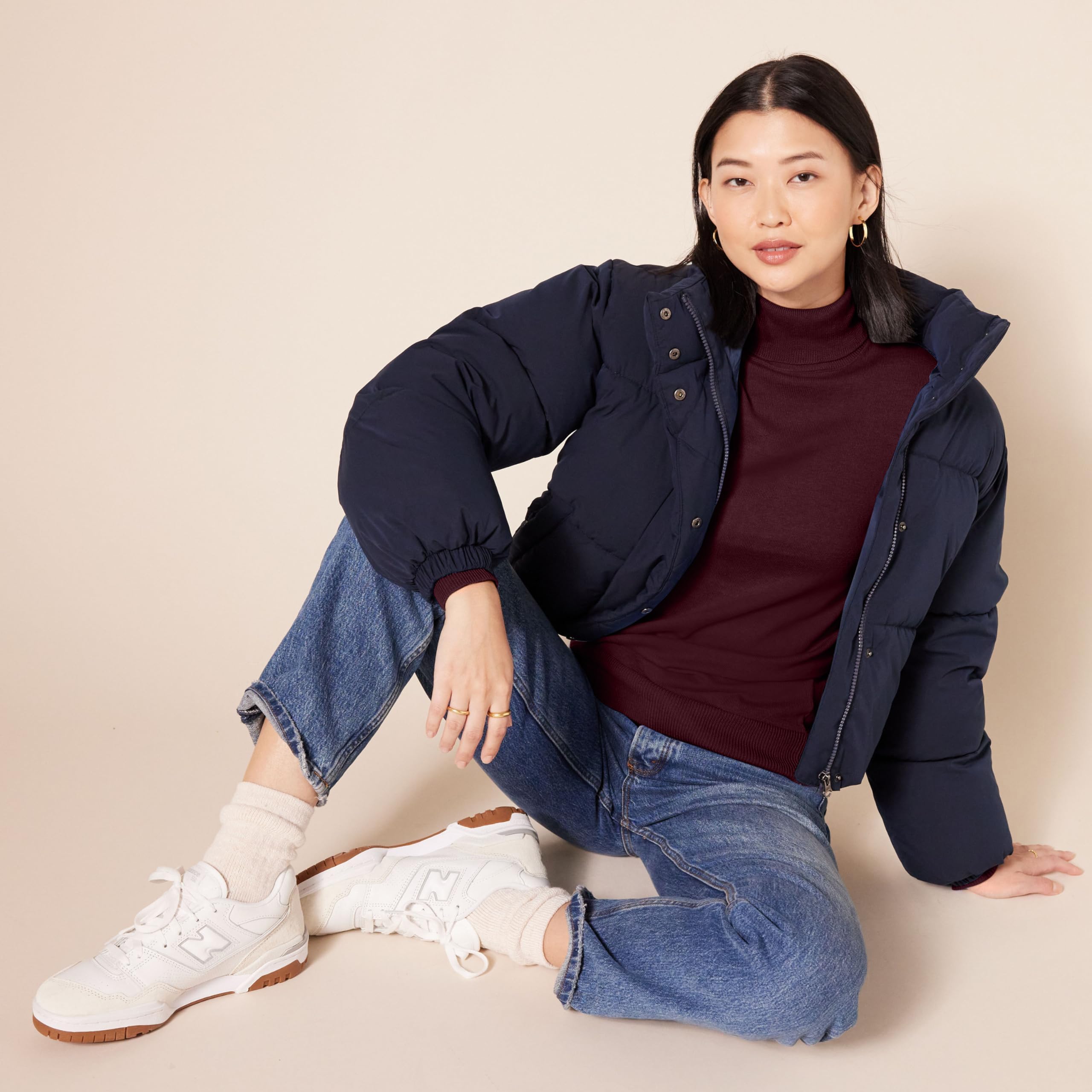 DETAILS: Features a fold-over turtleneck, rib detail at neck, cuffs, and hem.