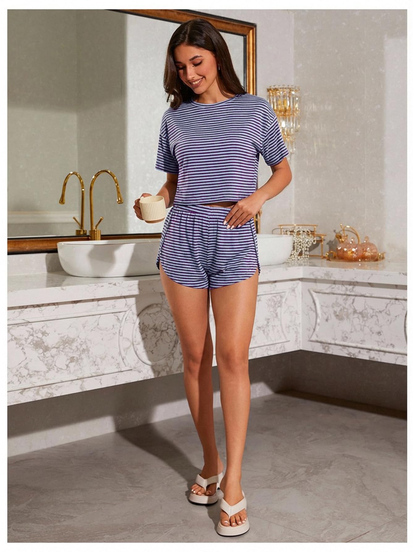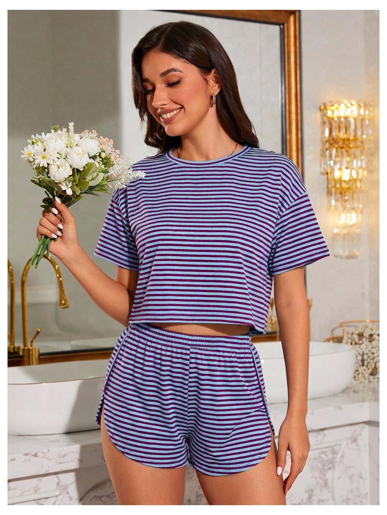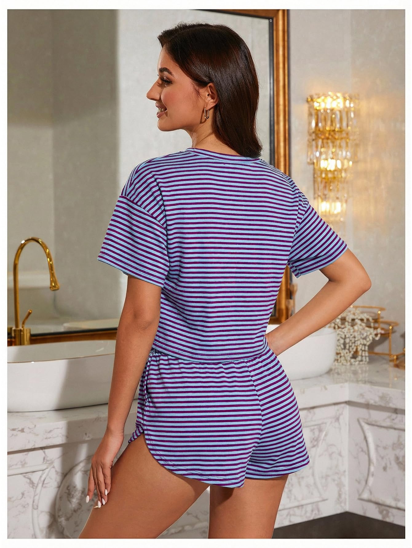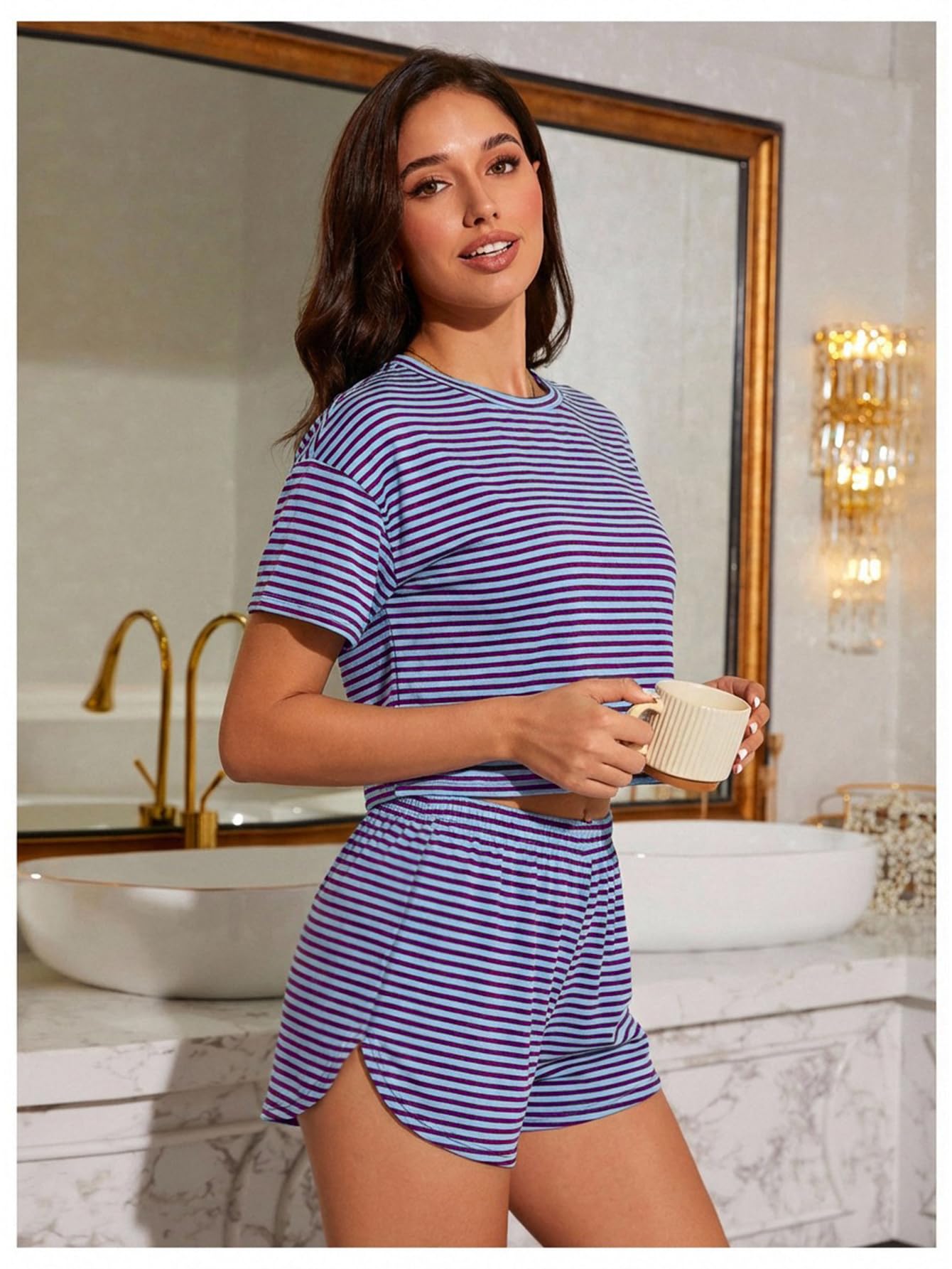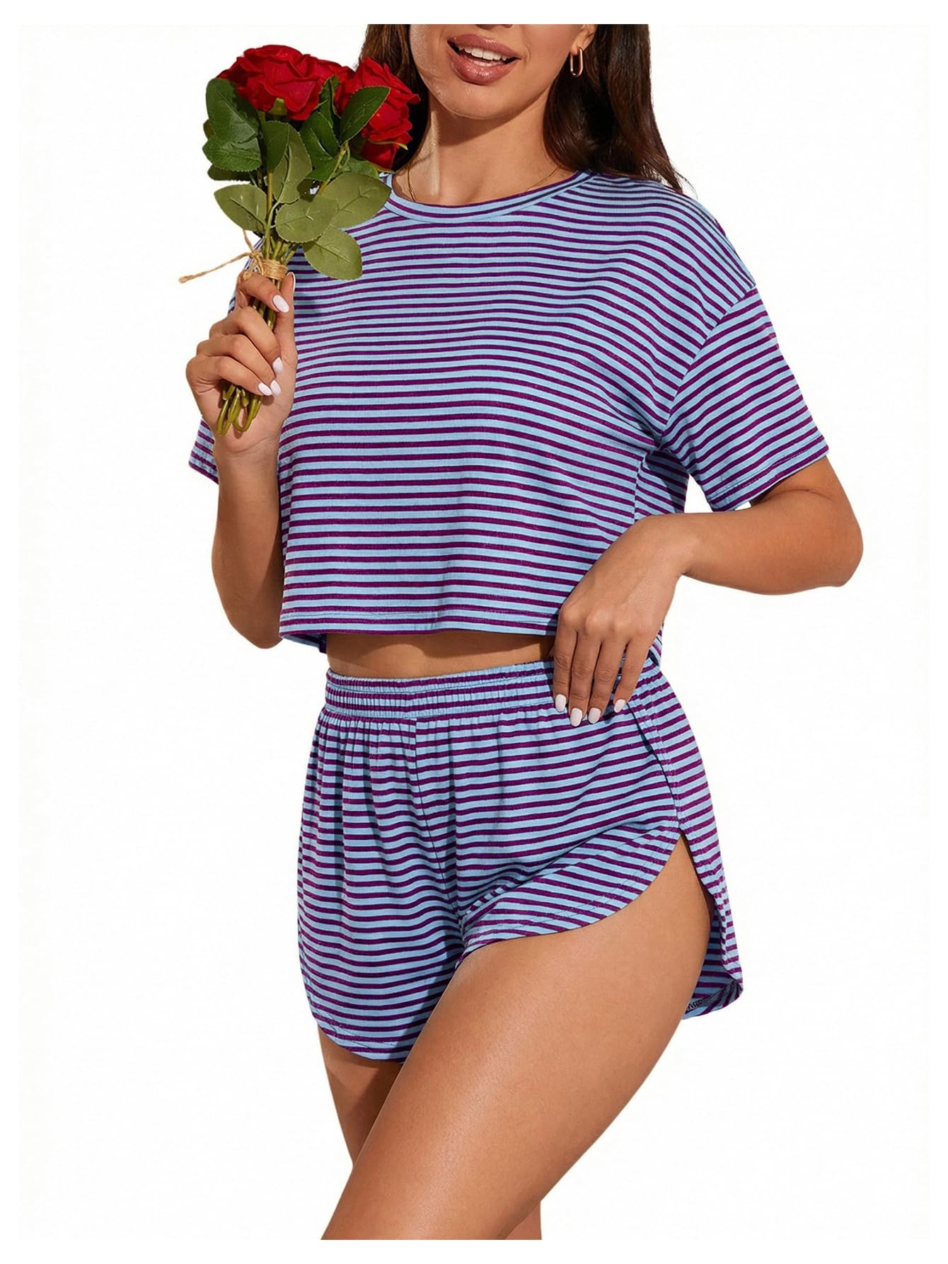 Design: Striped print, short sleeve, crew neck, drop shoulder tee, elastic waist, side split shorts pajama set for women