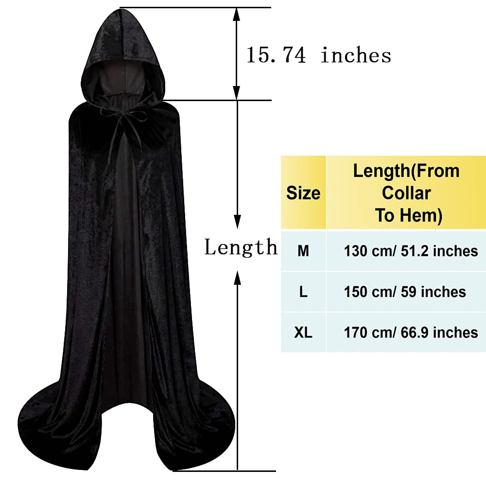 Description Tips: Please carefully check the size chart below before placing your order and choose the size that suits you. If you are unsure of the size, you can email us your height, we can help you choose the right size. In addition, all the clothes are measured by hand flat, please allow 1-2cm error, thank you for your understanding! Specifications: Size XL: Length 170cm /66.9 inches, fit For height 74.9-82.7inch / 190-210cm Size L: Length 150cm /59 inches, fit for height 66.9-74.9inch / 170-190cm Size M: Length 130cm /51.2 inches, fit for height 59.1-66.9inch / 150-170cm Package Included: 1 x Unisex Full Length Hooded Robe Cloak Long Velvet Cape Cosplay Costume