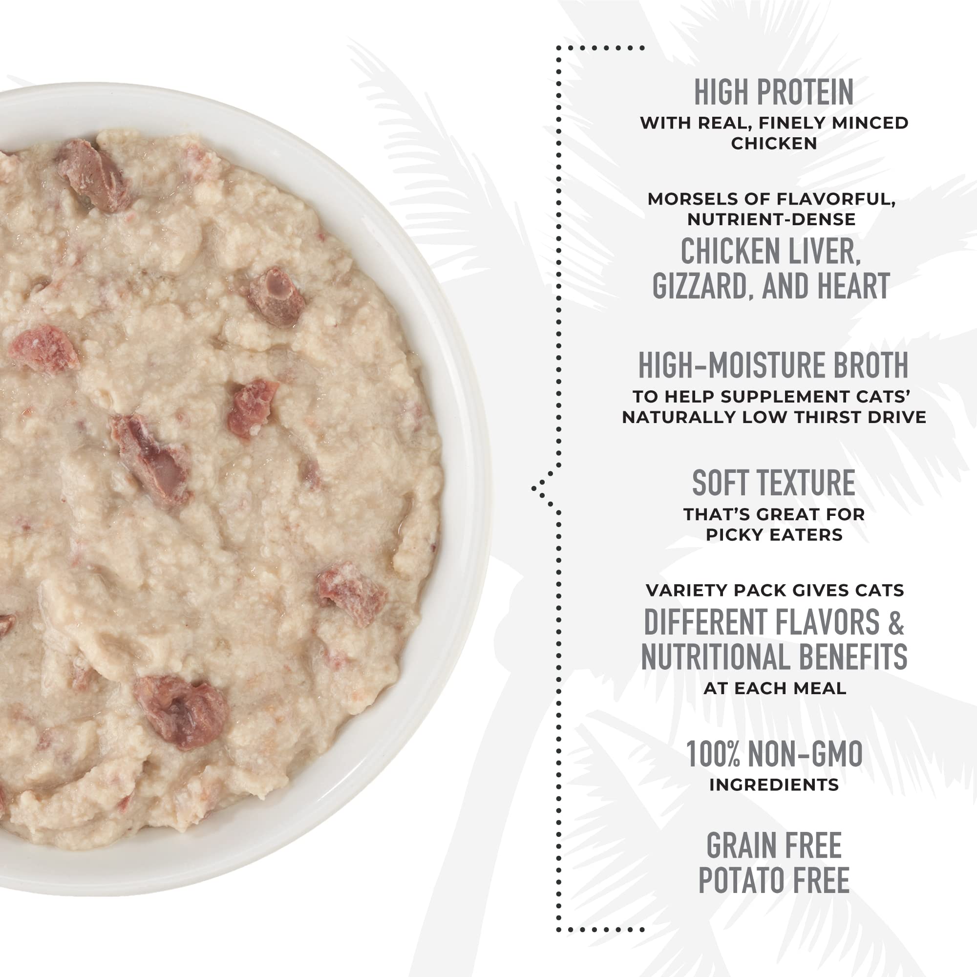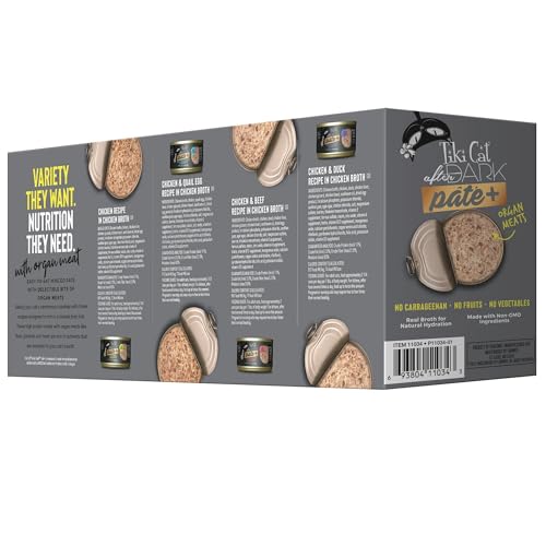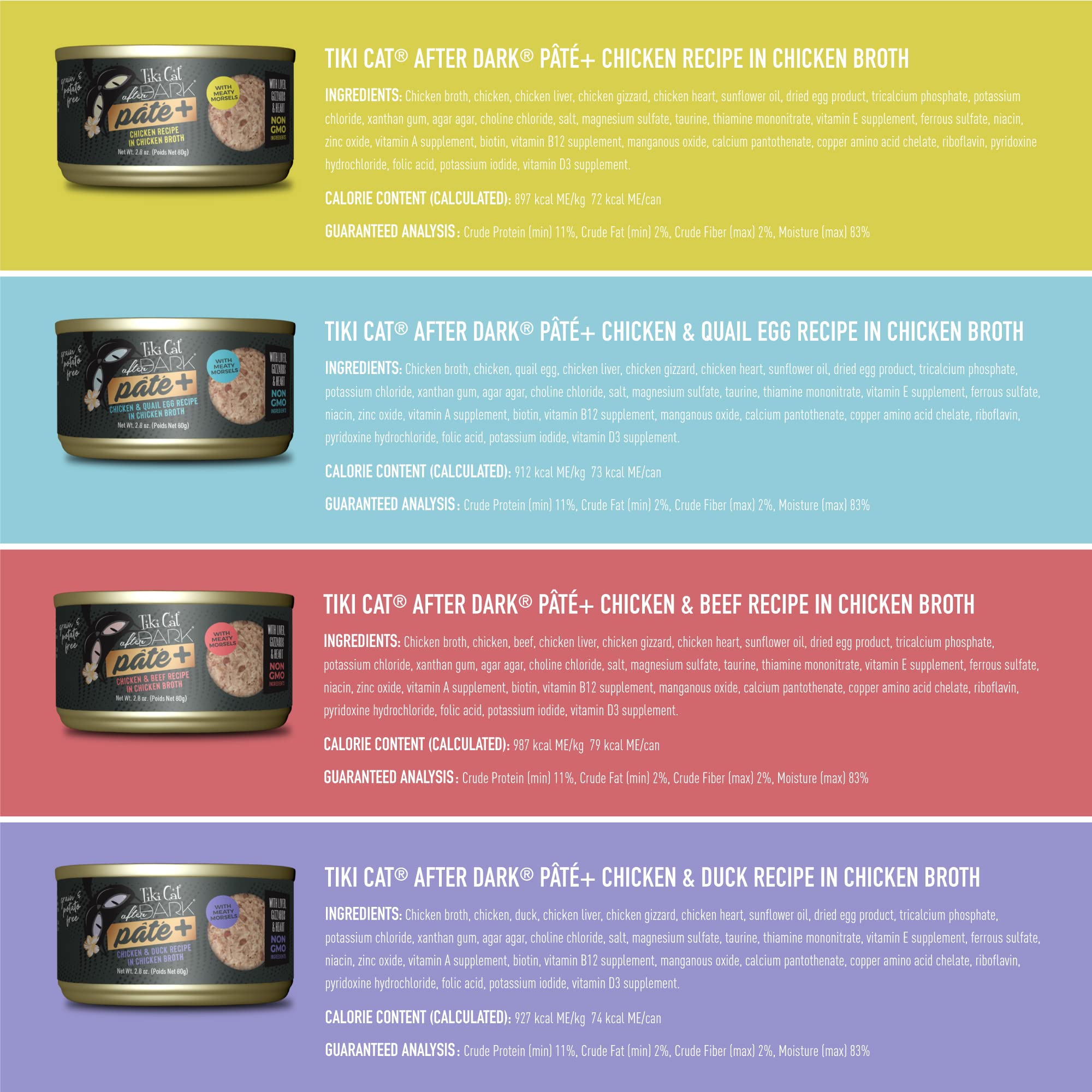 As obligate carnivores, cats have a natural instinct to hunt after dark and a nutritional need to eat meat. Tiki Cat® After Dark® Pâté+ is a meat-lover’s dream, closely mimicking cats’ natural prey diets. Real, finely minced chicken is combined with duck, beef, or quail egg - plus meaty morsels of organ meat - in savory broth for a soft, meaty meal cats love. Treat your carnivore cat to four favorite After Dark Pâté+ recipes in this exciting Variety Pack!