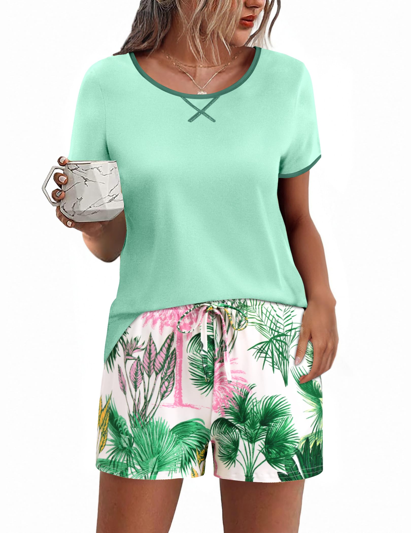 Two Piece Pajama Set: Top- with Round-neck,short sleeve,stylish color block, Pj Short- with Elastic waist,classic plaid & print,which suitable for every age group. Nice design Short Pajama Set for a relaxing day and night