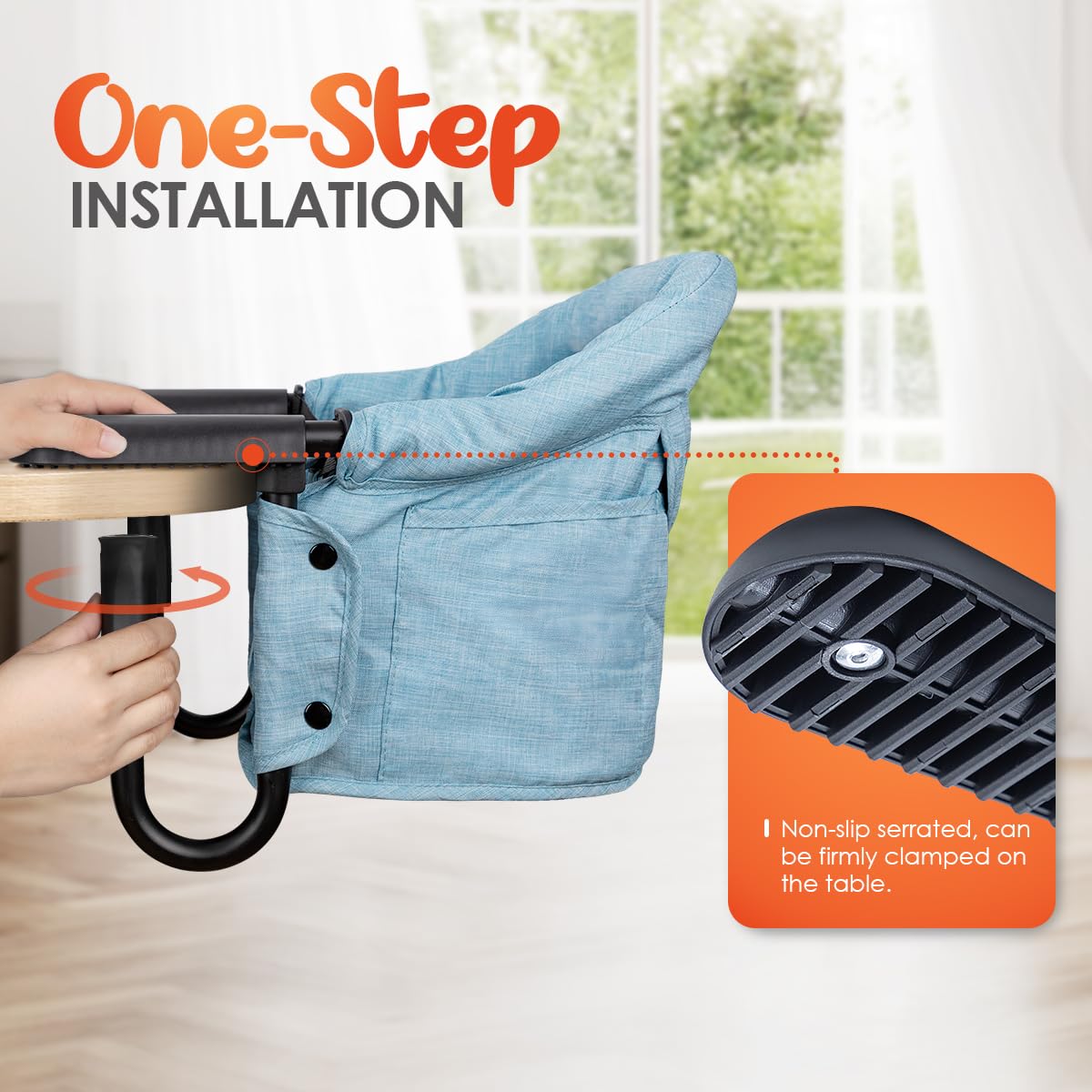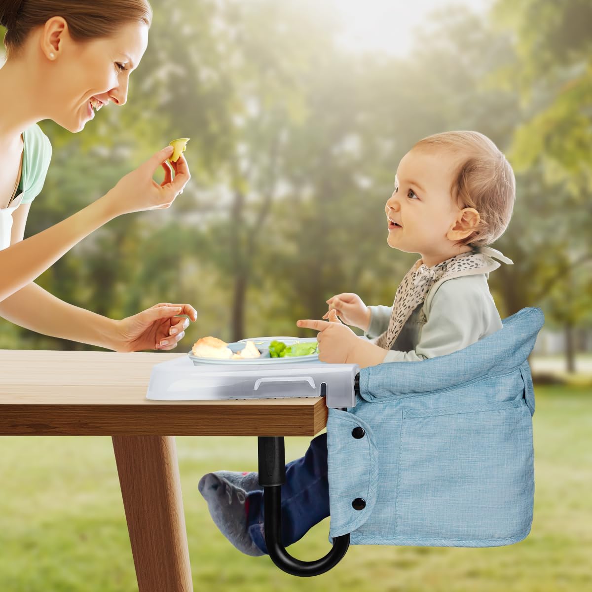 【Portable Hook-On Chairs with Tray】Our portable hook-on chairs is designed to be compatible with most types of tables ranging from 0.8 inches to 3.3 inches (20-85mm) in thickness,ensuring a secure fit on a wide variety of tabletop surfaces.It comes equipped with a convenient detachable feeding tray that attaches and detaches with ease,making mealtime a breeze for parents