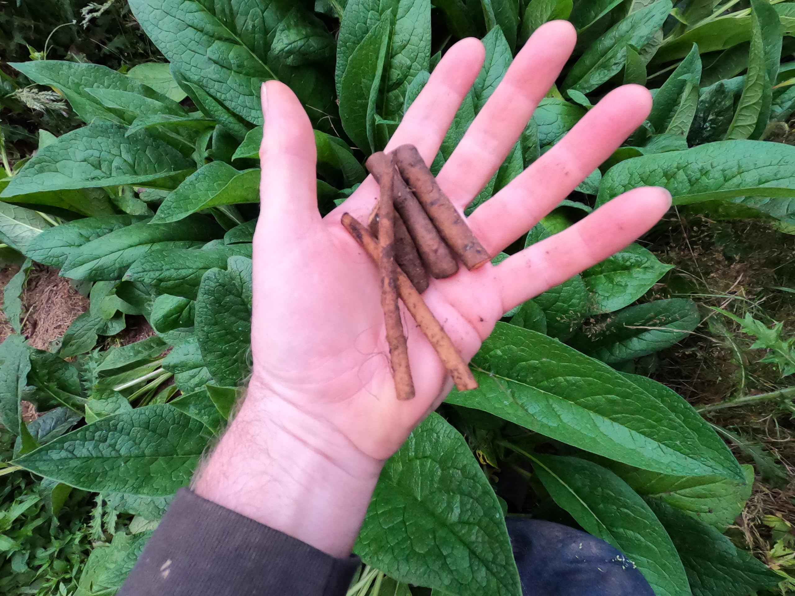 Comfrey root cuttings for starting your own comfrey plants for your garden. Comfrey has long been recognized by both organic gardeners and herbalists for its great usefulness and versatility; of particular interest is the "Bocking #4" cultivar of Russian Comfrey. This strain was developed during the 1950s by Lawrence D Hills, the founder of the Henry Doubleday Research Association (the organic gardening organisation itself named after the Quaker pioneer who first introduced Russian Comfrey into Britain in the nineteenth century) following trials at Bocking, near Braintree, the original home of the organization. Comfrey Directions: Soak in water for at least 4 hours prior to planting. Plant in rich loamy soil or in high quality potting soil in a starter tray. Keep moist (plastic cover for starter tray works well. Keep well lit but away from direct sunlight which will dry the cuttings too quickly. The cuttings with small buds on them will show new growth within 3 weeks. The cuttings without buds can take as long as 8 weeks to show new growth.